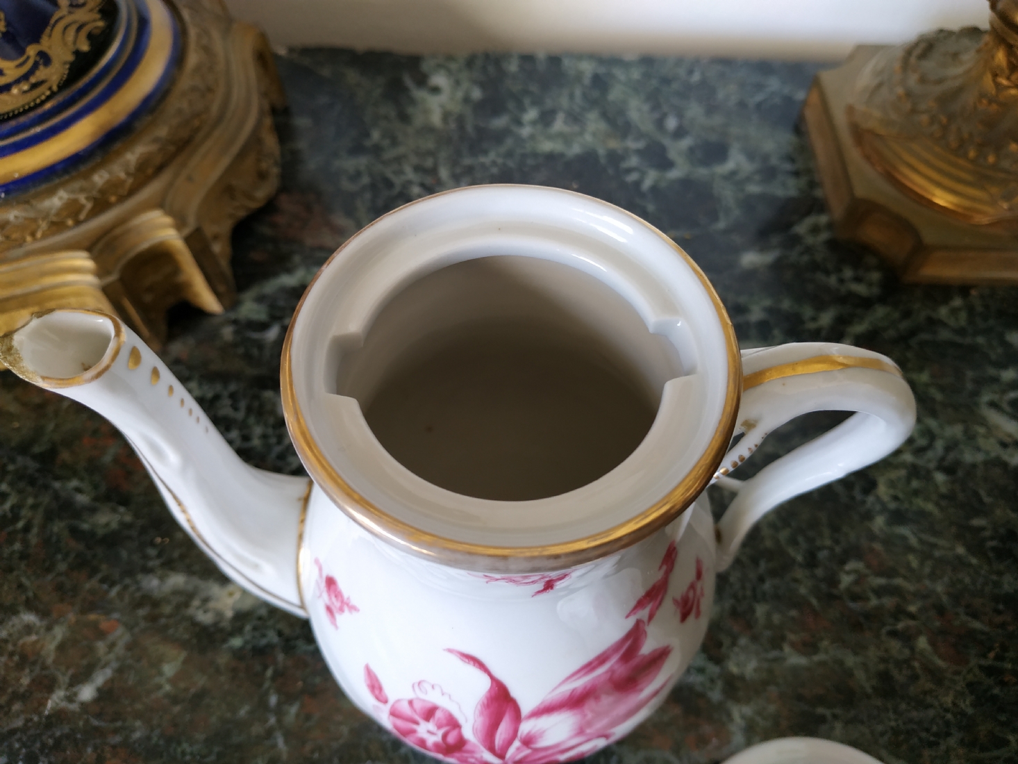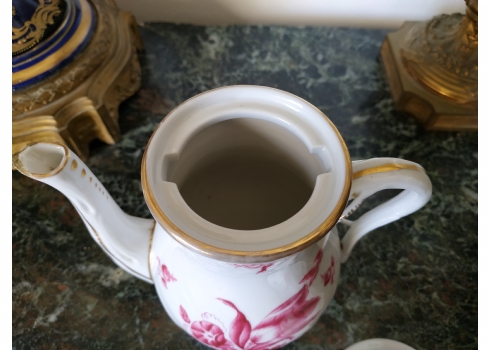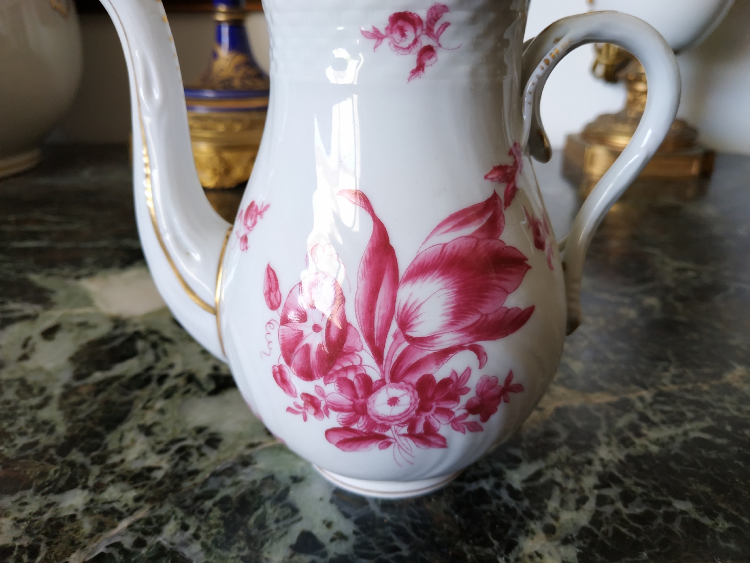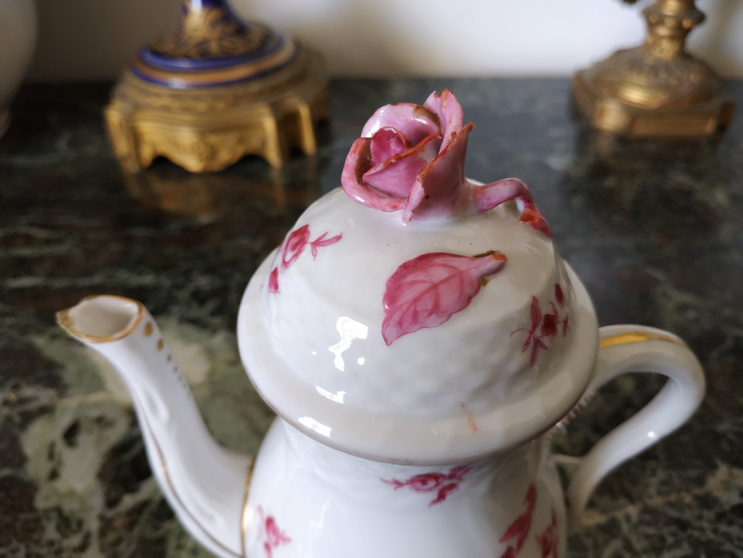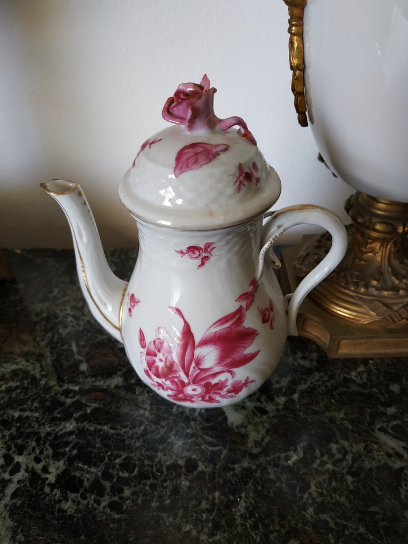 קנקן פורצלן הונגרי איכותי ויפה מתוצרת: 'הרנד' (Herend) ומכסה תואם, מעוטרים ציורי יד באמייל ובזהב, צ'יפ קטן לקצה הזרבובית (מצולם בתקריב), חתום, גובה: 17.5 ס"מ.