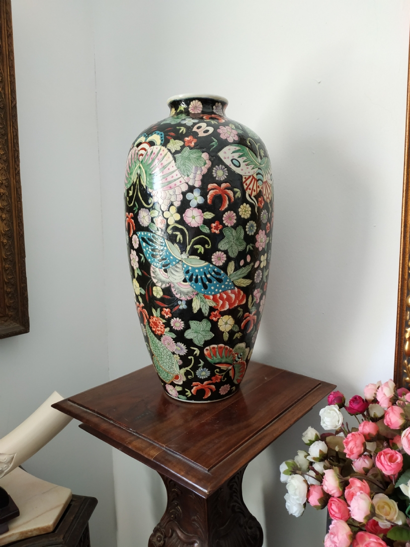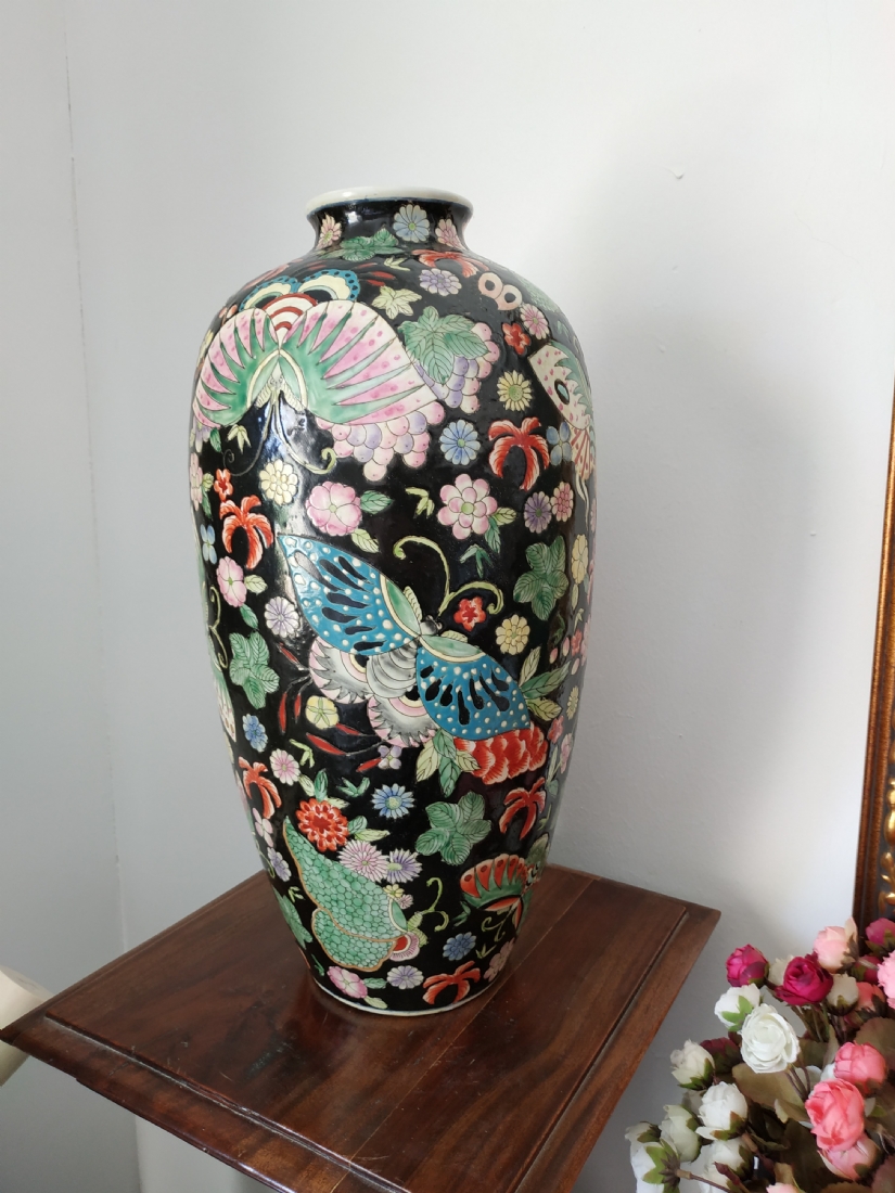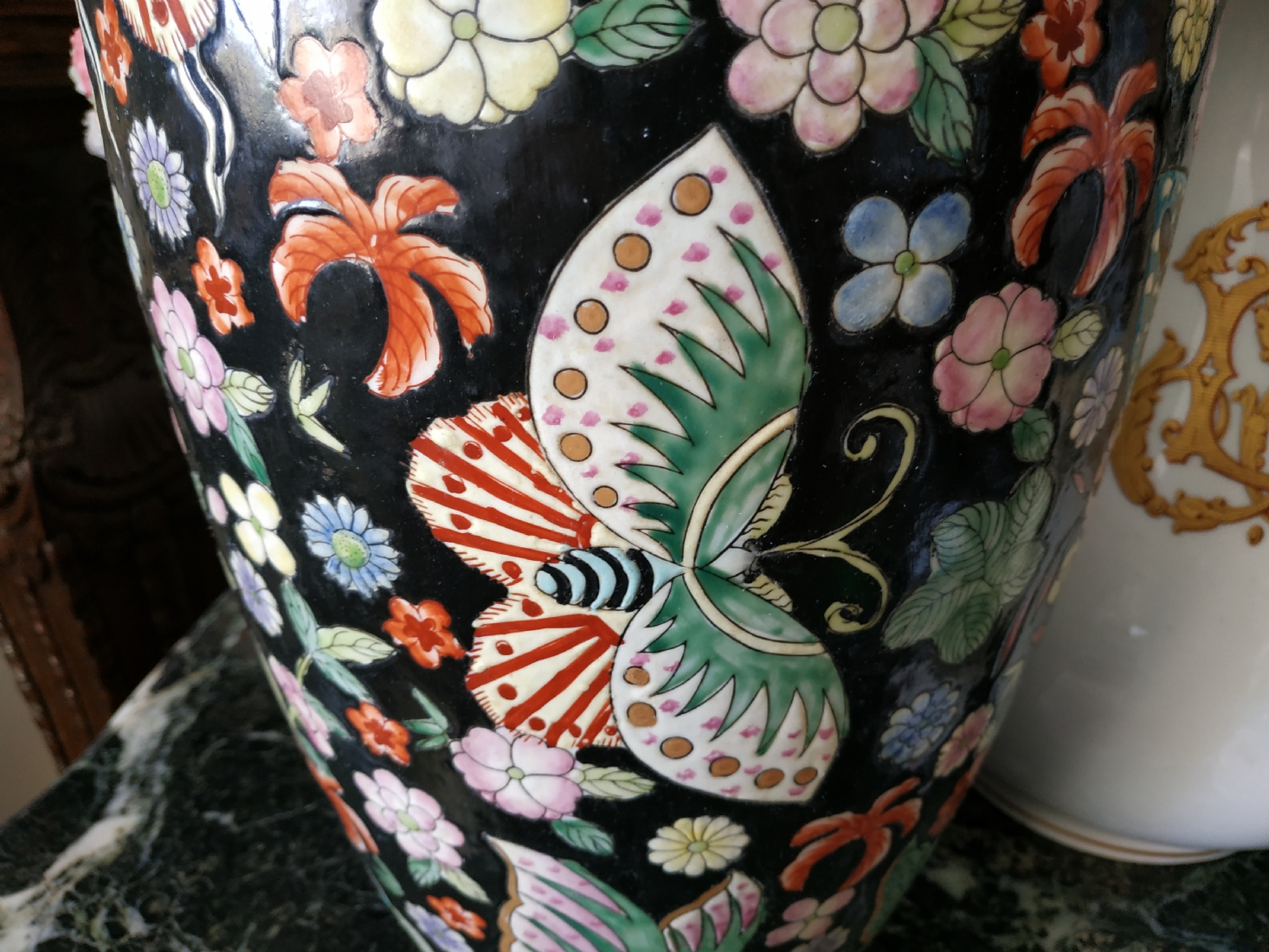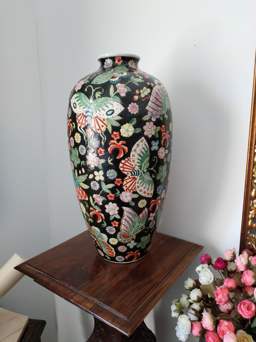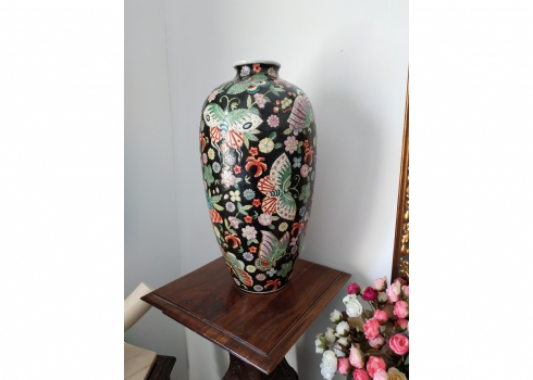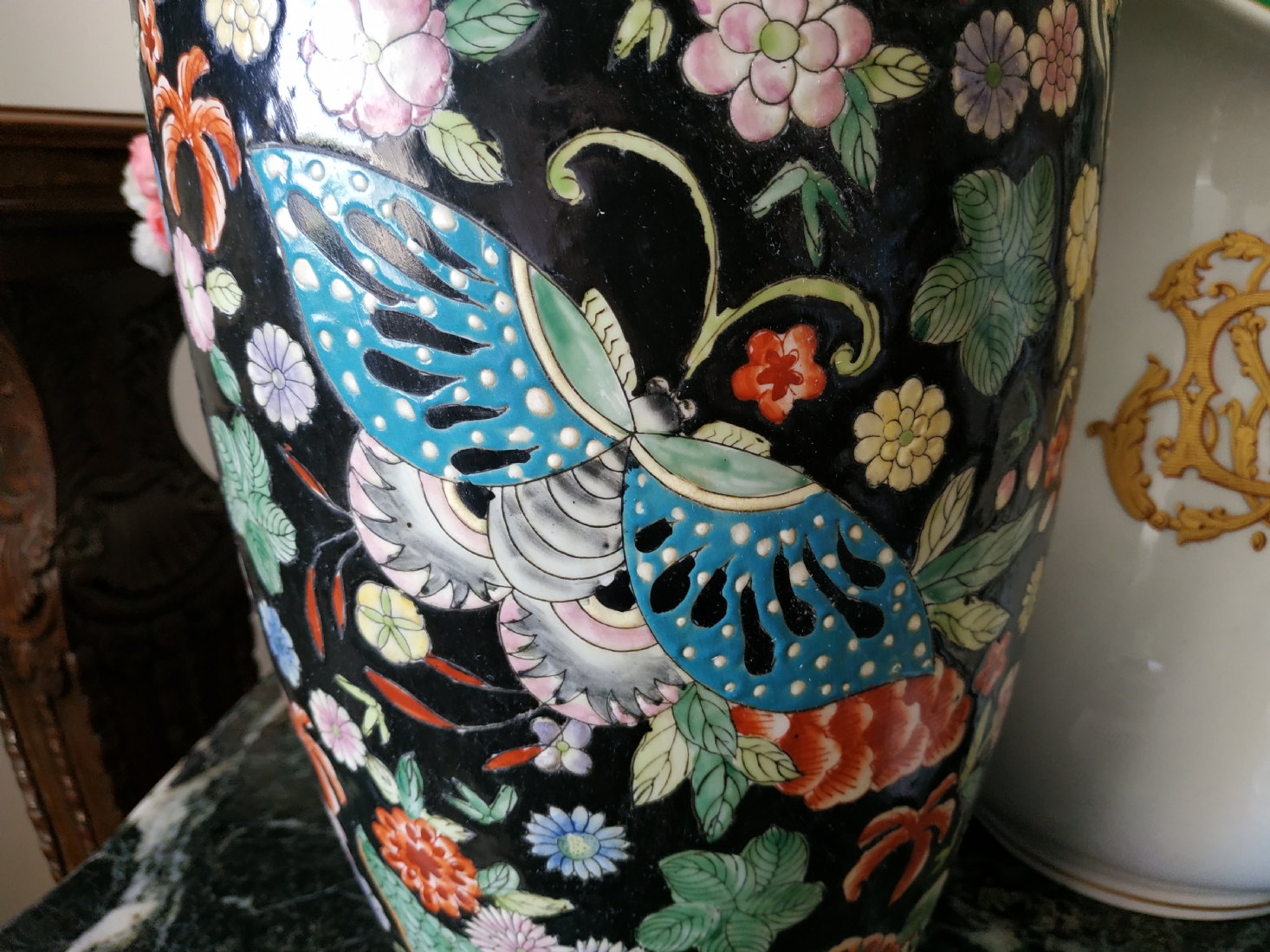 אגרטל סיני דקורטיבי גדול (גבוה), עשוי חרס מעוטר באמייל פוליכרום בדגם פרפרים גדולים, חתום, גובה: 47 ס"מ.