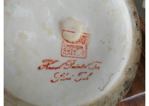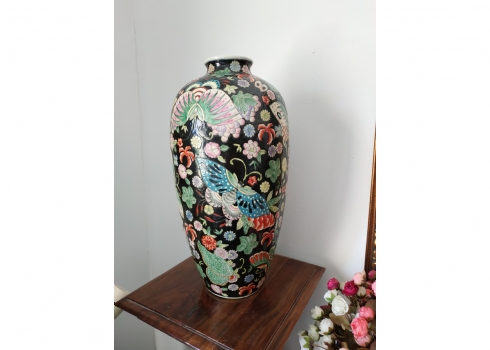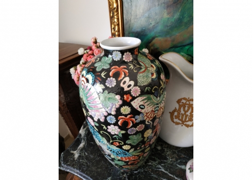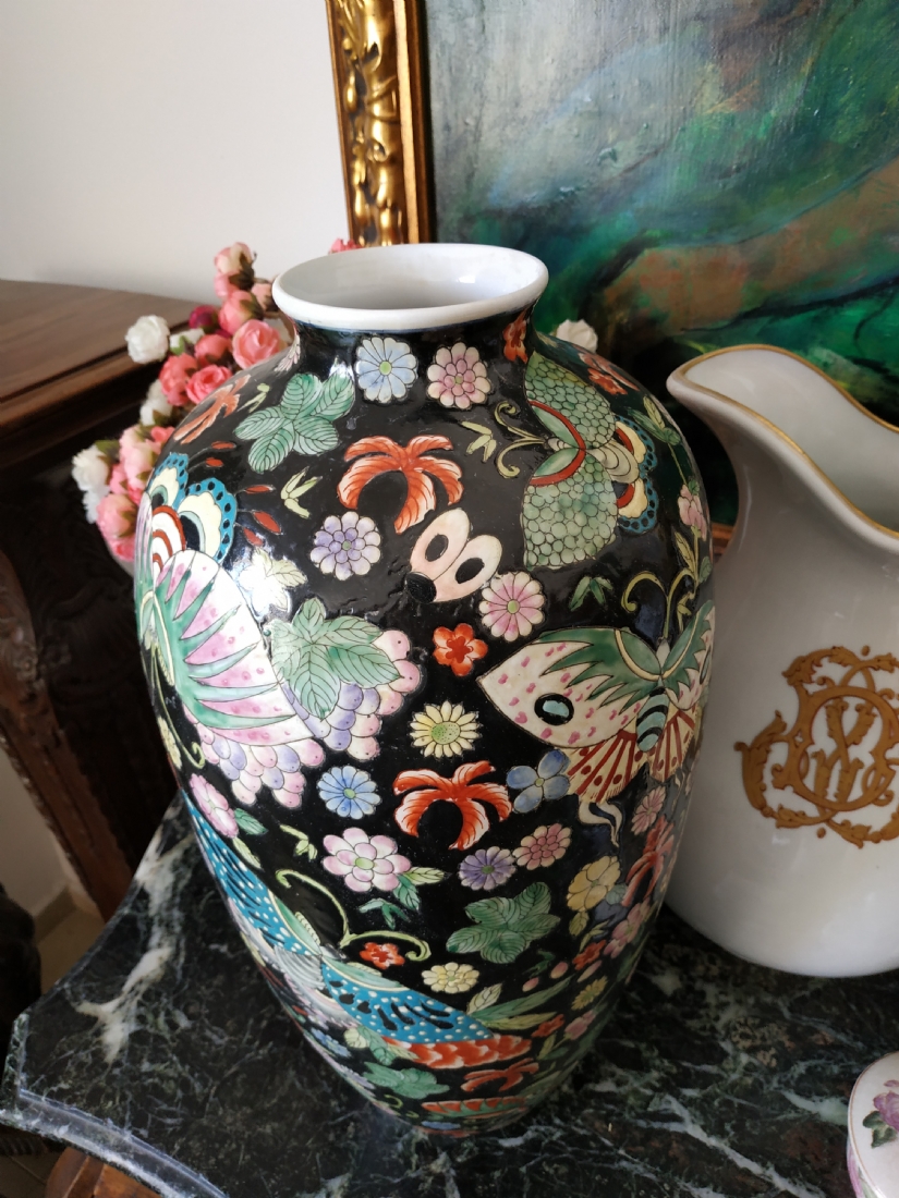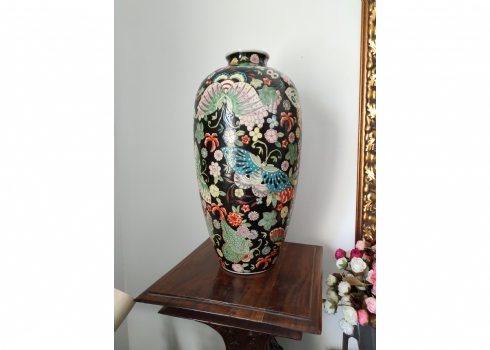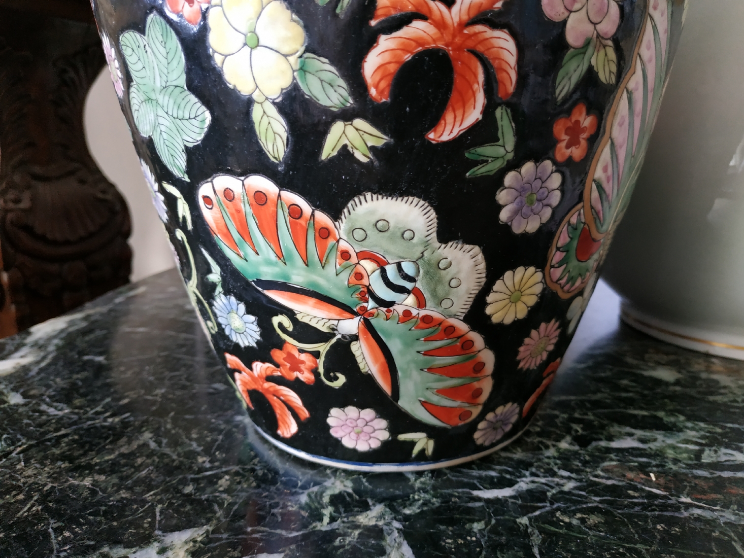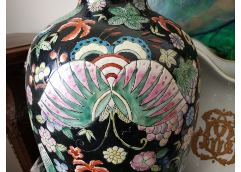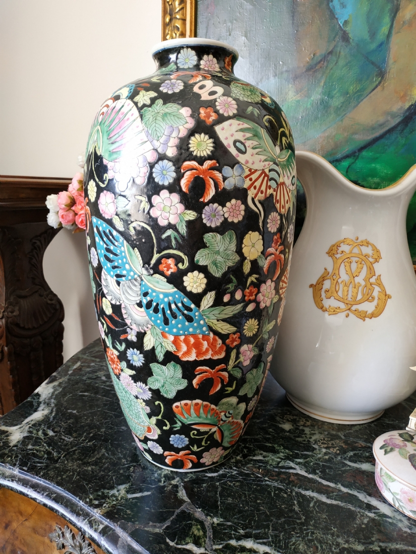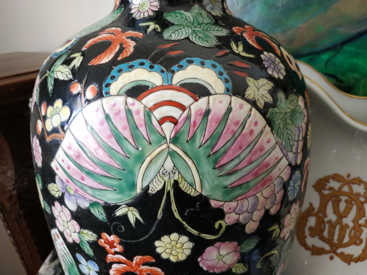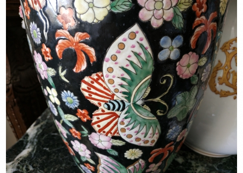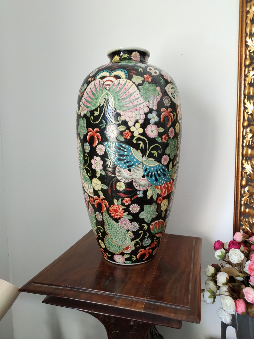 אגרטל סיני דקורטיבי גדול (גבוה), עשוי חרס מעוטר באמייל פוליכרום בדגם פרפרים גדולים, חתום, גובה: 47 ס"מ.