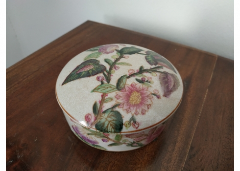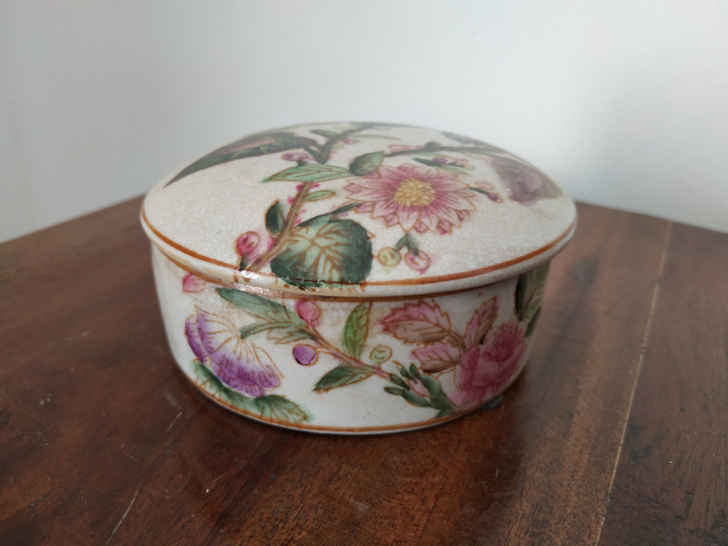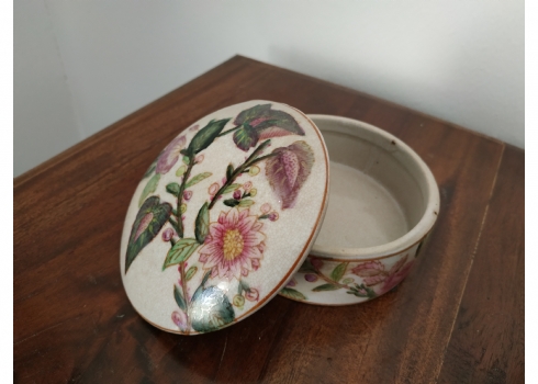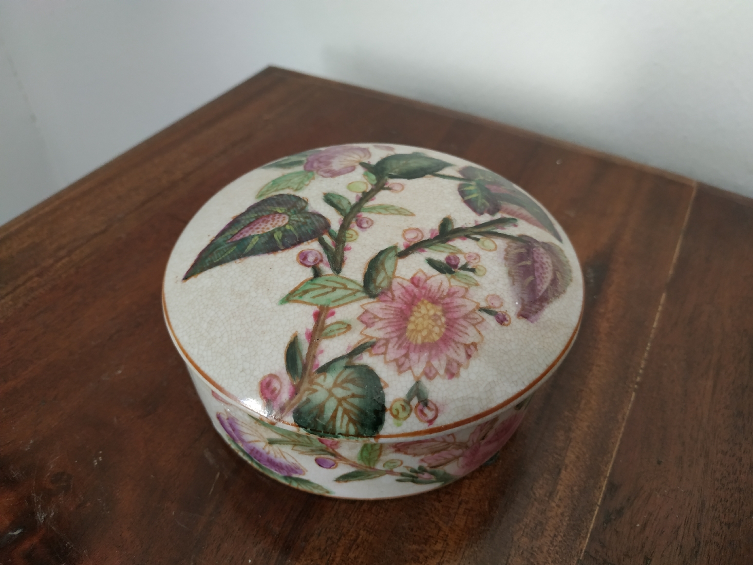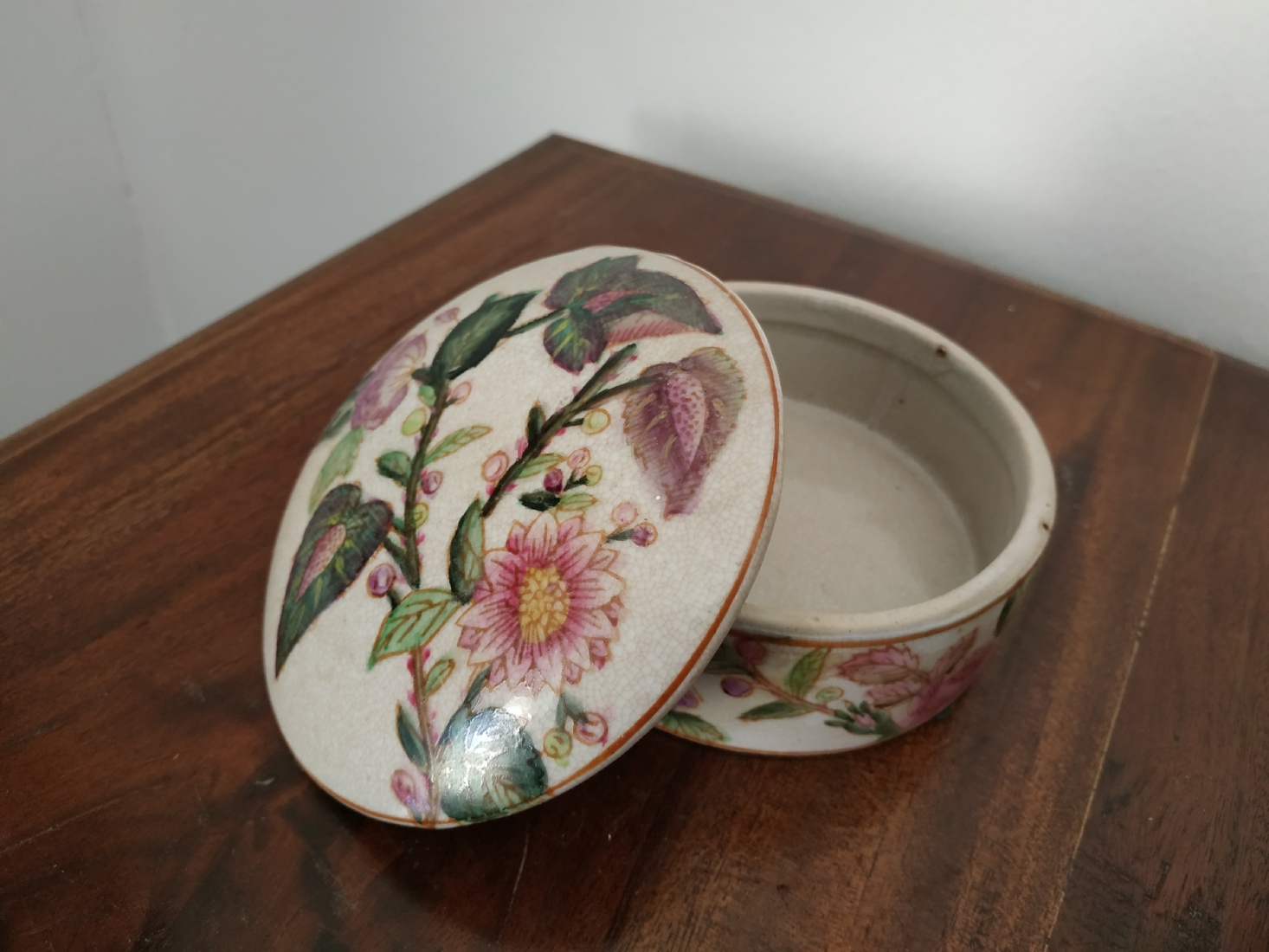 קופסת חרס ומכסה תואם, מעוטרת בדגם פרחים