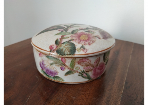 קופסת חרס ומכסה תואם, מעוטרת בדגם פרחים, גובה: 6.5 ס"מ, קוטר: 11 ס"מ.