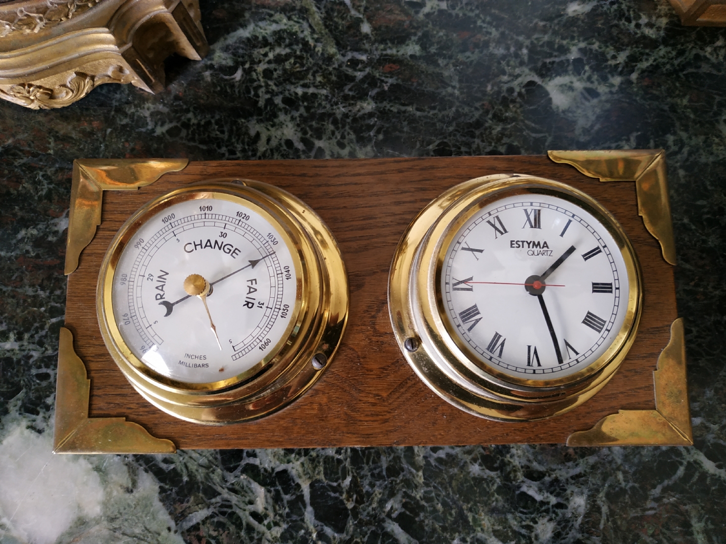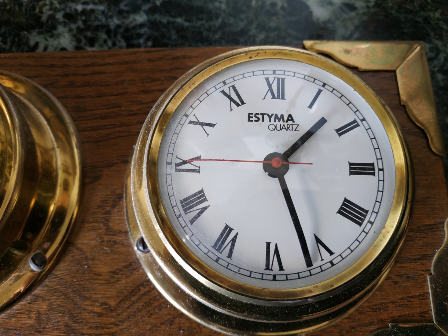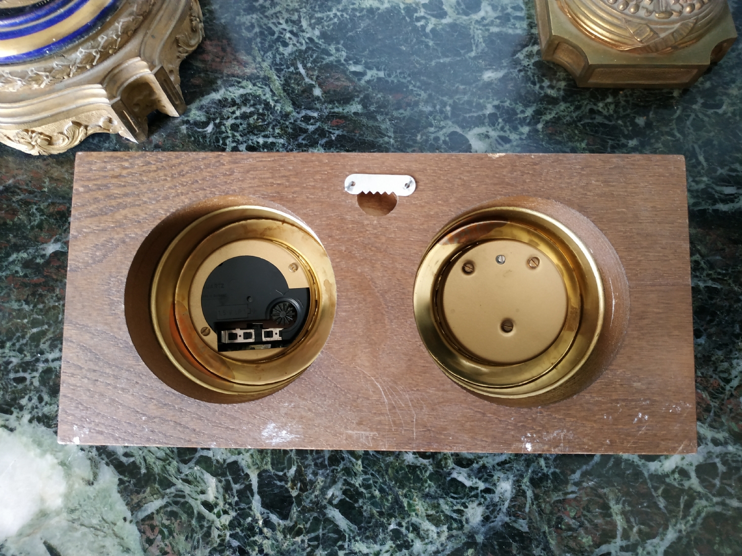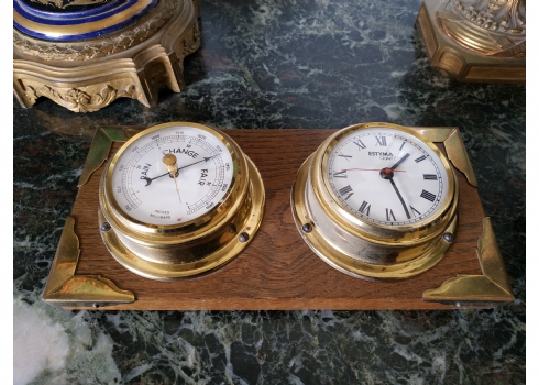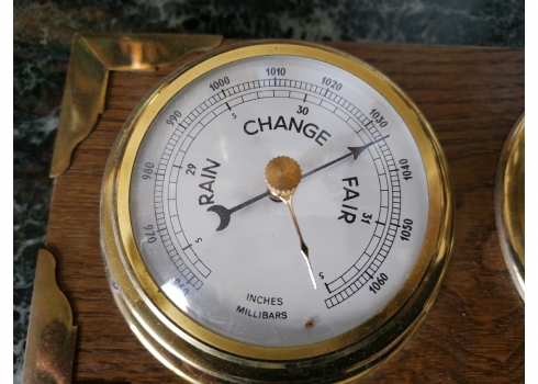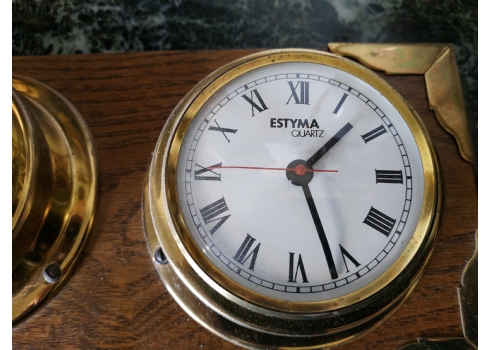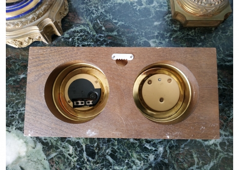 שעון וטרמומטר, לתליה על הקיר, עשוי עץ ופליז