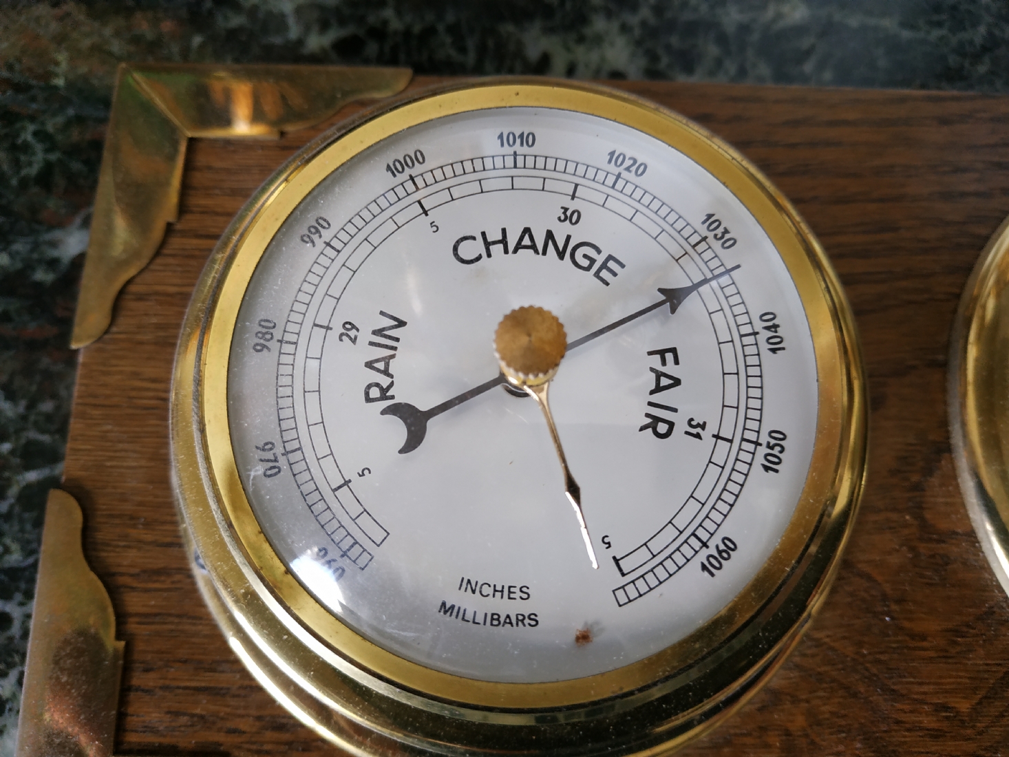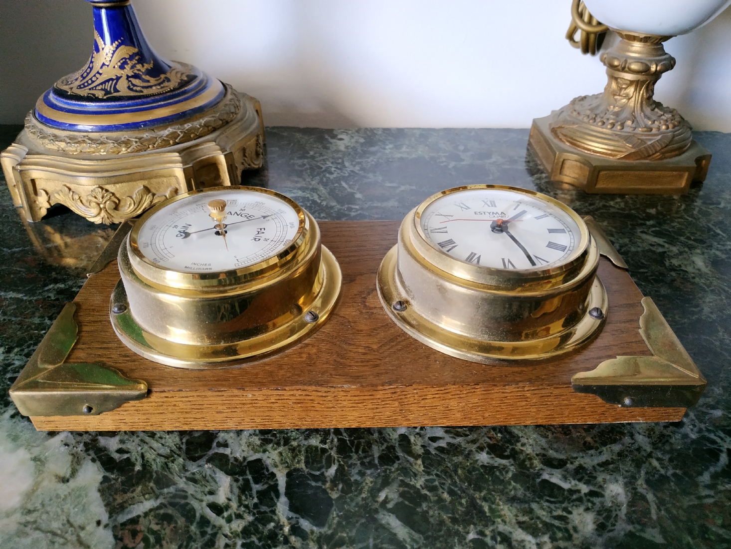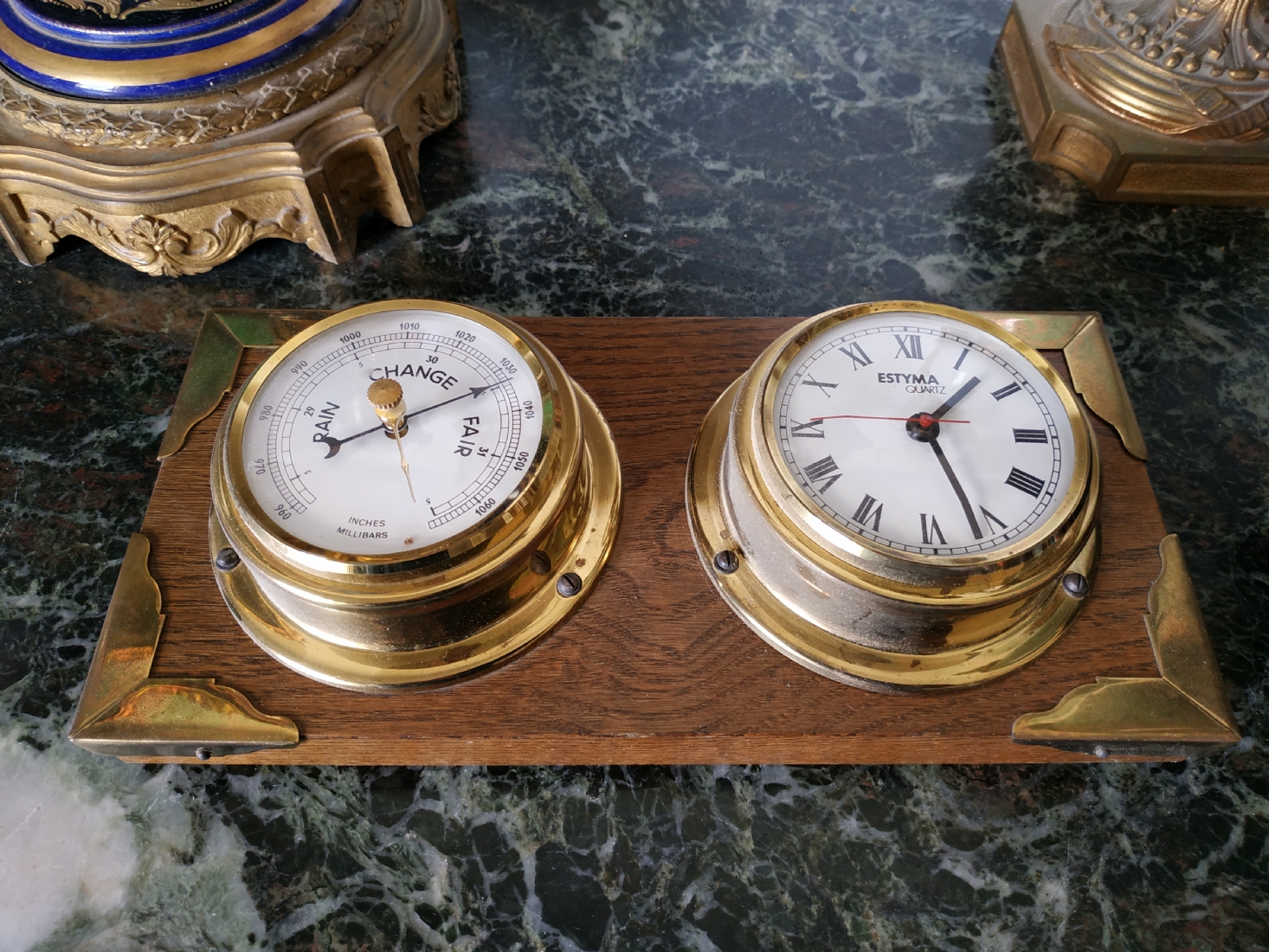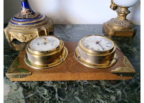 שעון וטרמומטר, לתליה על הקיר, עשוי עץ ופליז