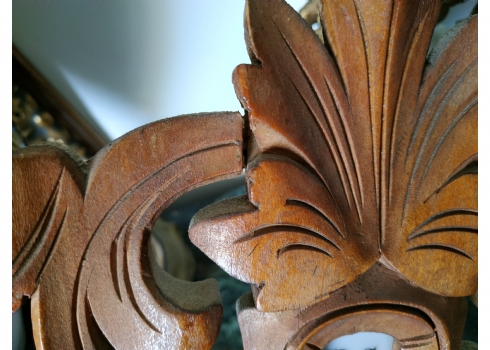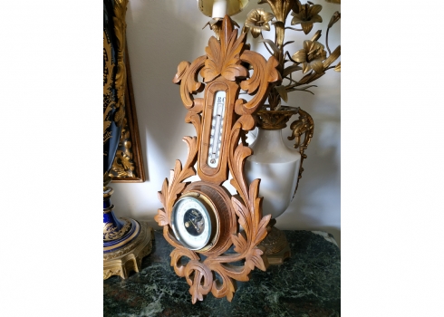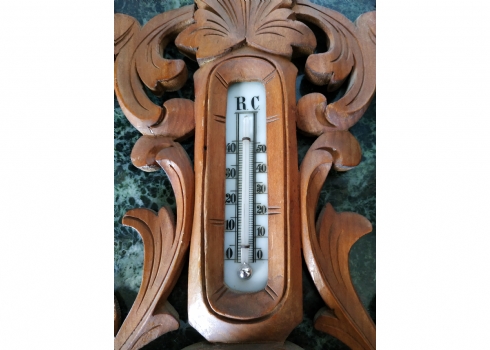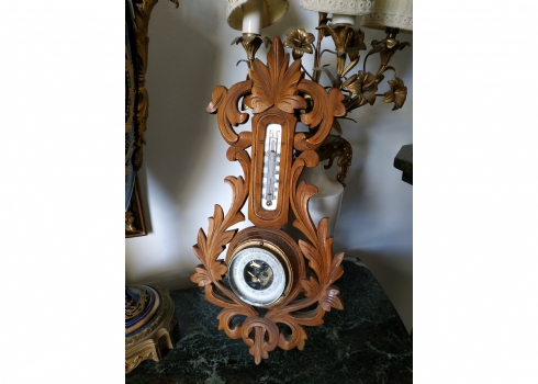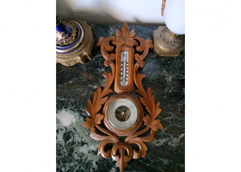 מספר הפריט בקטלוג 145ברומטר וטרמומטר גרמני ישן מהיער השחור לתליה על הקיר, עשוי עץ מגולף (פגם קטן לעץ, מצולם), רוחב: 24 ס"מ, גובה: 47 ס"מ.