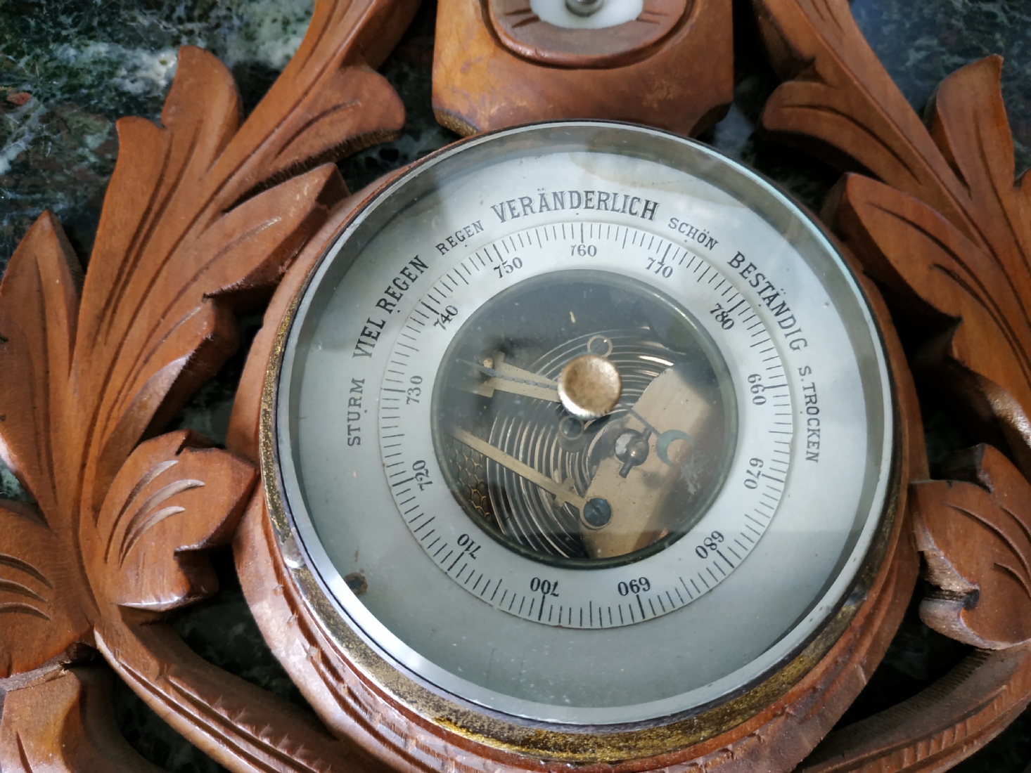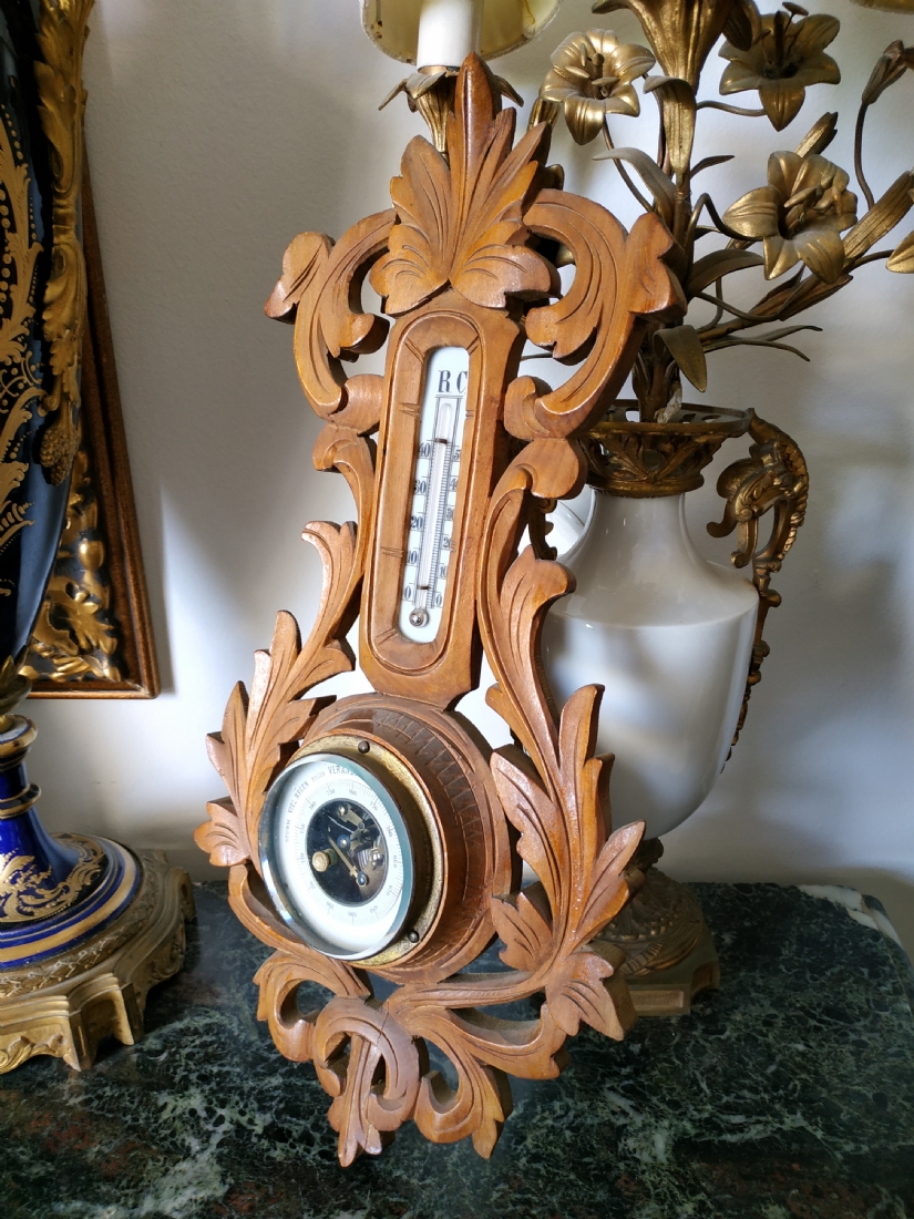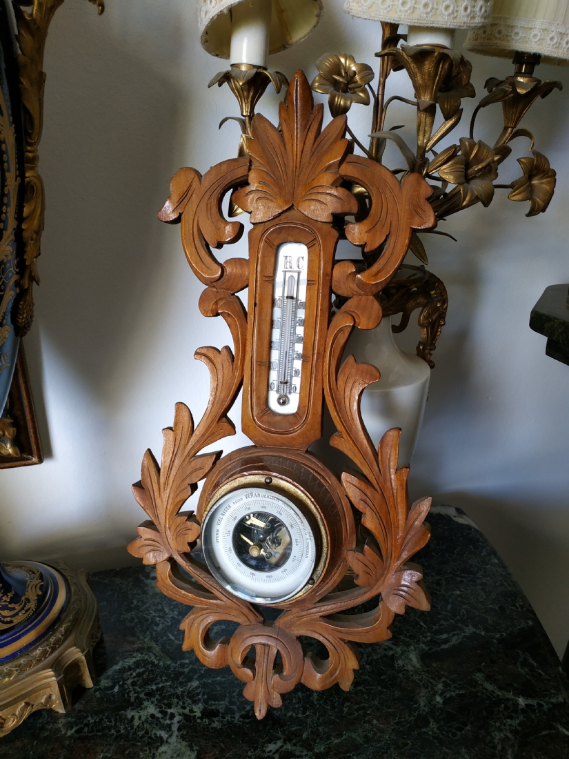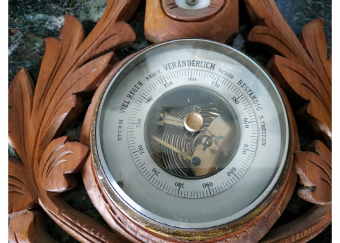 ברומטר וטרמומטר גרמני ישן מהיער השחור לתליה על הקיר, עשוי עץ מגולף
