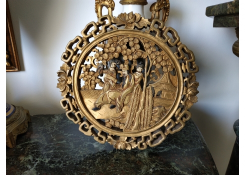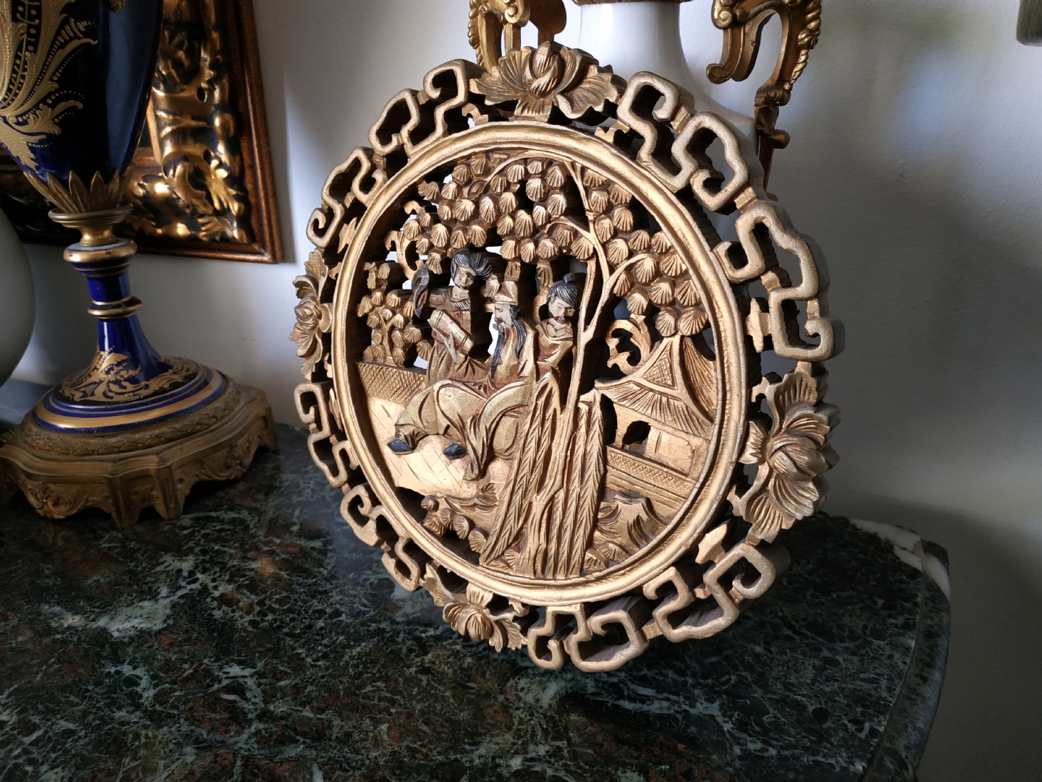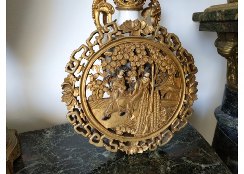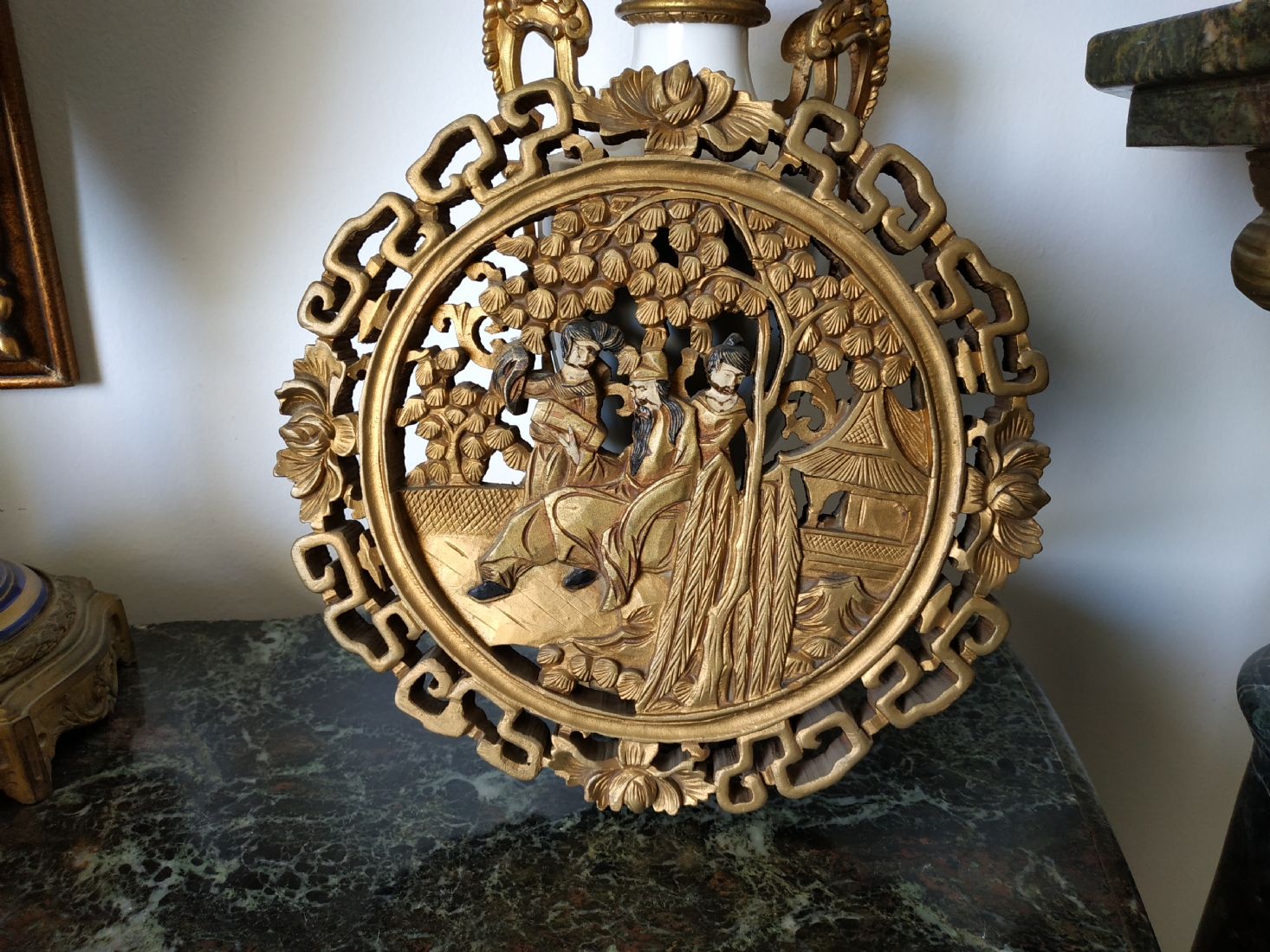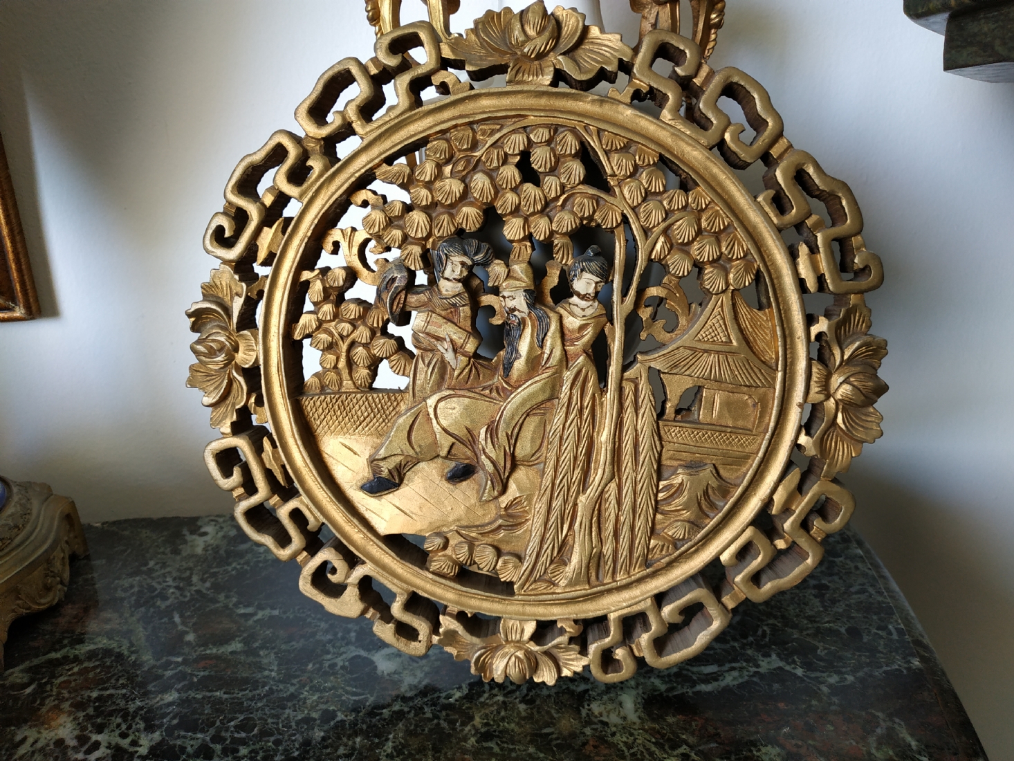 תבליט סיני דקורטיבי לתליה על הקיר עשוי עץ מגולף, צבוע זהב