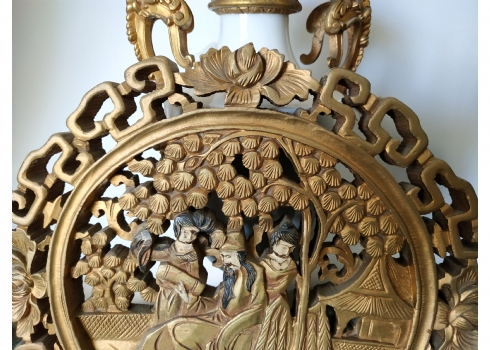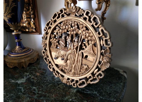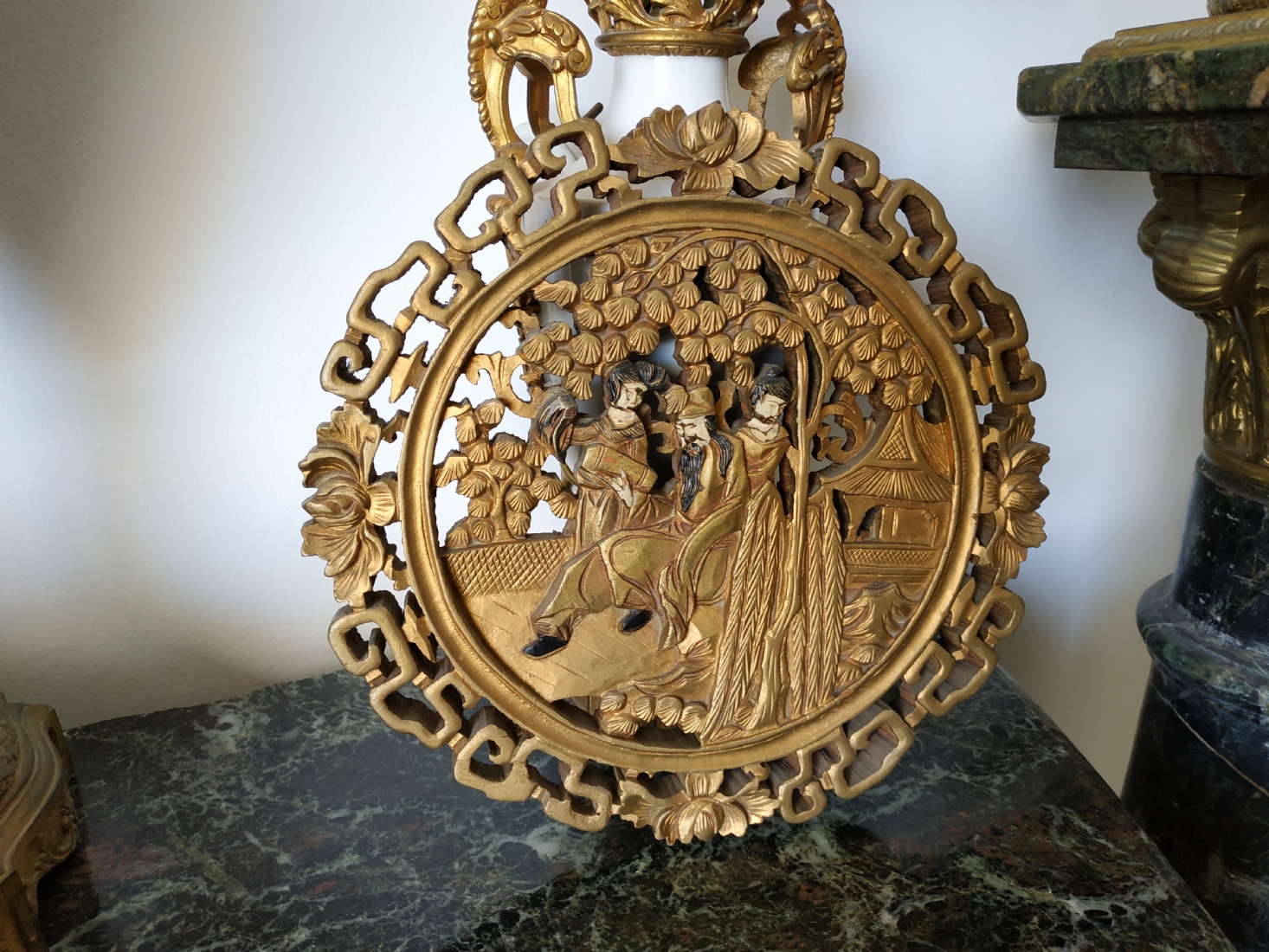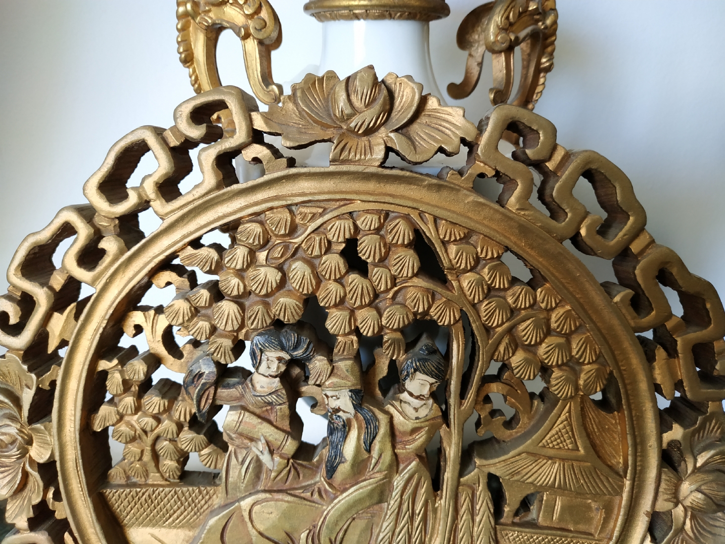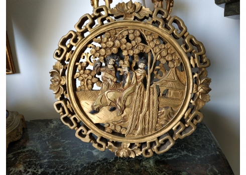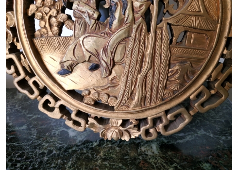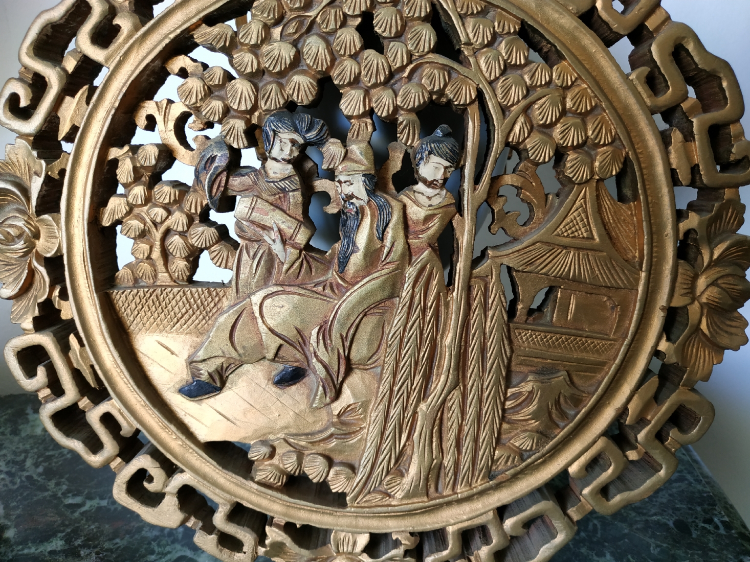 תבליט סיני דקורטיבי לתליה על הקיר עשוי עץ מגולף, צבוע זהב