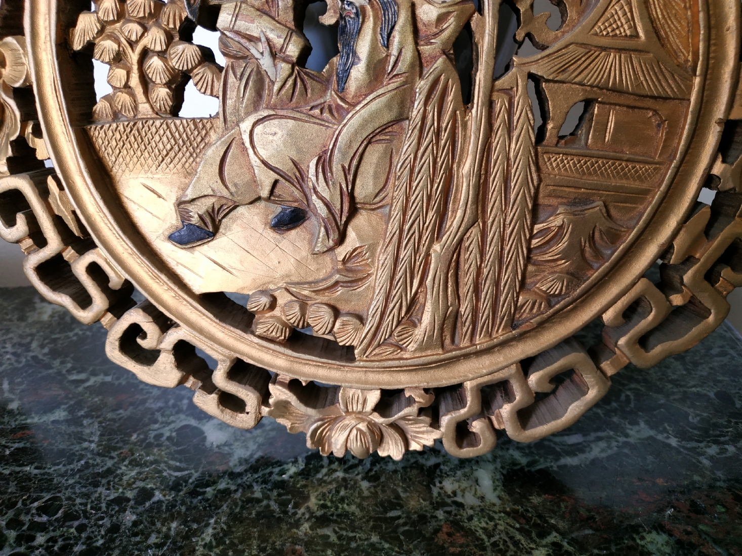 תבליט סיני דקורטיבי לתליה על הקיר עשוי עץ מגולף, צבוע זהב, קוטר: 27 ס"מ.