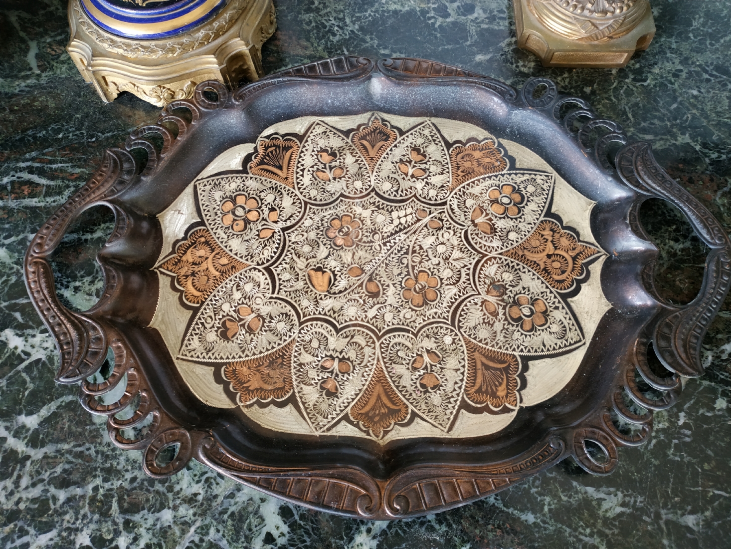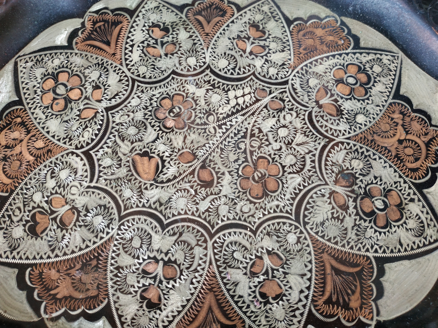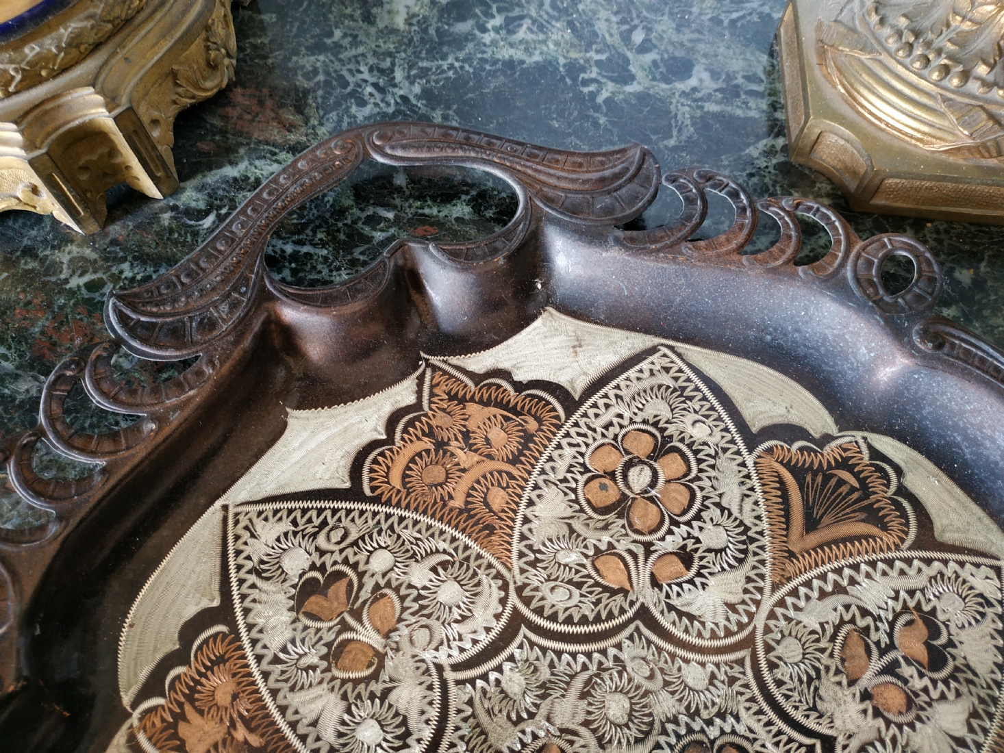 מגש נחושת הודי מעוטר, רוחב: 32 ס"מ, אורך: 48 ס"מ.