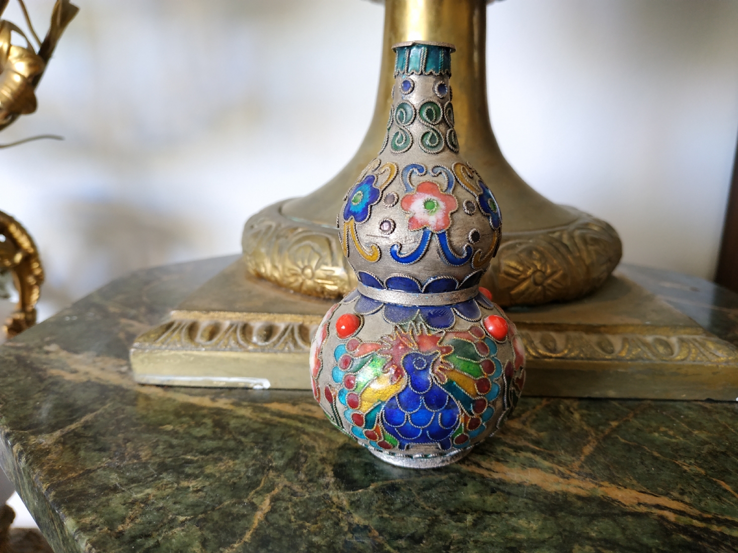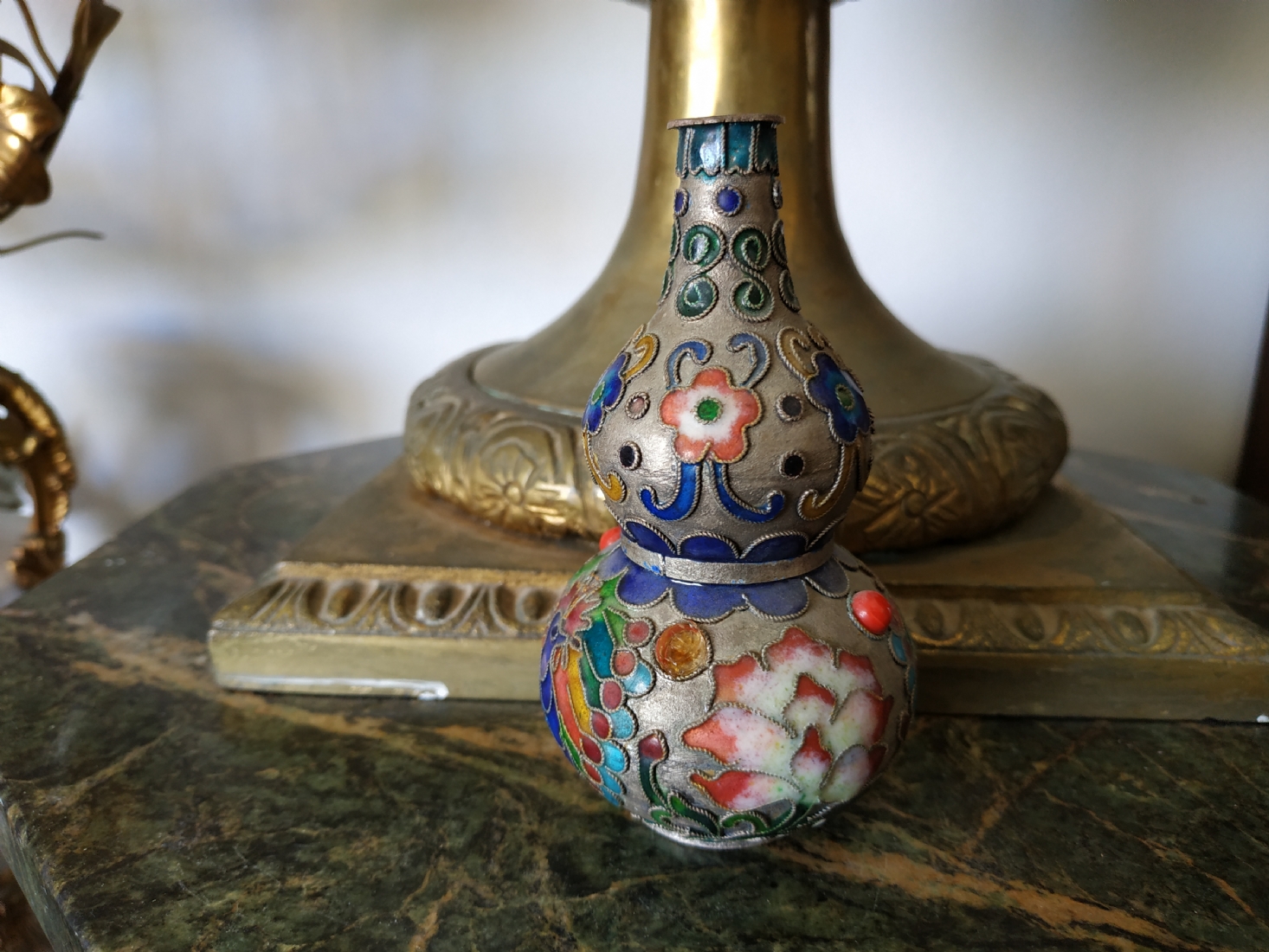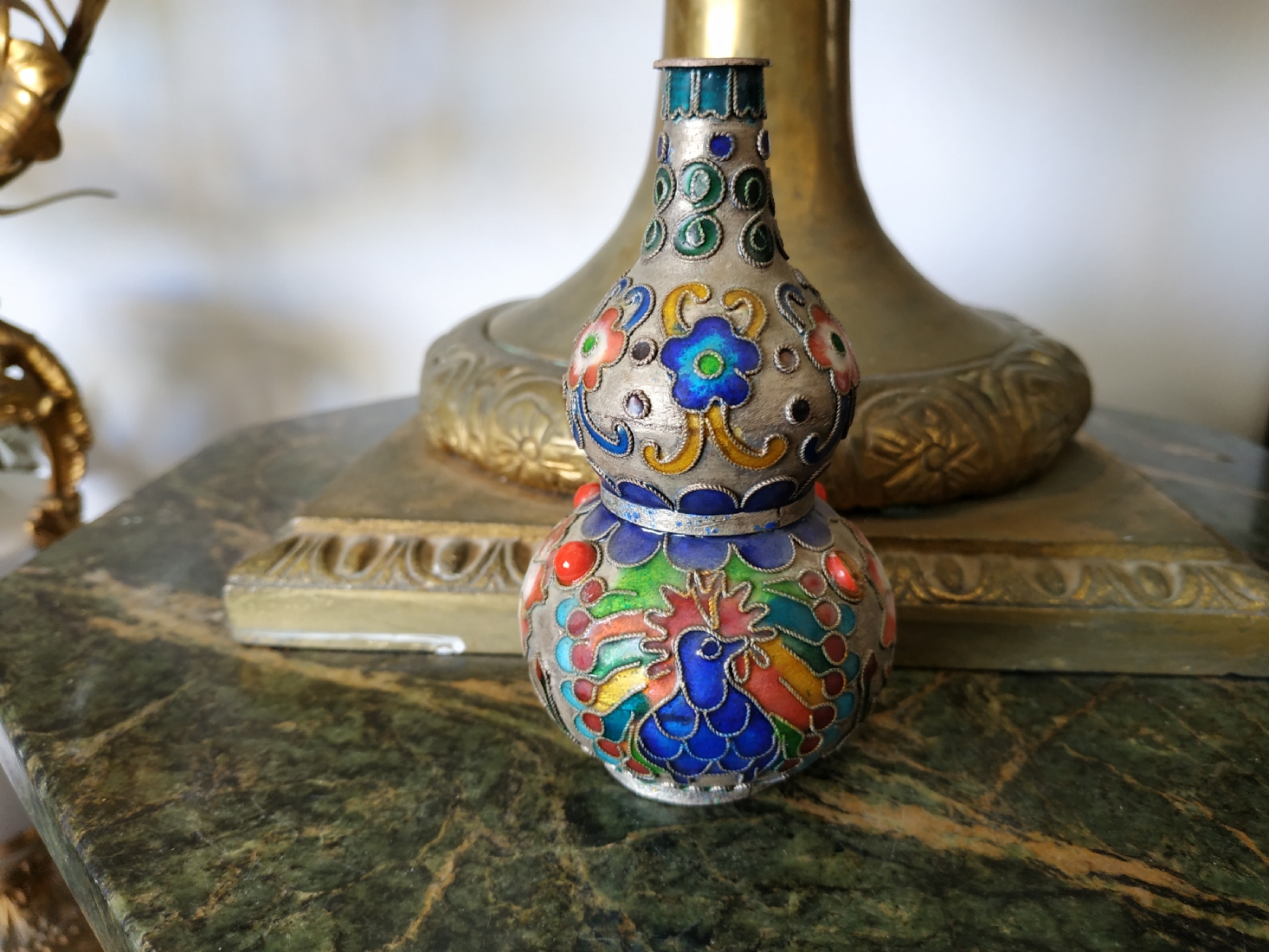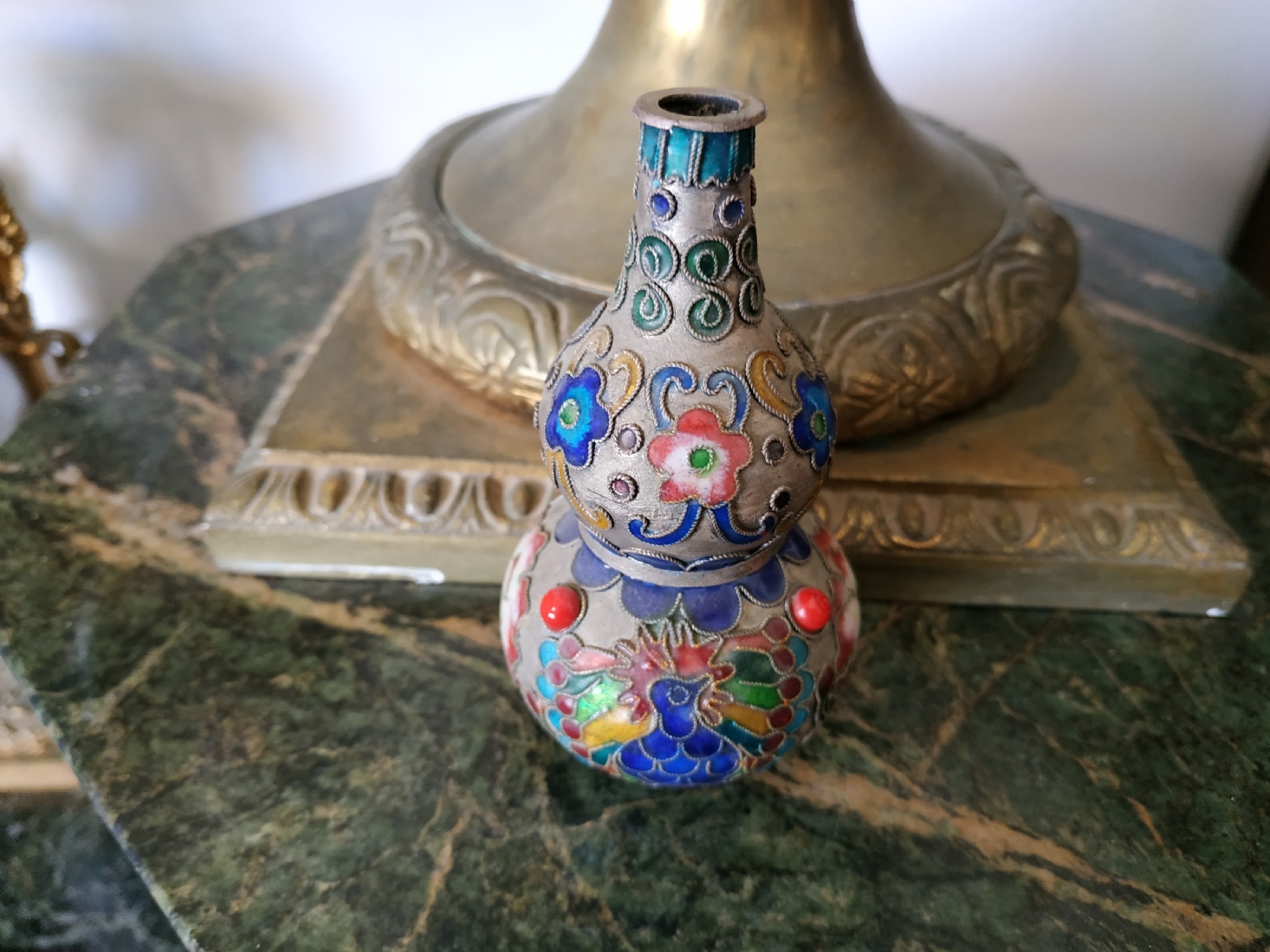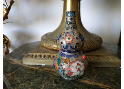 מספר הפריט בקטלוג 217אגרטל קלואזונה (Cloisonné) סיני ישן מעוצב בצורת בקבוק כפול, עשוי פליז ואמייל, גובה: 10.5 ס"מ.