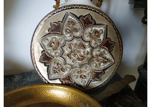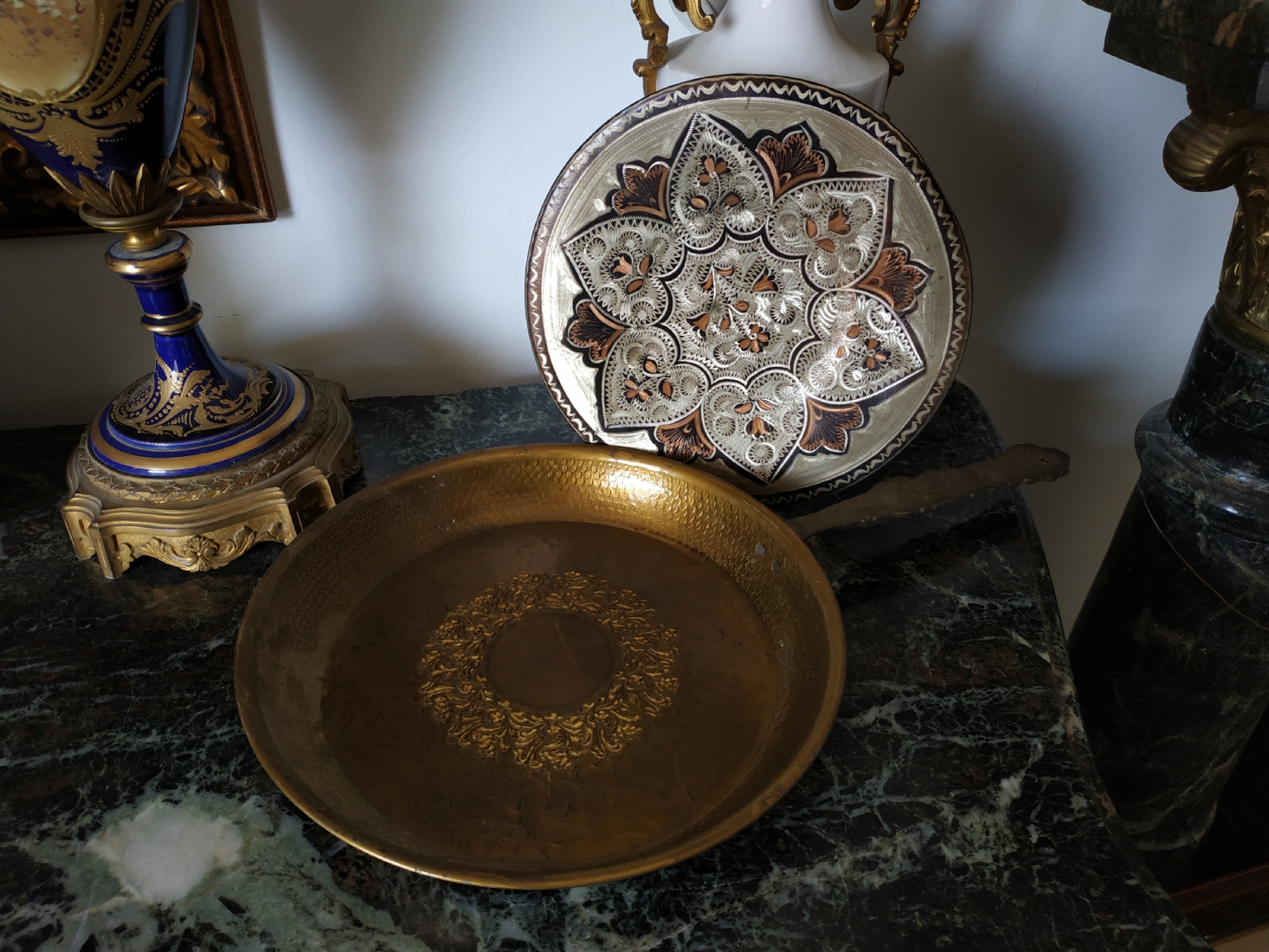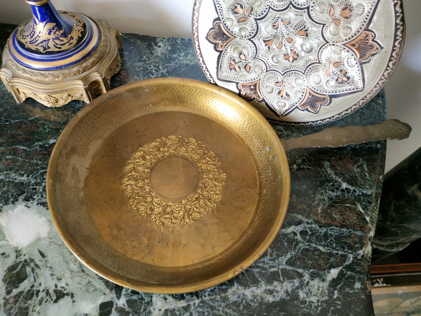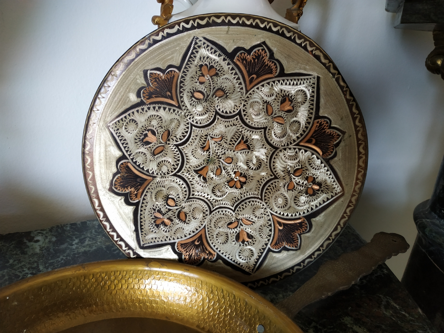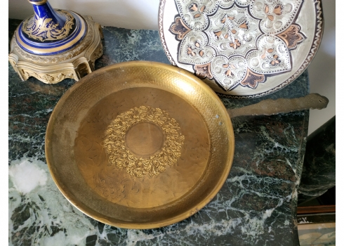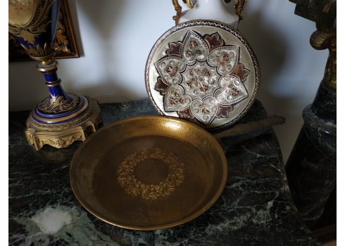 לוט של שני חפצי מתכת: מחבת נוי עשויה פליז וצלחת נחושת הודית דקורטיבית
