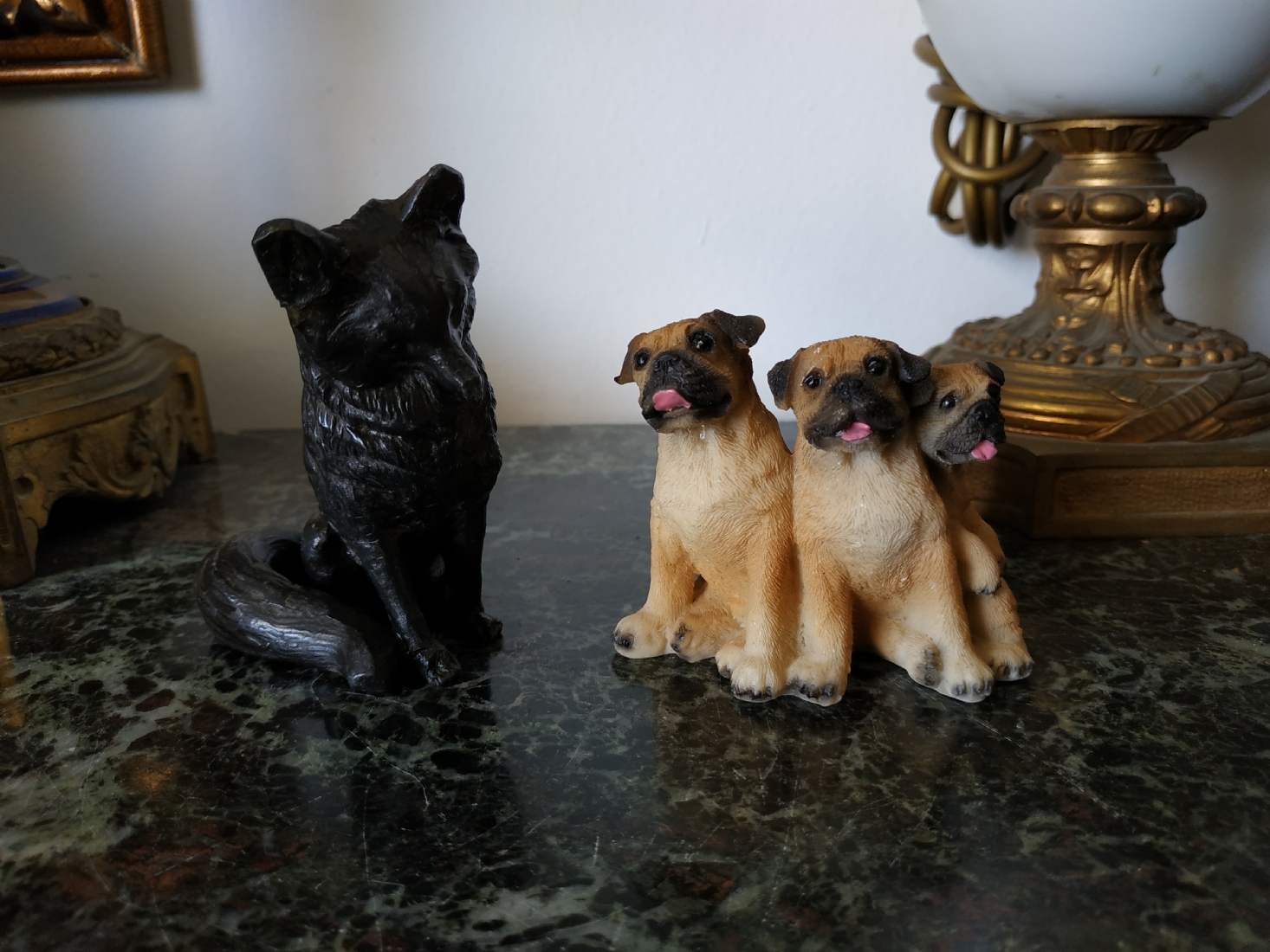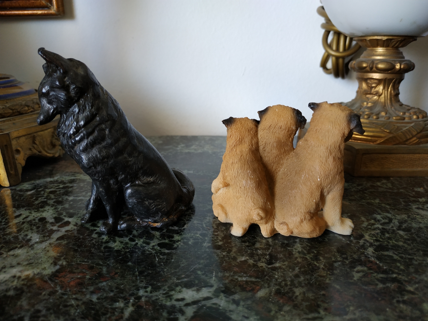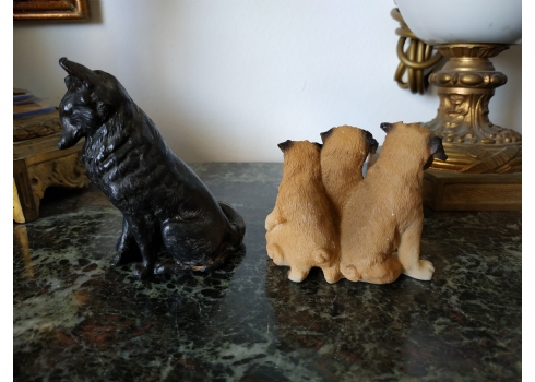 לוט של שני פסלונים בדמות כלבים, אחד עשוי מתכת והשני חומר יצוק, גובה בהתאמה: 7 ס"מ, 9 ס"מ.