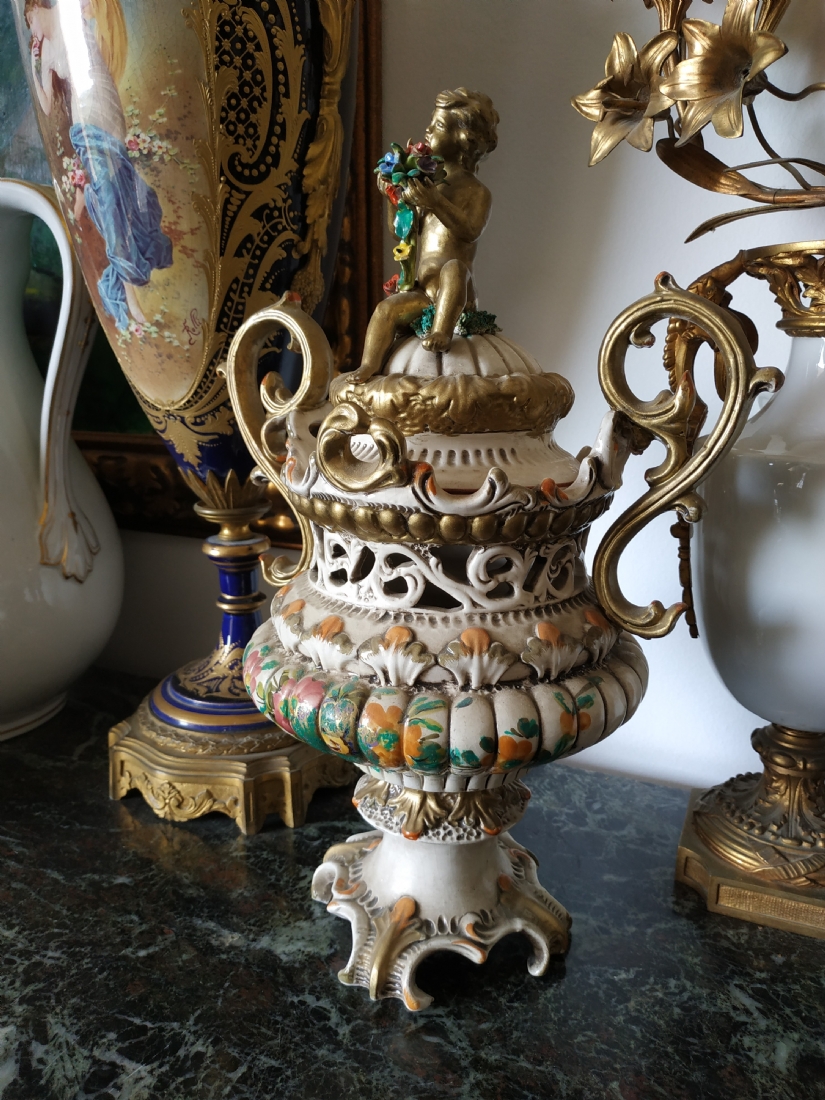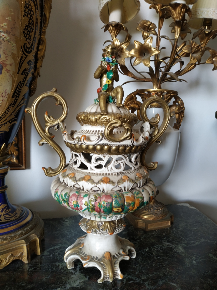 אגרטל איטלקי מרשים ומכסה תואם, עשויים חרס מעוטר, חתום, גובה כולל: 40 ס"מ.