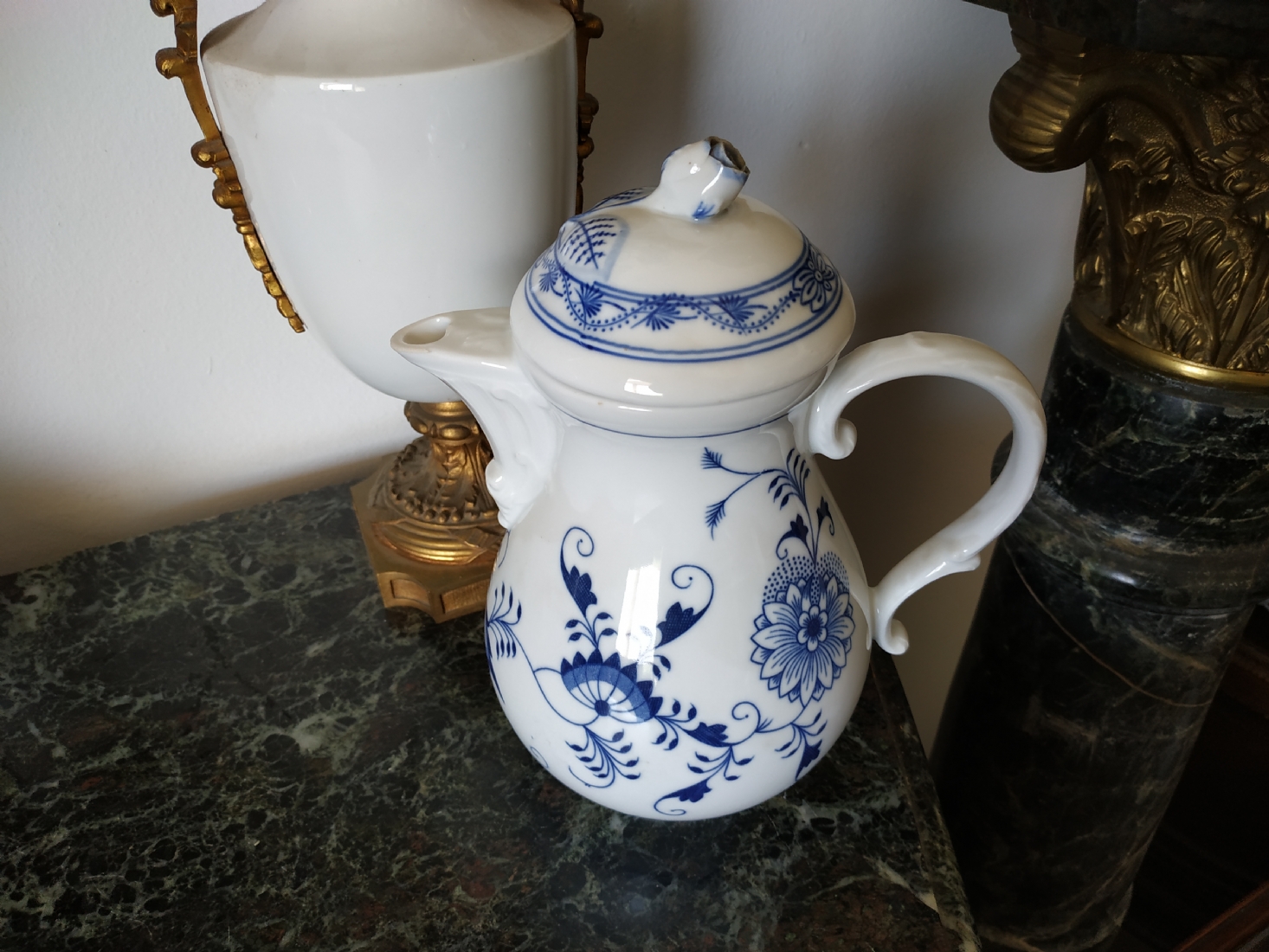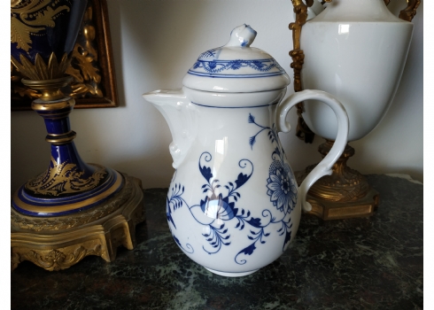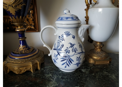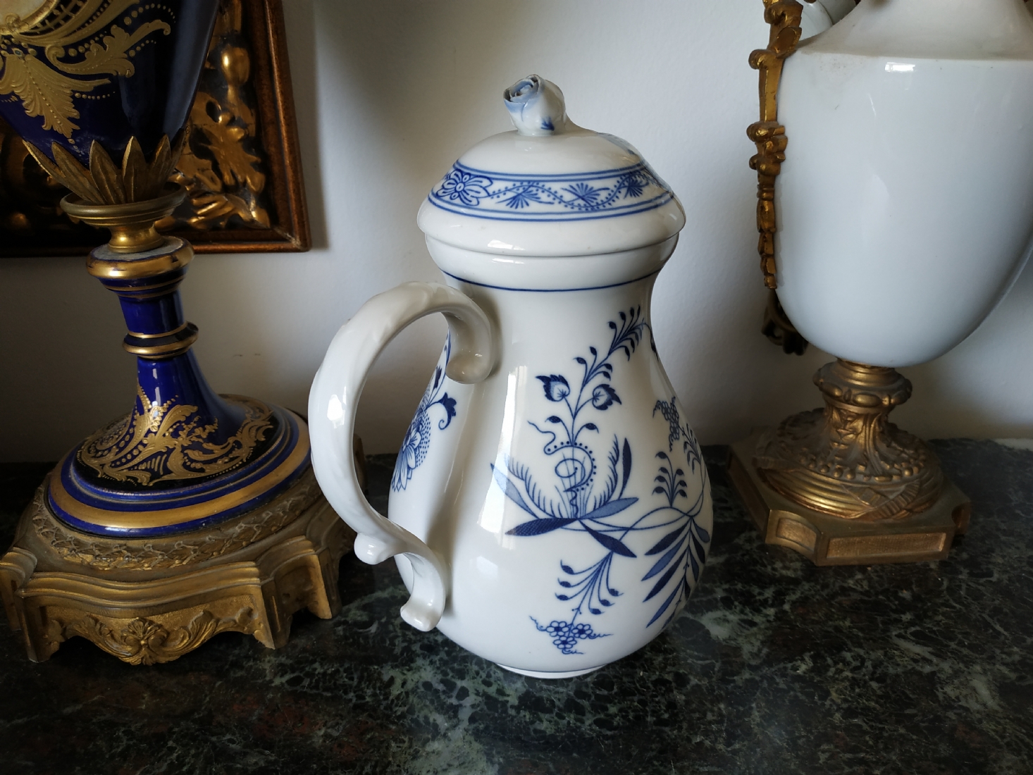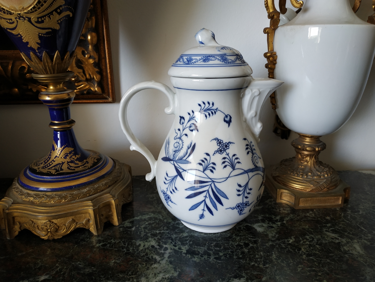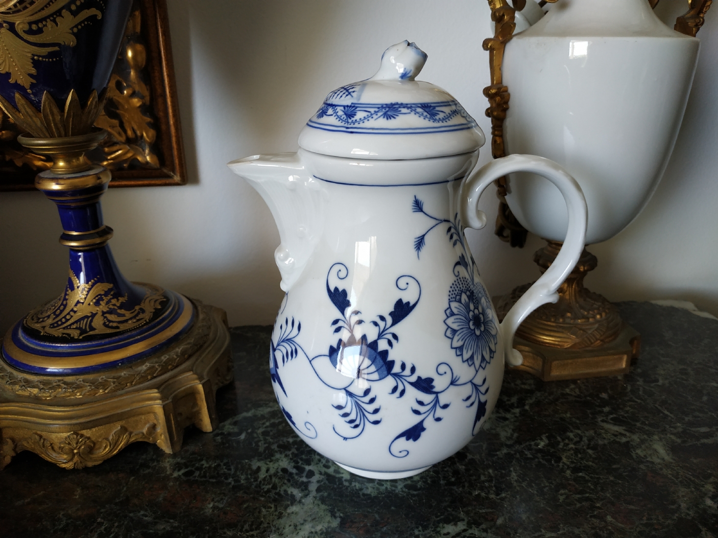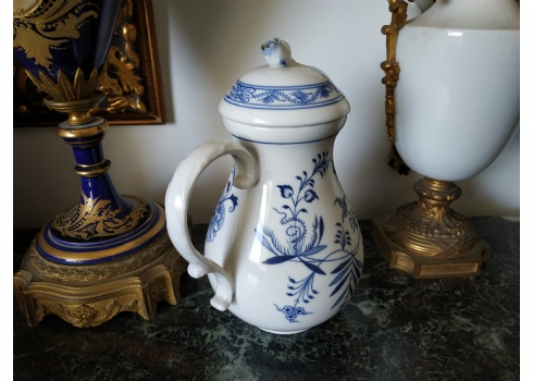 קנקן פורצלן גרמני עתיק לשוקו, מעוטר בכחול קובלט בדגם 'הבצל הכחול' (Blue Onion)