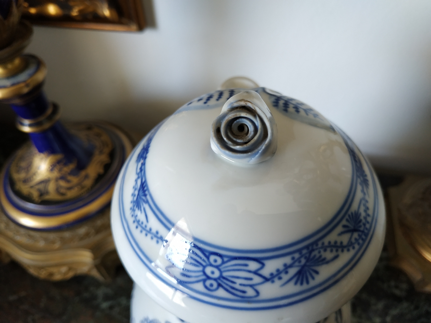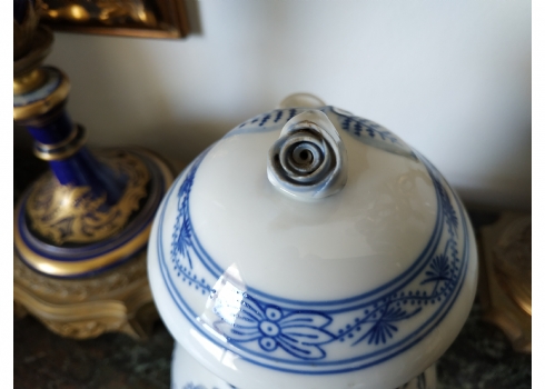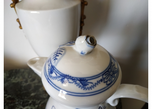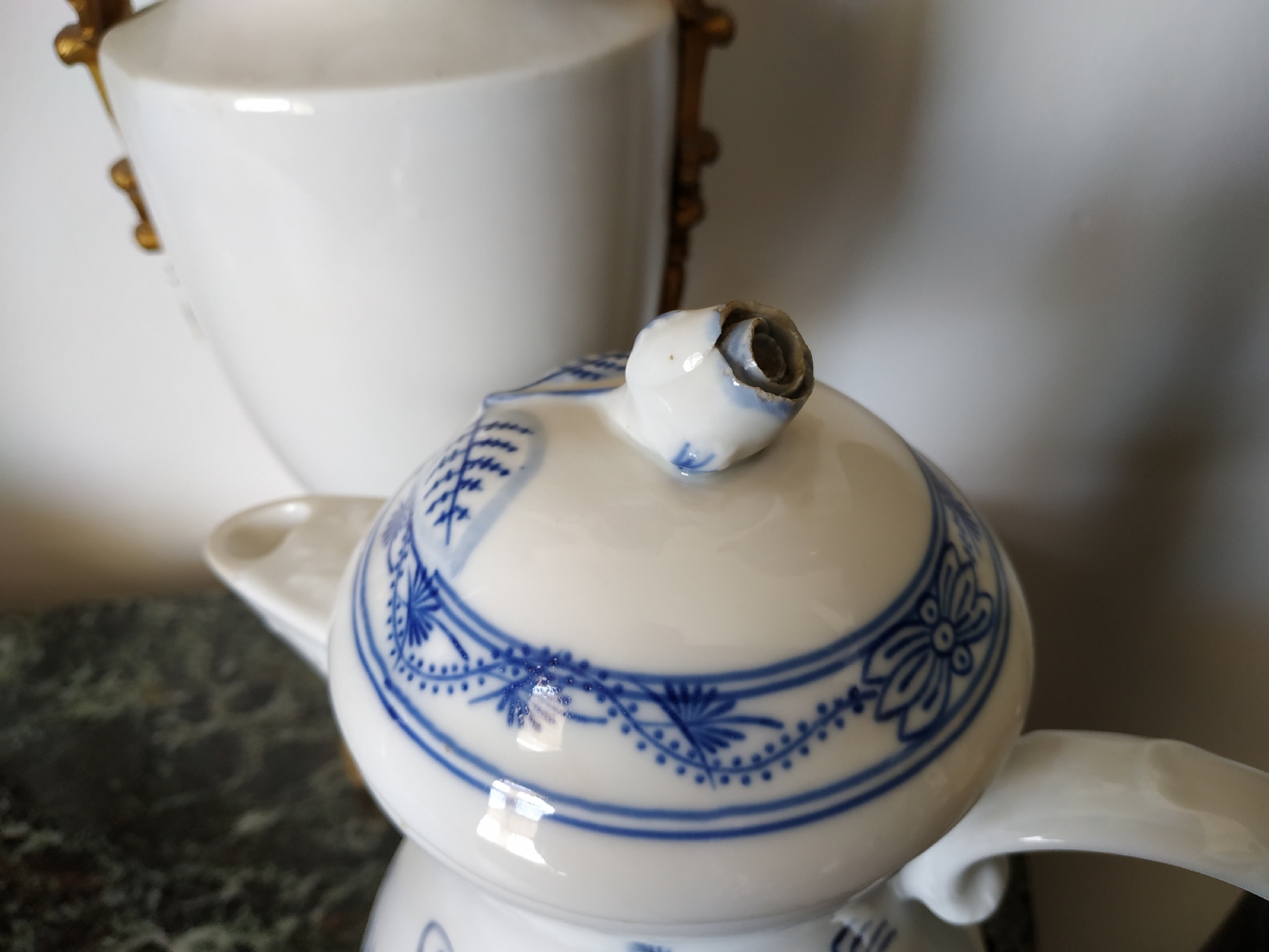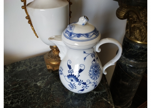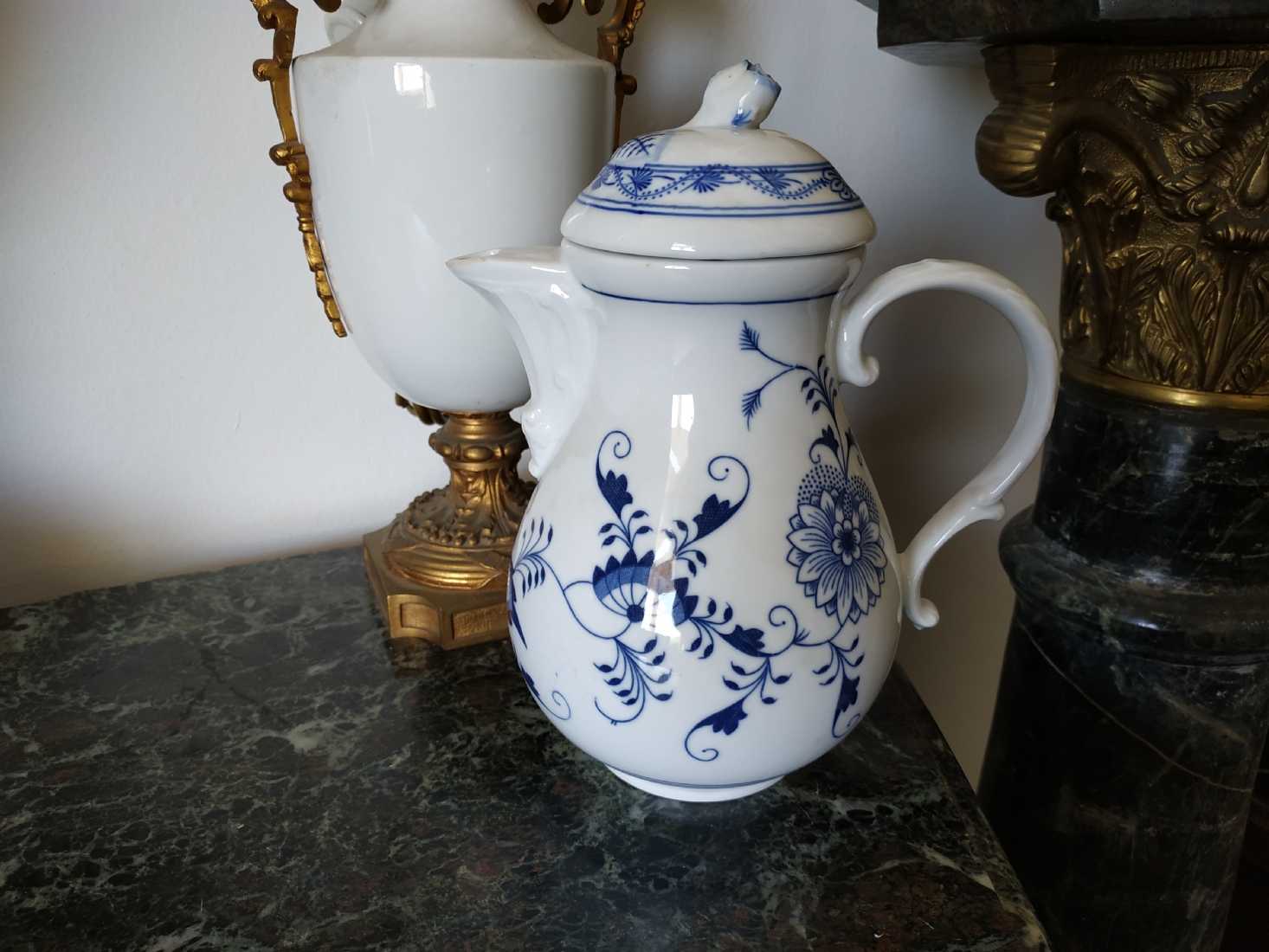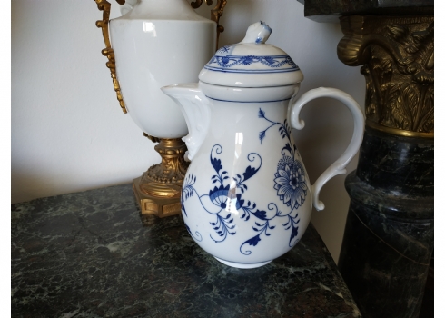 קנקן פורצלן גרמני עתיק לשוקו, מעוטר בכחול קובלט בדגם 'הבצל הכחול' (Blue Onion)