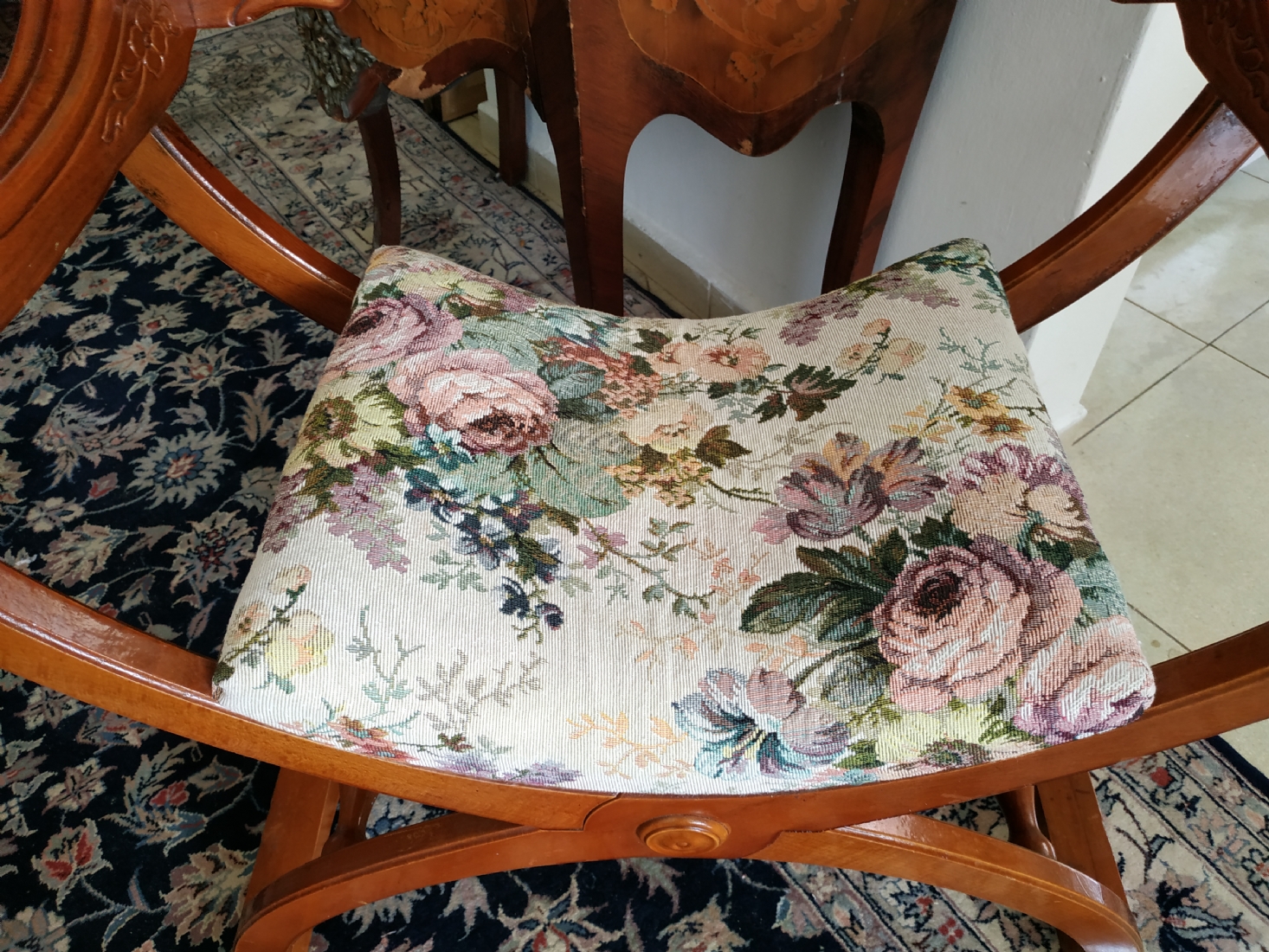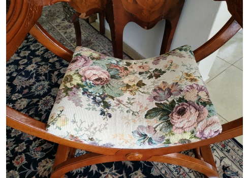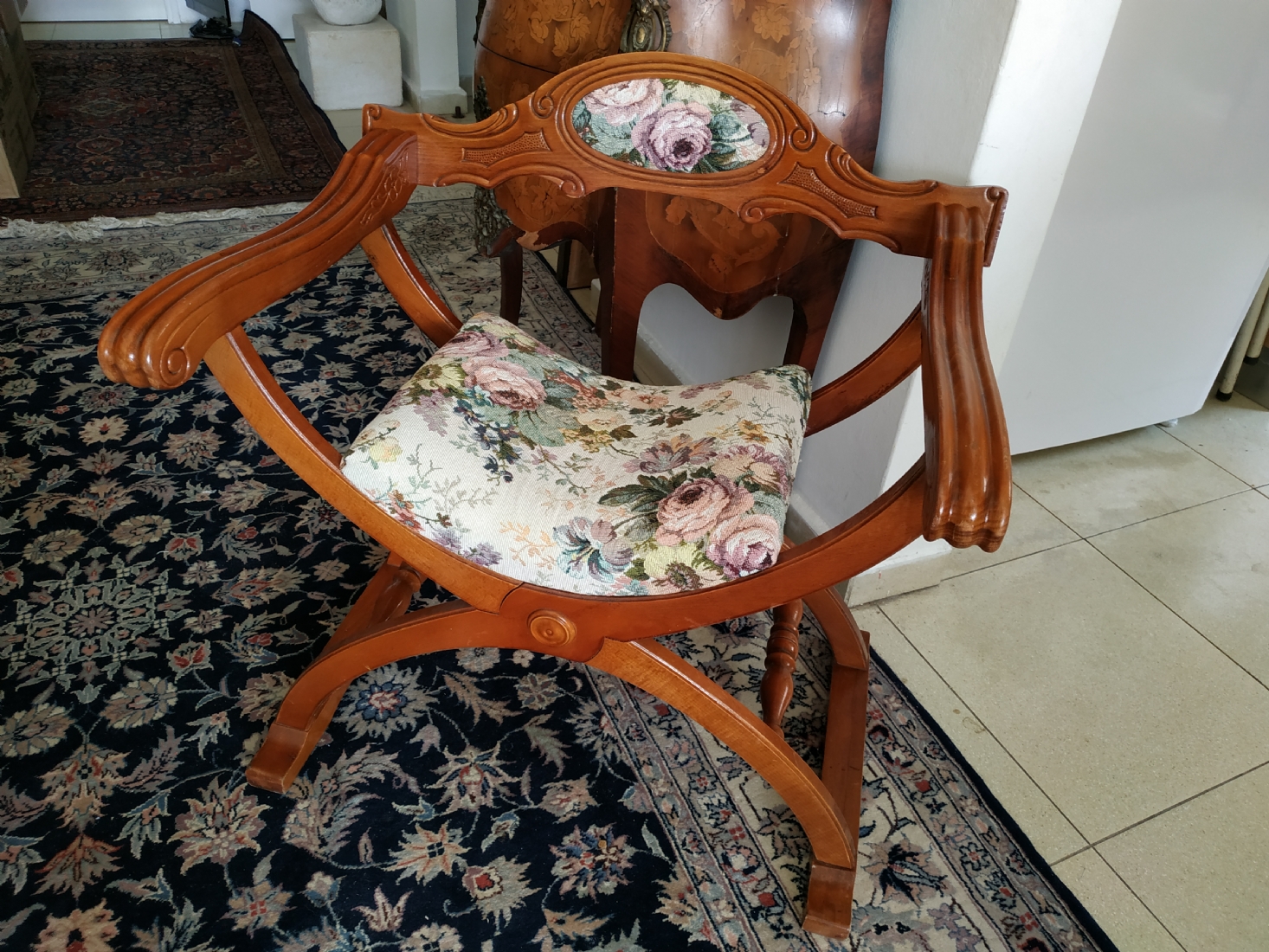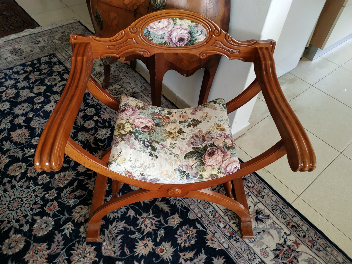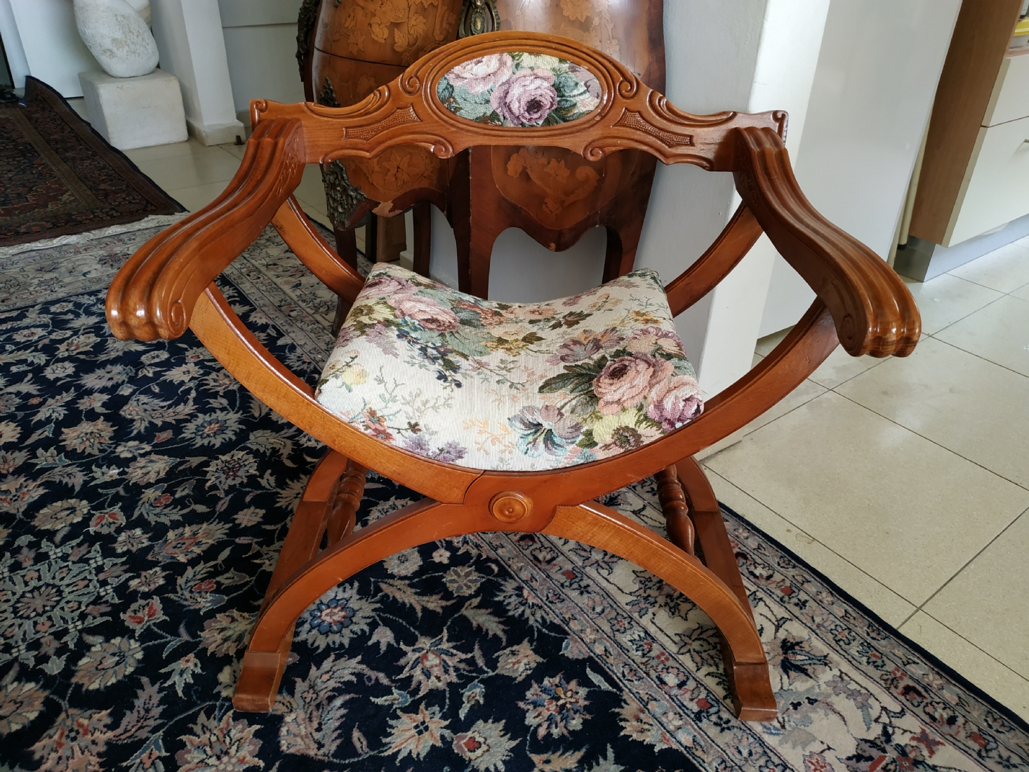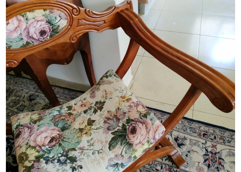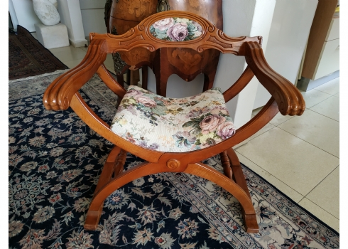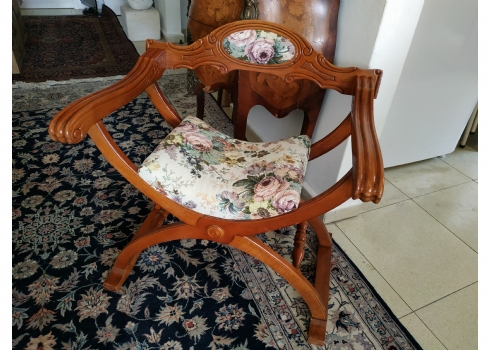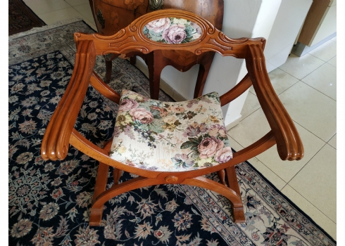 מספר הפריט בקטלוג 354כיסא ישן בסגנון כיסא סבונרולה (Savonarola chair) נקרא גם Curule chair, עשוי עץ וריפוד גובלן, גובה: 68 ס"מ, רוחב: 68 ס"מ, עומק: 48 ס"מ.