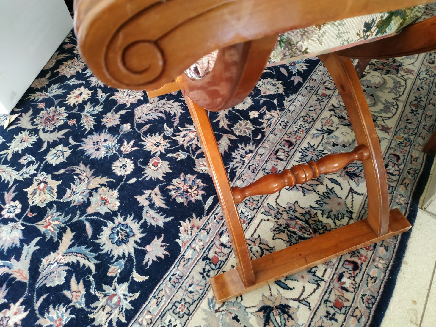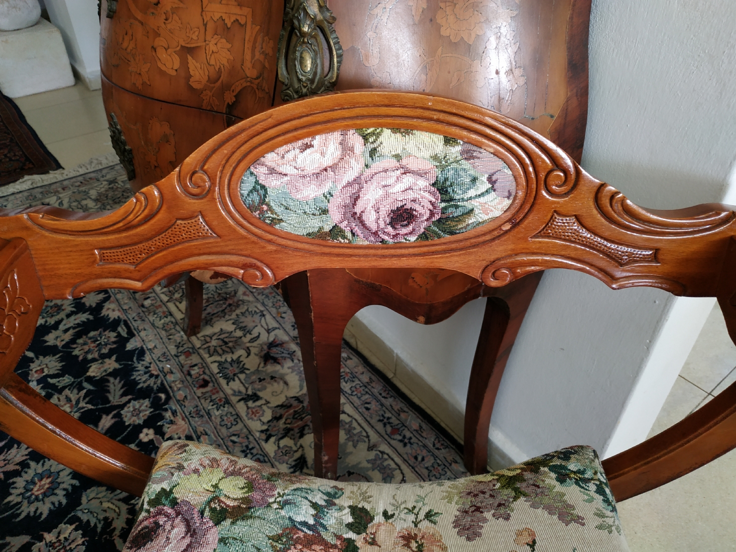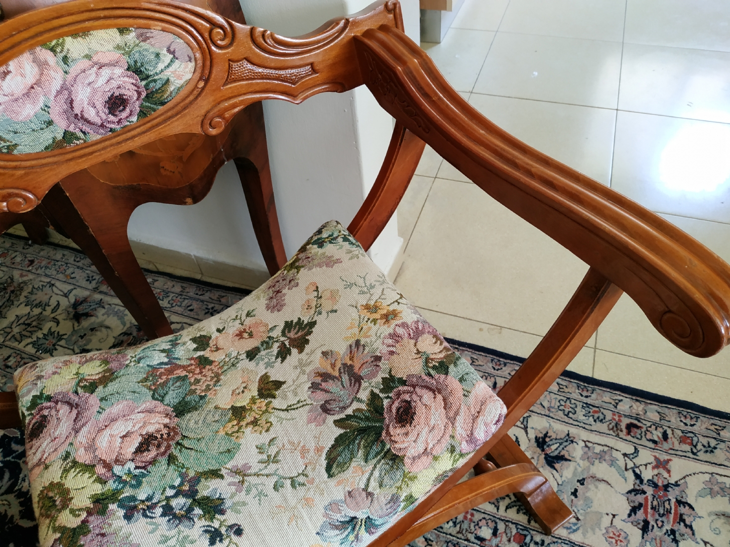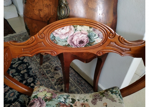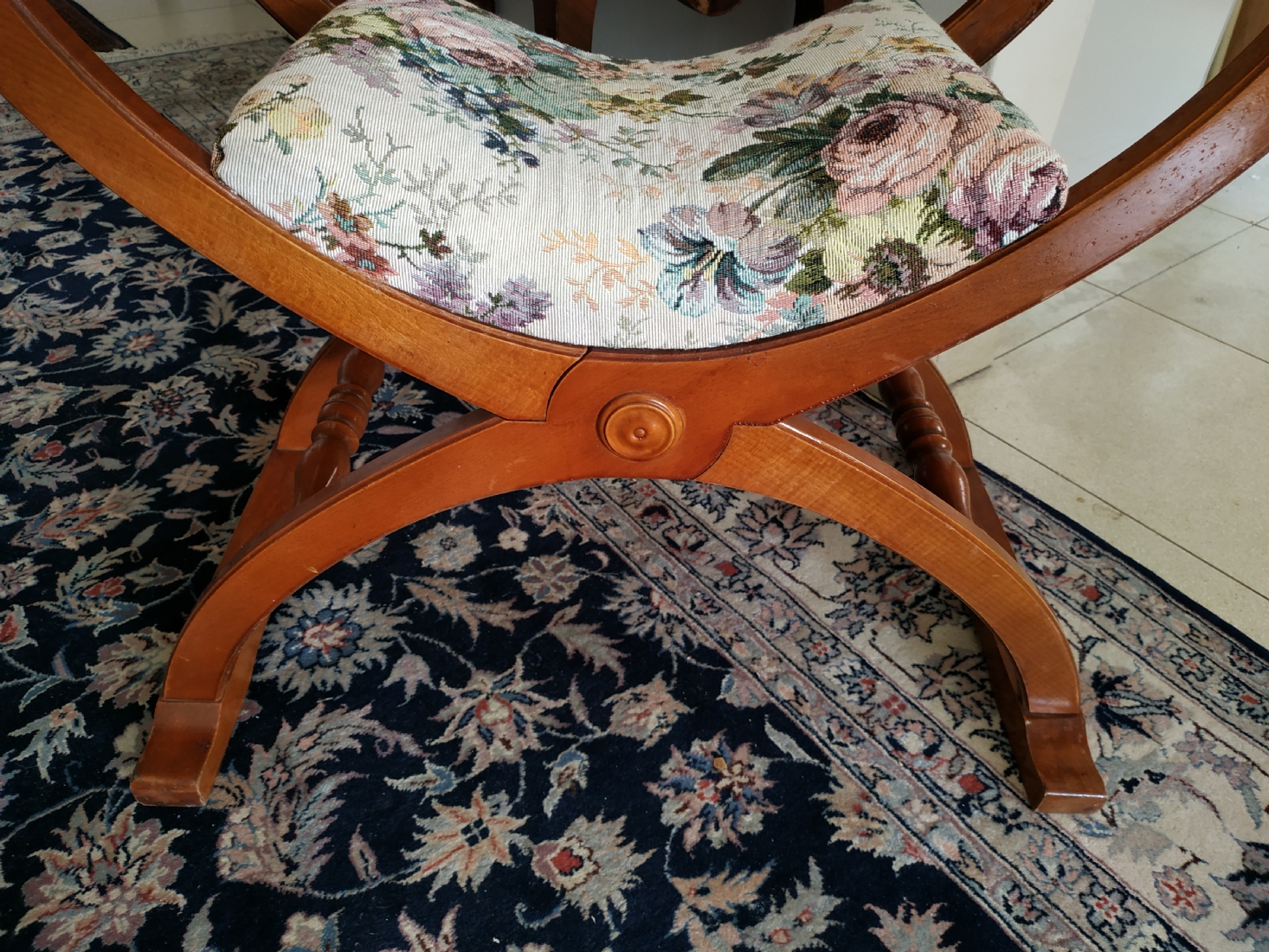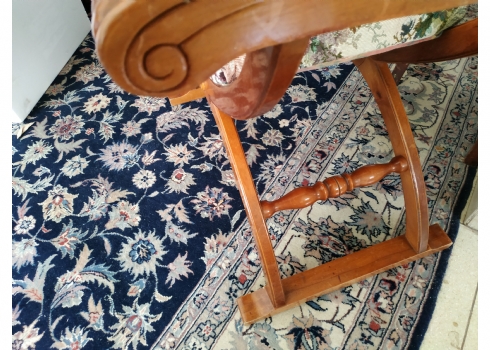 מספר הפריט בקטלוג 354כיסא ישן בסגנון כיסא סבונרולה (Savonarola chair) נקרא גם Curule chair, עשוי עץ וריפוד גובלן, גובה: 68 ס"מ, רוחב: 68 ס"מ, עומק: 48 ס"מ.