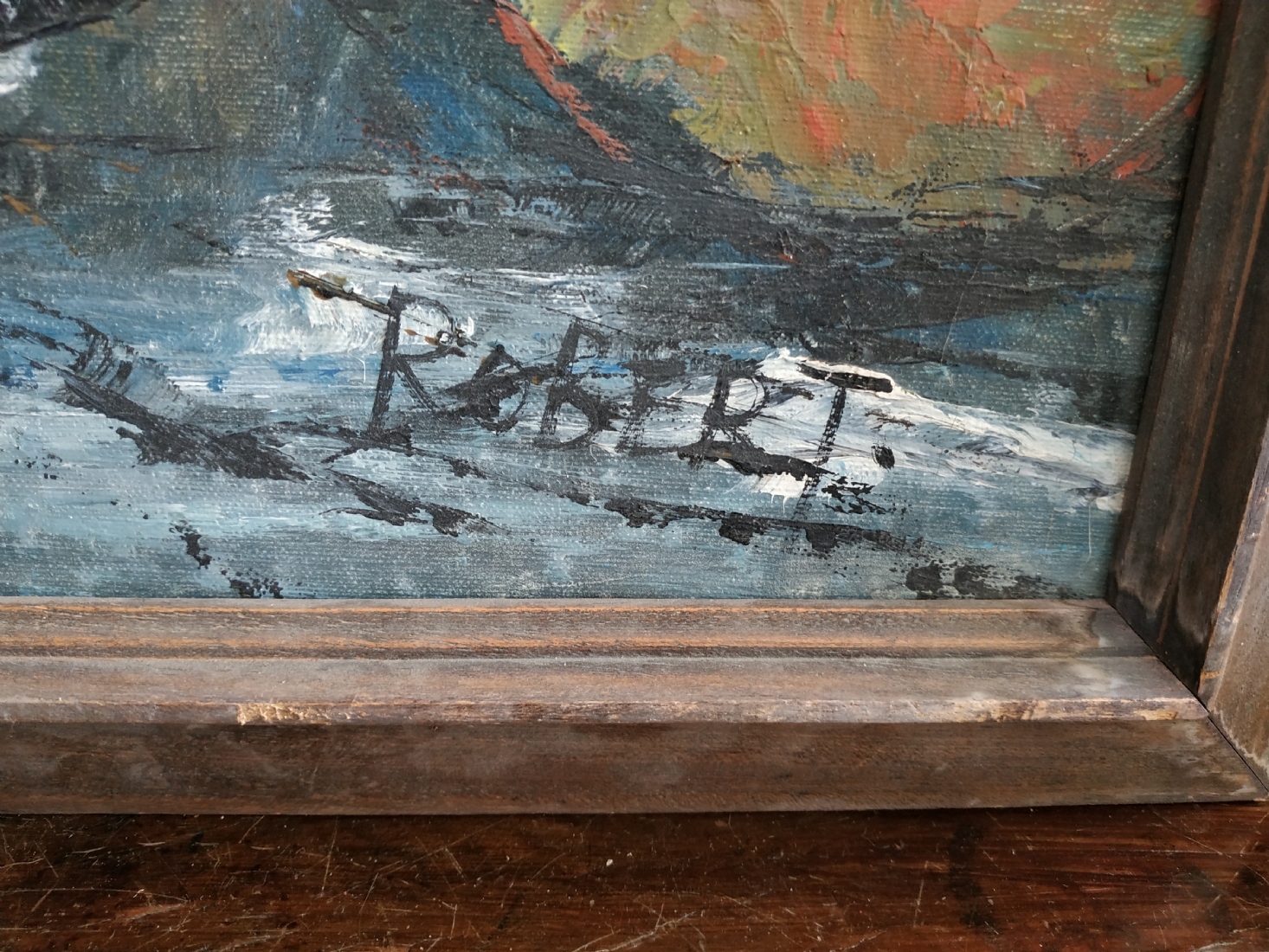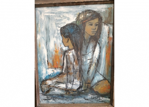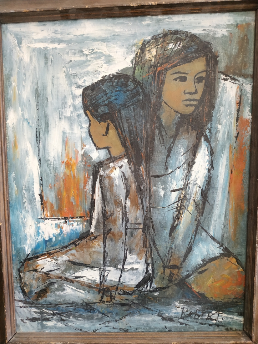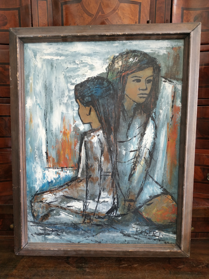 'שתי נערות' - ציור ישן, שמן על בד, חתום: 'Robert'