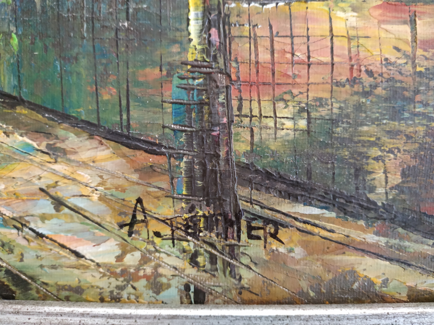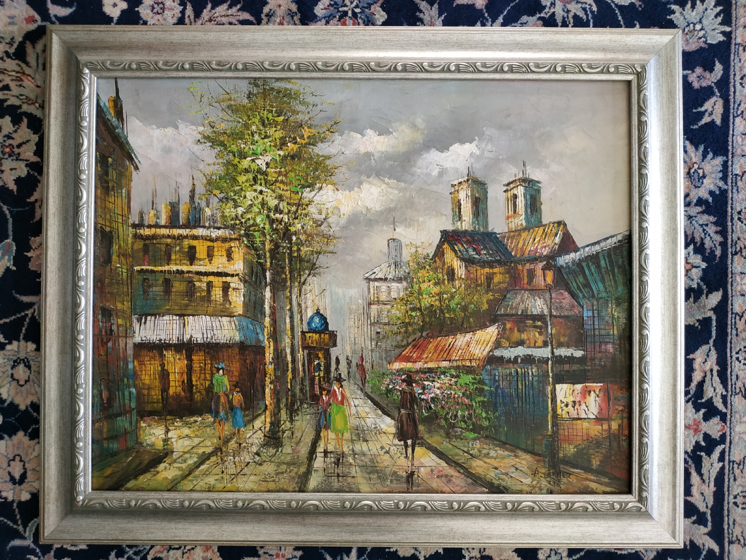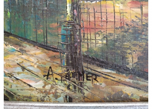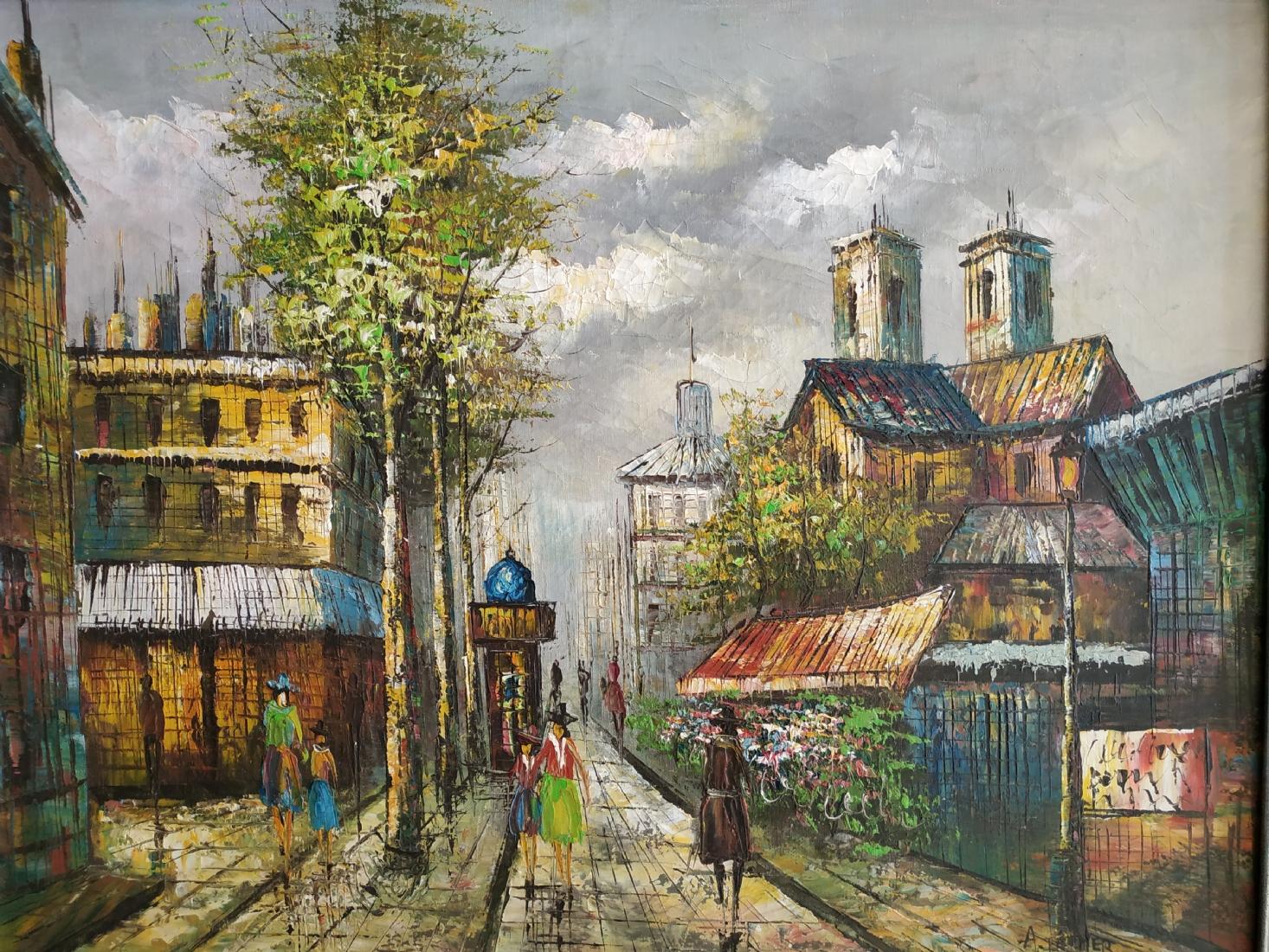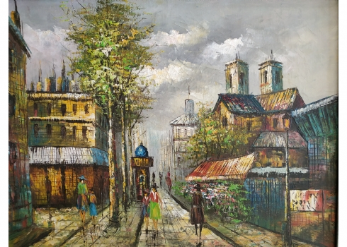 'לוח המודעות ברחוב מרד אלור' - ציור ישן, שמן על בד, חתום, מידות: 48X62 ס"מ.