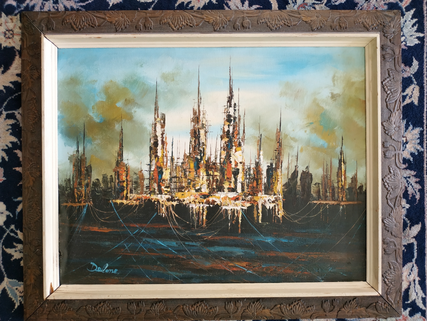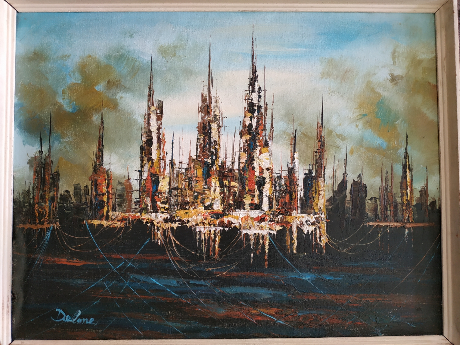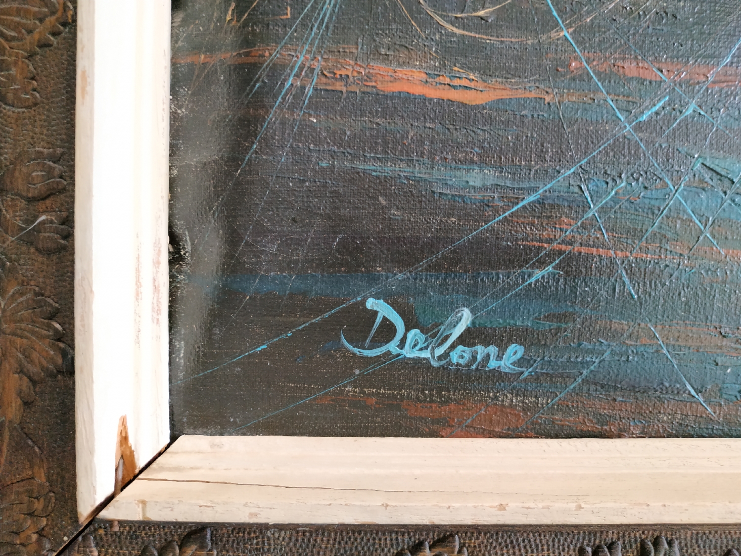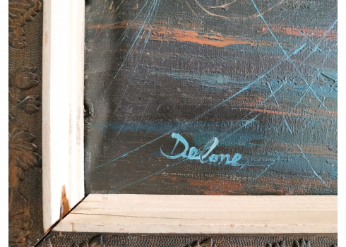 'סירות דייגים וחבלים כחולים' ציור ישן, שמן על בד, חתום, מידות: 40X50 ס"מ, המסגרת זקוקה לחיזוק.