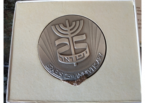 מדלית כסף ישראלית ישנה ליובל 25 למדינת ישראל, עשויה כסף '935', חתומה, משקל: 46.8 גרם, קוטר: 4.5 ס"מ.