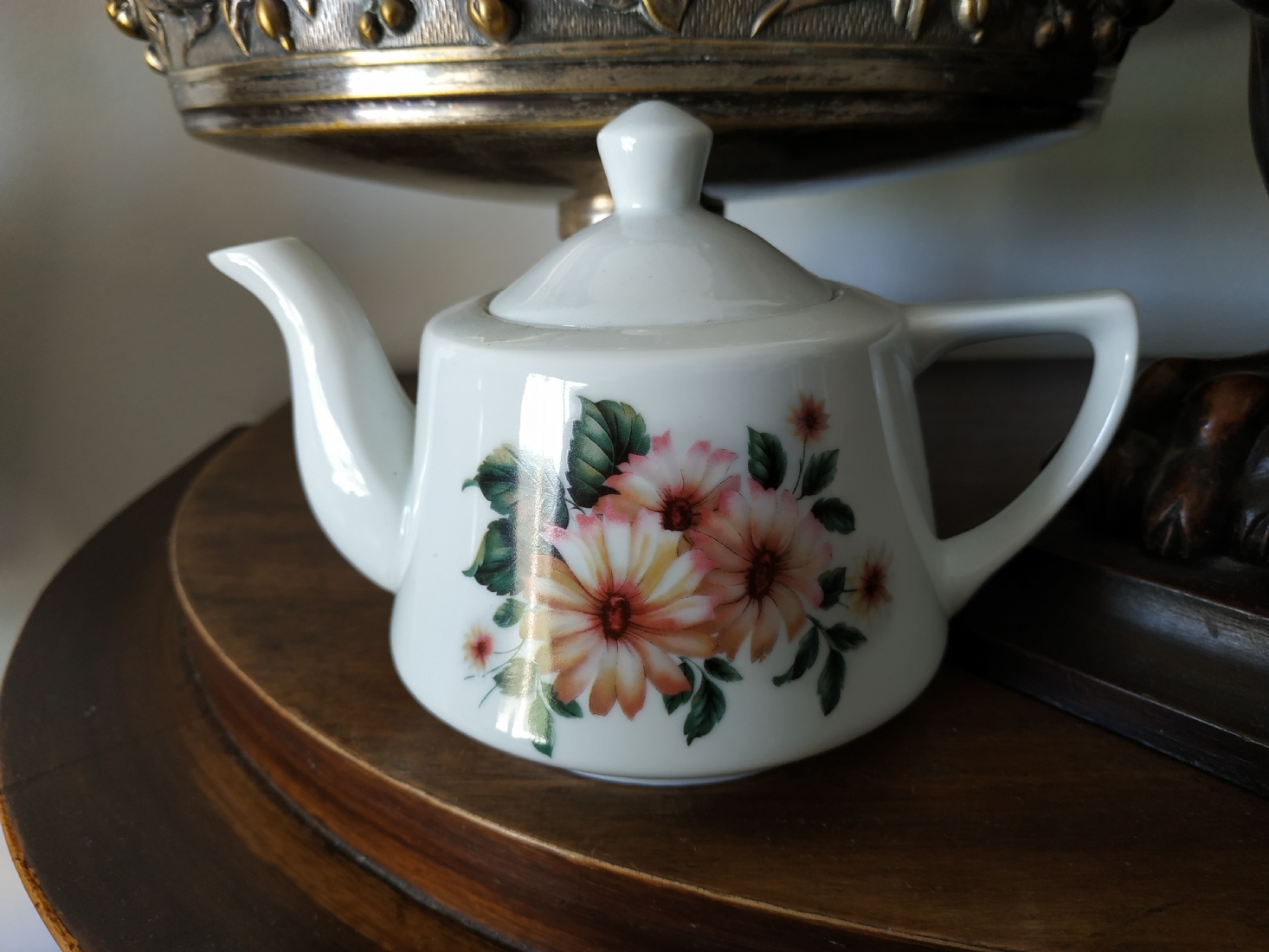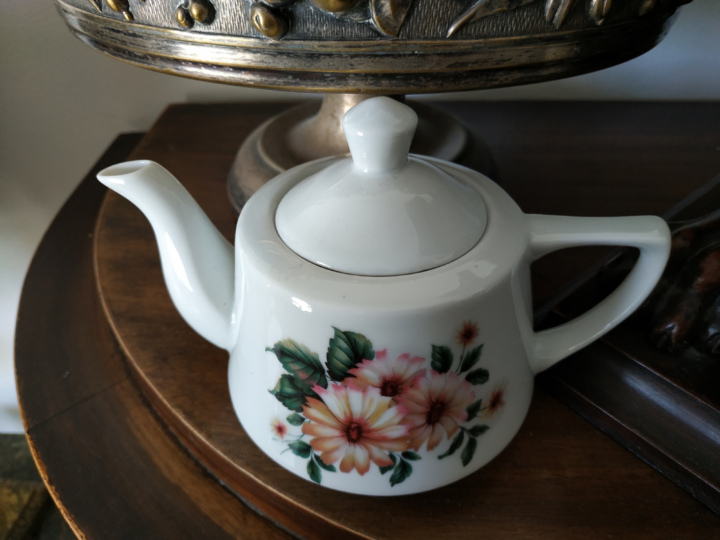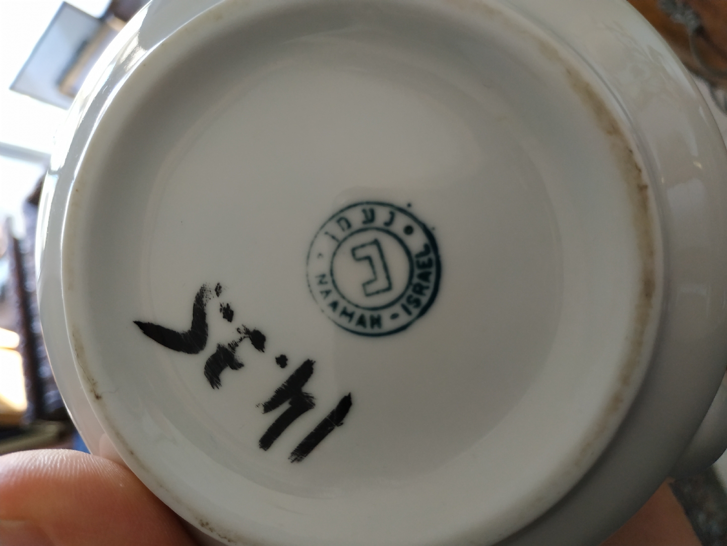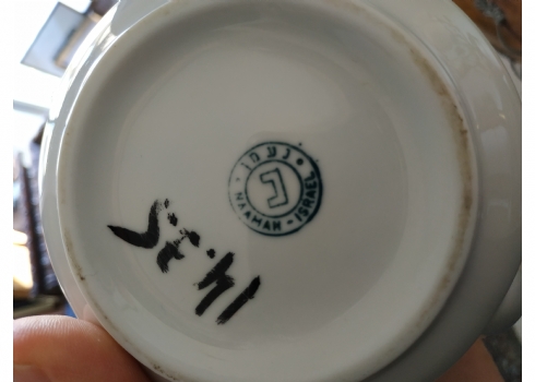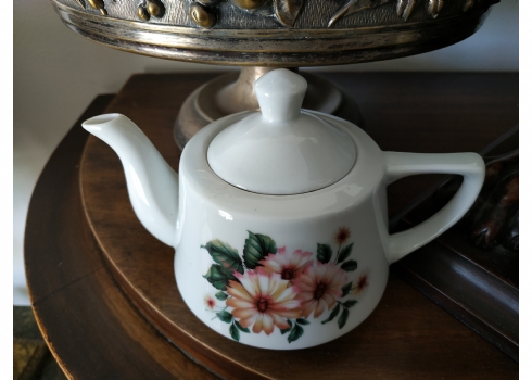 קומקום ישראלי קטן לתה, מתוצרת: 'נעמן', עשוי פורצלן, מעוטר וחתום, גובה: 10 ס"מ, רוחב כולל ידית וזרבובית: 15.5 ס"מ.