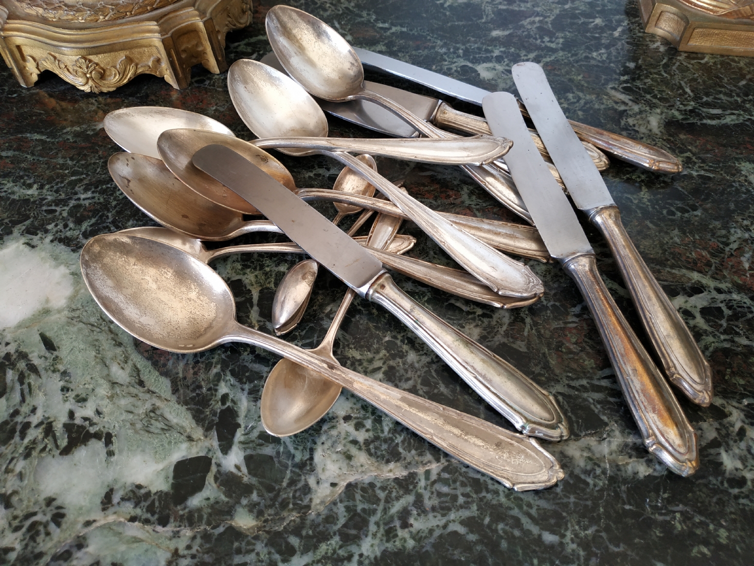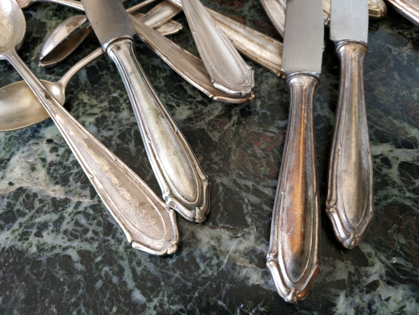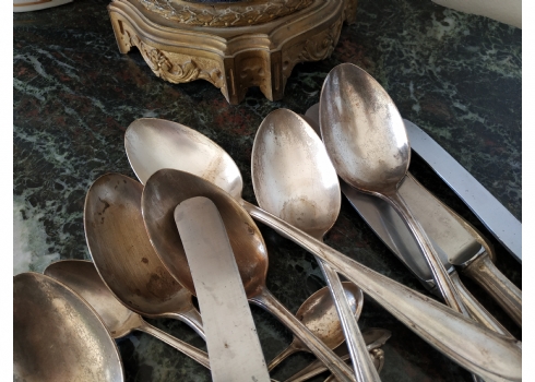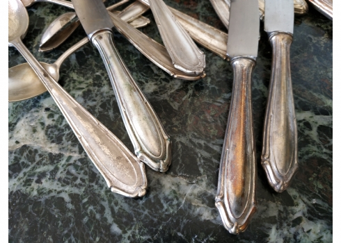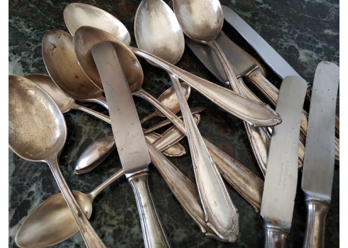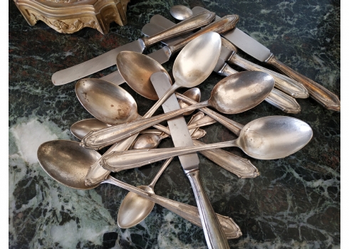 לוט של כלי כסף שונים עשויים כסף, חתומים (חותמות כסף פולני), משקל כולל (ללא הסכינים): 632 גרם. הלוט כולל: 6 כפות למרק באורך: 21.5 ס"מ, 2 כפיות באורך: 14 ס"מ, 2 כפיות באורך: 11 ס"מ, ו-6 סכינים שרק קליפת הידיות עשויה כסף.