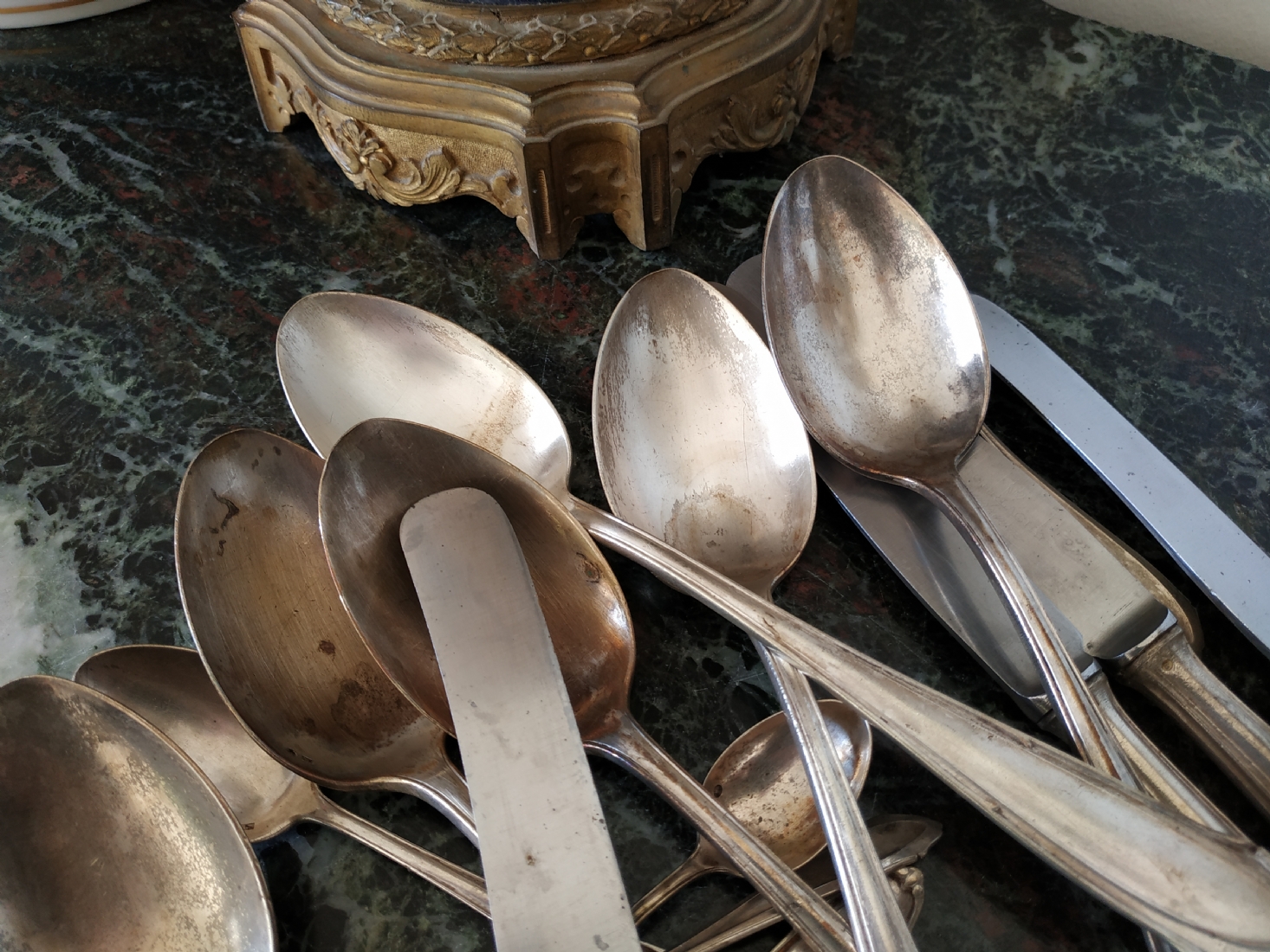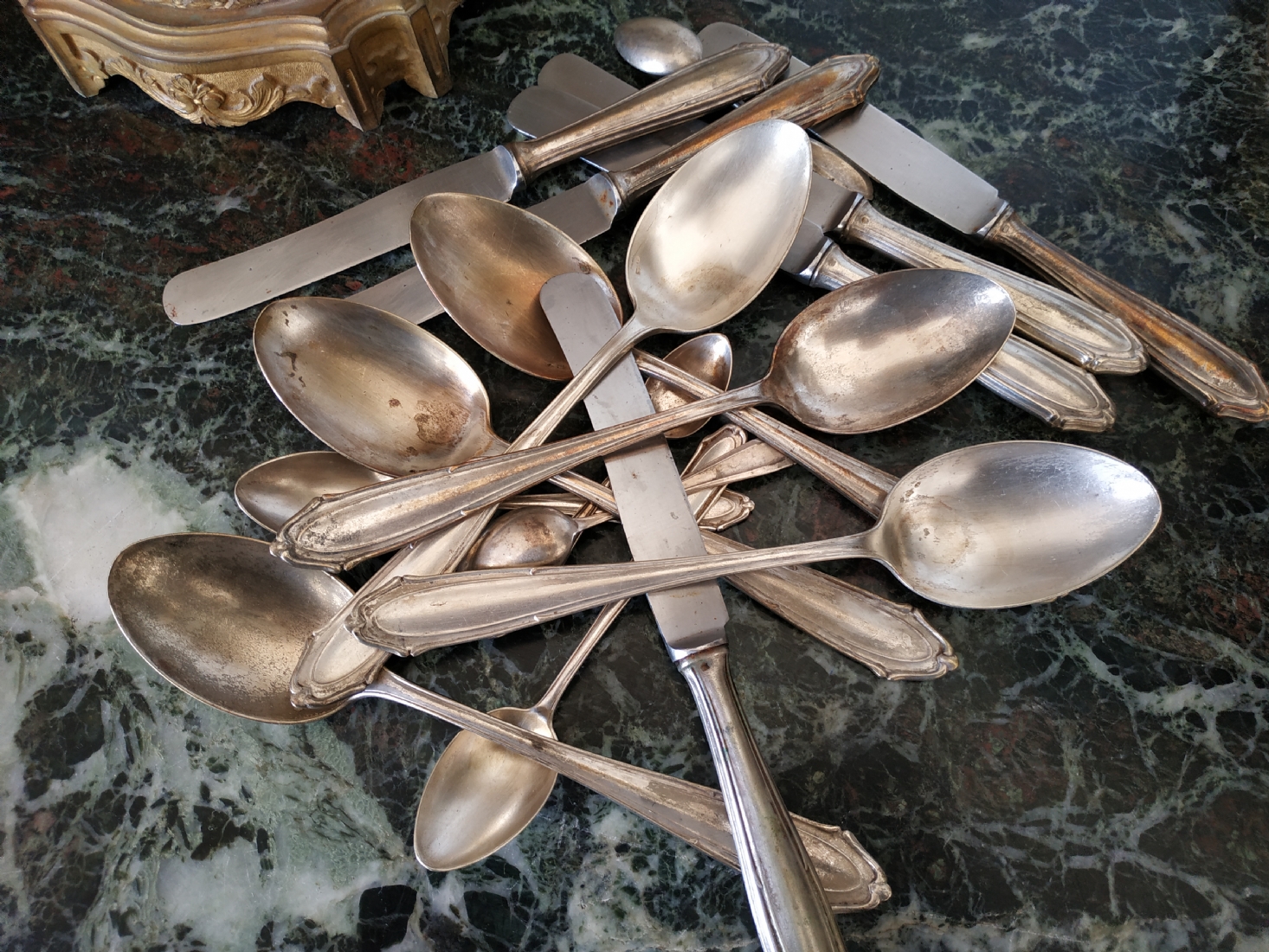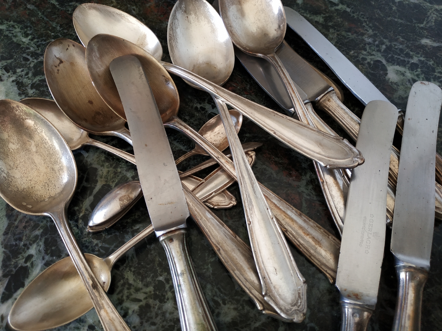 לוט של כלי כסף שונים עשויים כסף, חתומים (חותמות כסף פולני), משקל כולל (ללא הסכינים): 632 גרם. הלוט כולל: 6 כפות למרק באורך: 21.5 ס"מ, 2 כפיות באורך: 14 ס"מ, 2 כפיות באורך: 11 ס"מ, ו-6 סכינים שרק קליפת הידיות עשויה כסף.