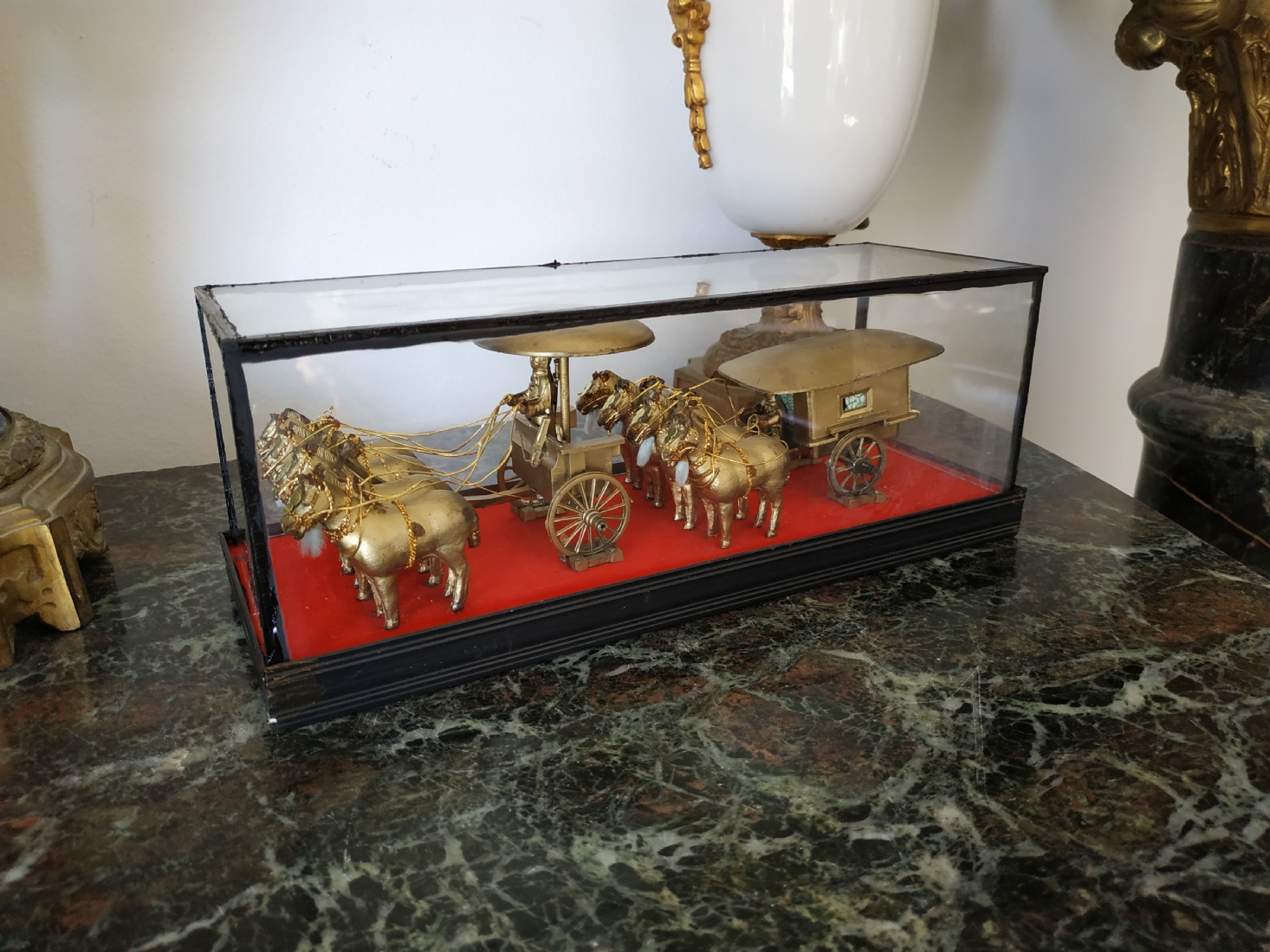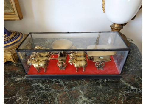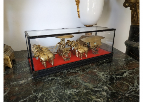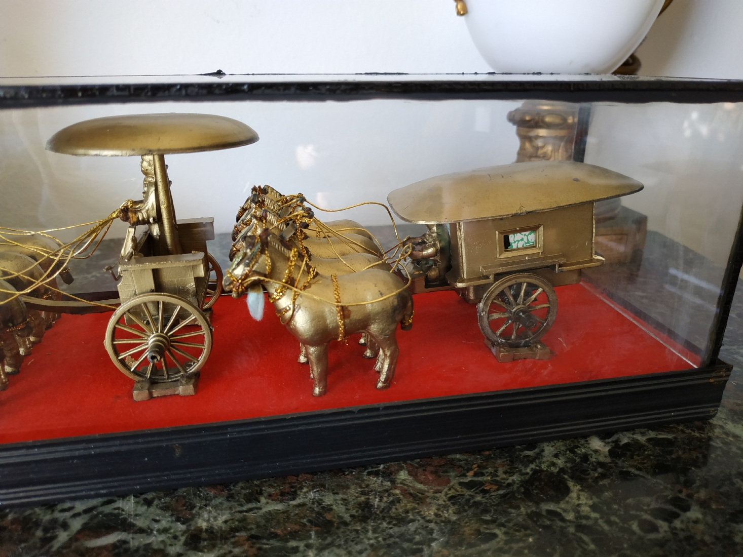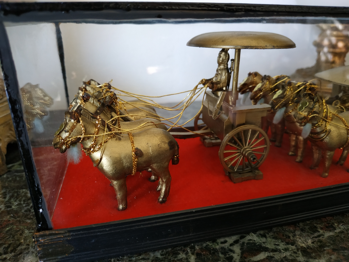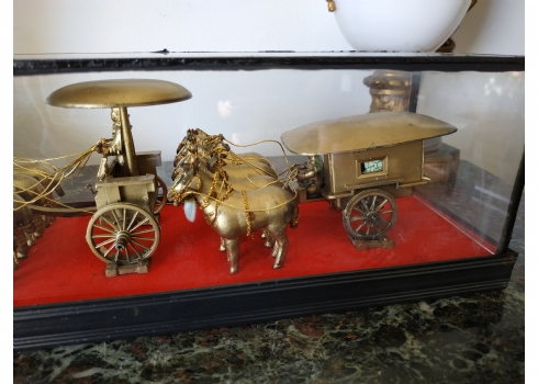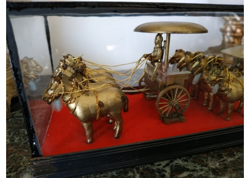 קישוט שולחני סיני עשוי מתכת מוזהבת, נתון בתוך תיבת זכוכית, מידות התיבה, גובה: 10 ס"מ, אורך: 26 ס"מ.