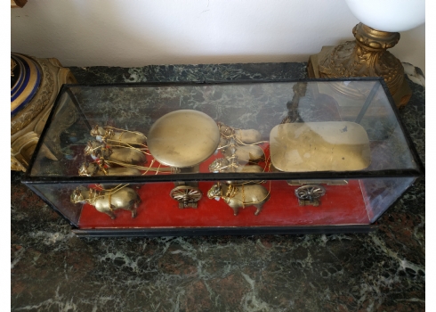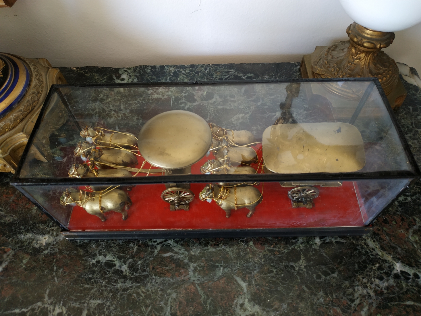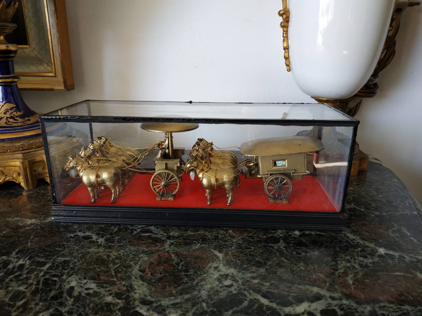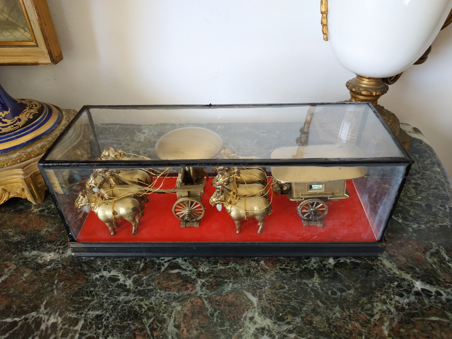 קישוט שולחני סיני עשוי מתכת מוזהבת, נתון בתוך תיבת זכוכית, מידות התיבה, גובה: 10 ס"מ, אורך: 26 ס"מ.