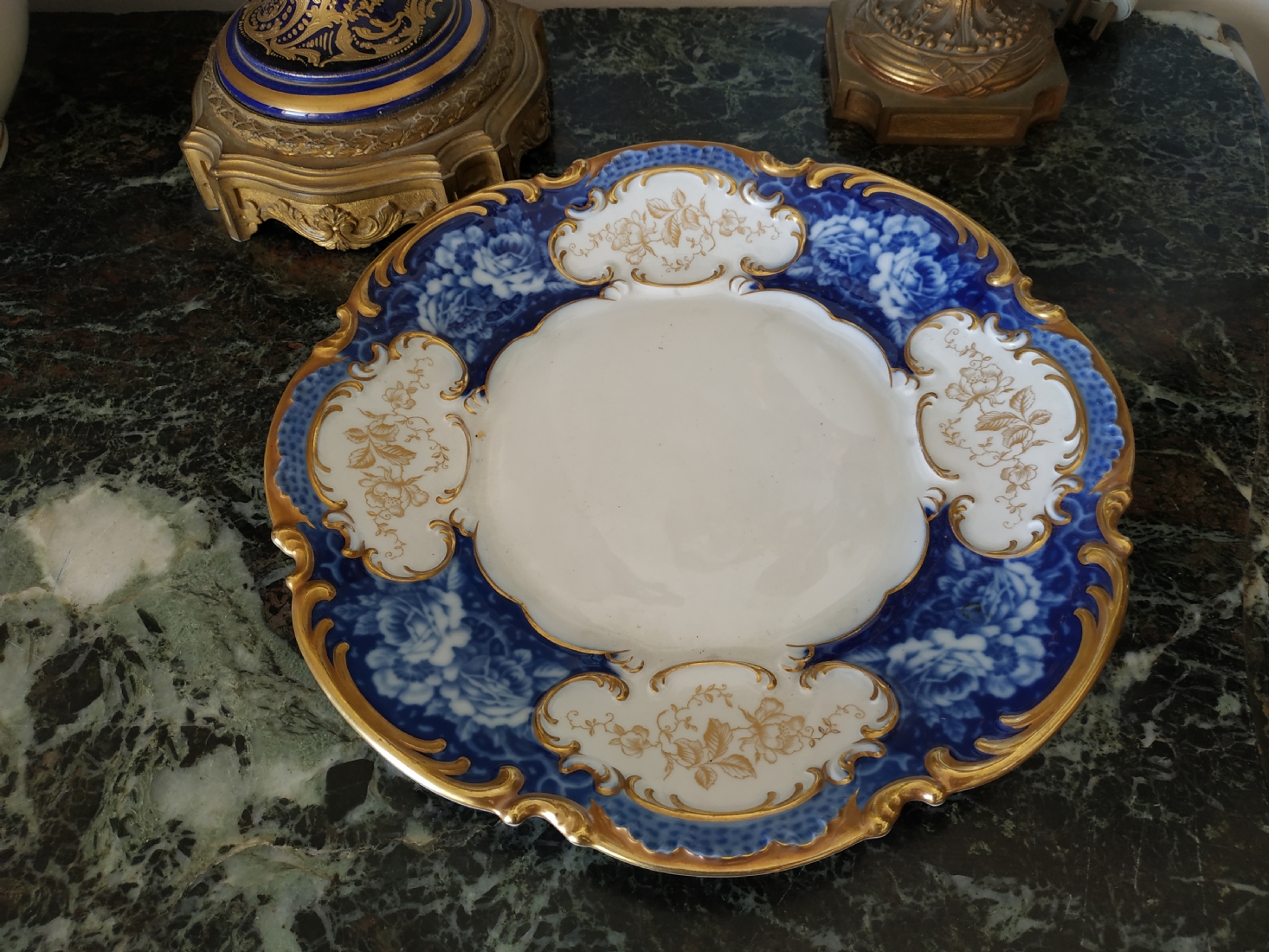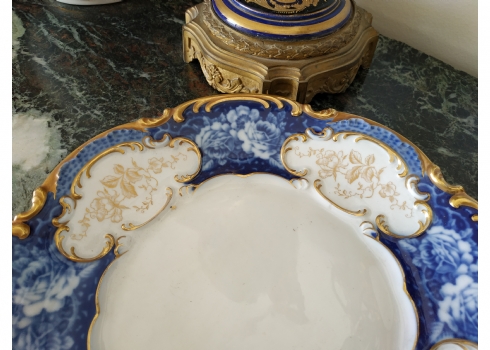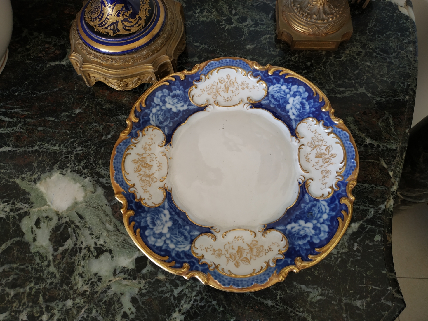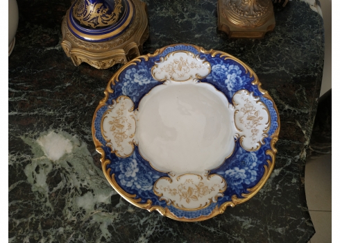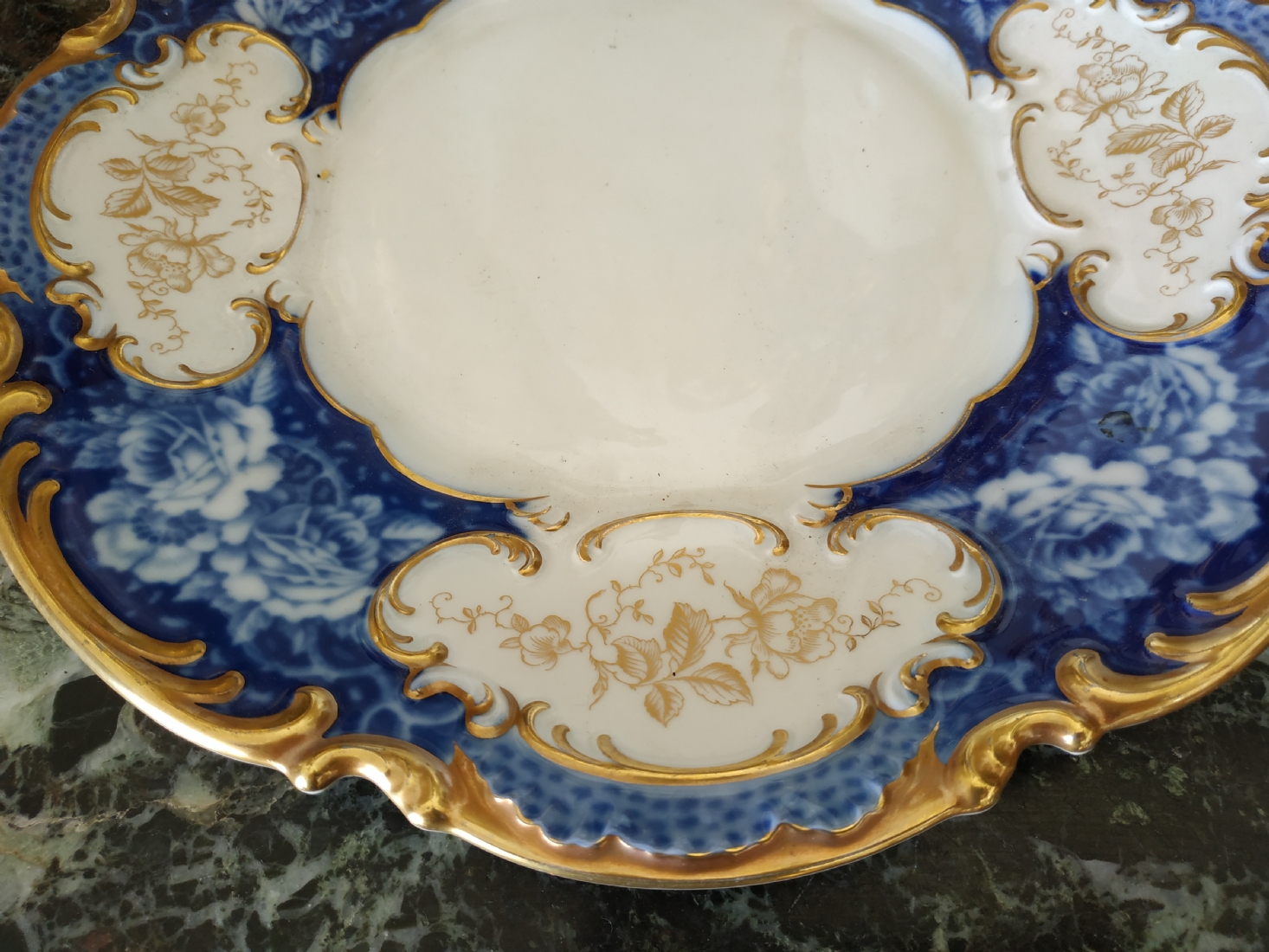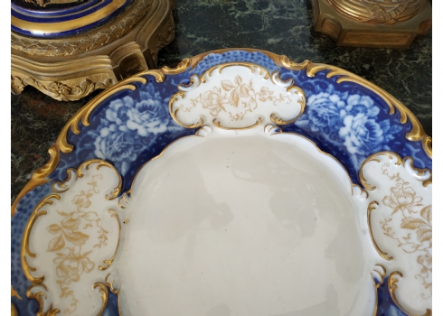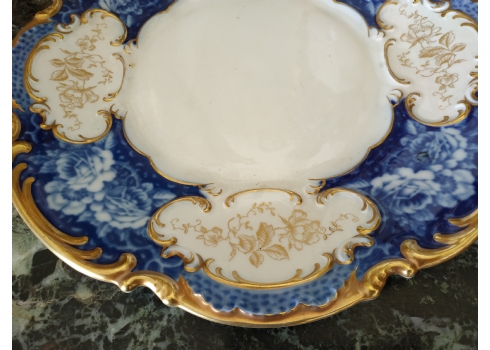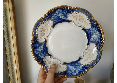 צלחת פורצלן גרמנית גדולה, מתוצרת: 'הוטשנרוייטר' (Hutschenreuther), מעוטרת בזהב וקובלט כחול, חתומה, קוטר: 28.5 ס"מ.
