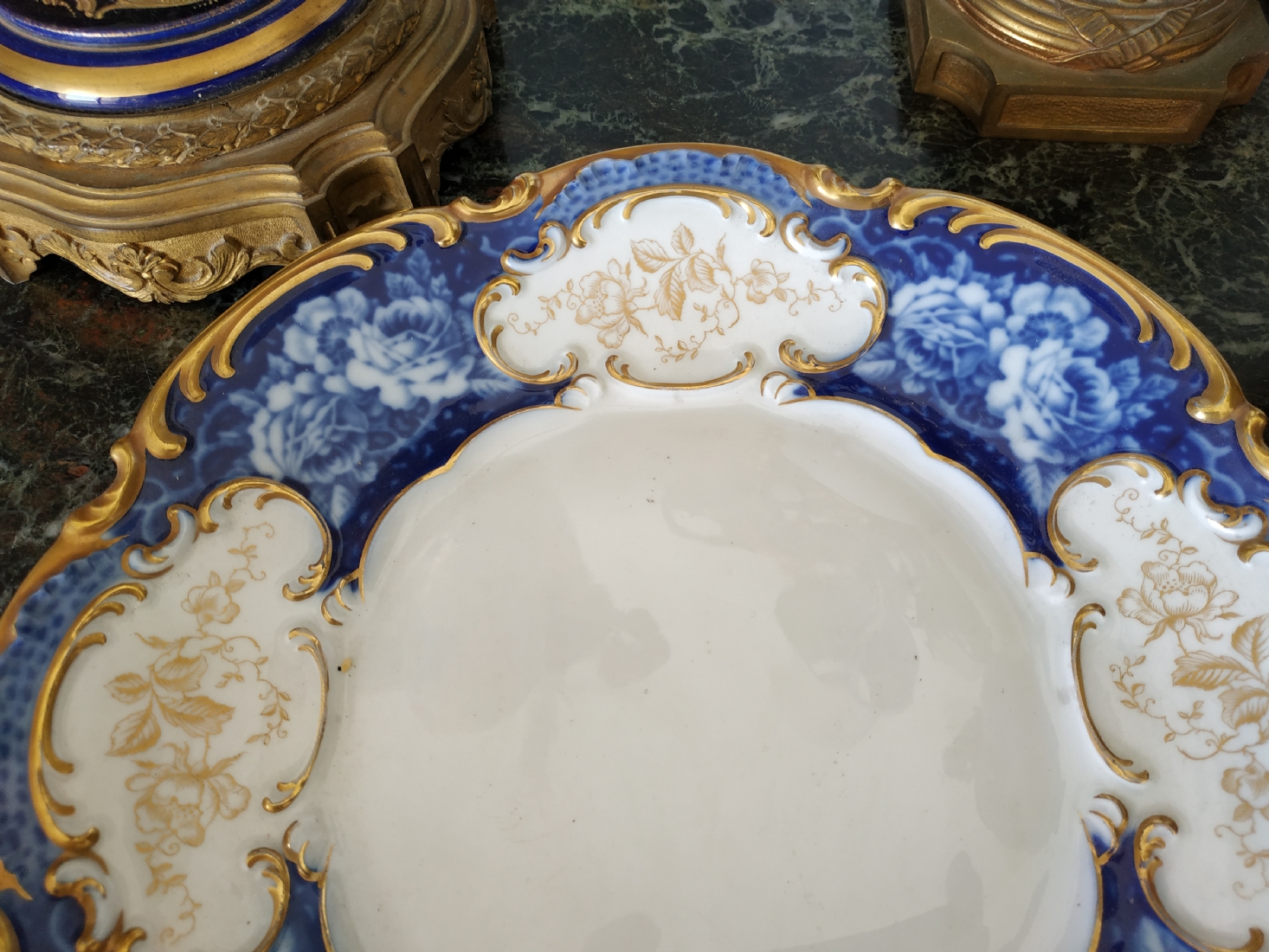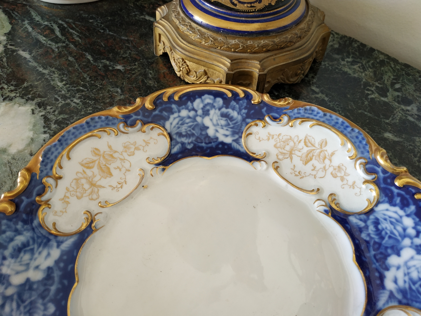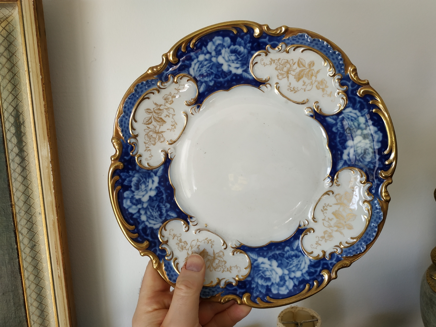 צלחת פורצלן גרמנית גדולה, מתוצרת: 'הוטשנרוייטר' (Hutschenreuther), מעוטרת בזהב וקובלט כחול, חתומה, קוטר: 28.5 ס"מ.