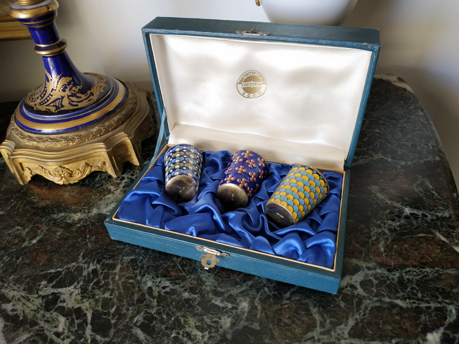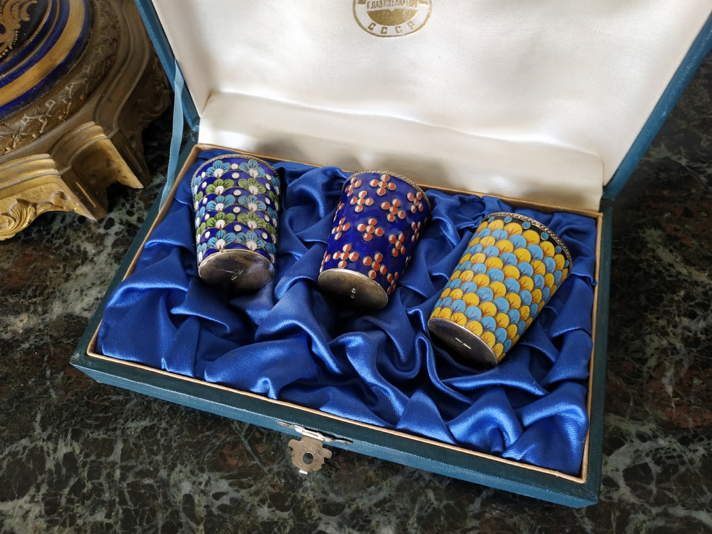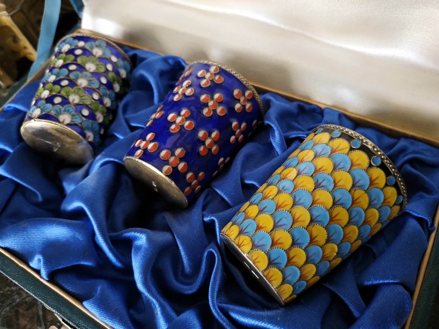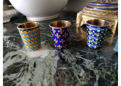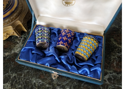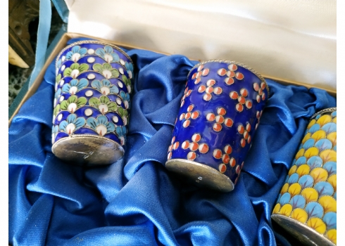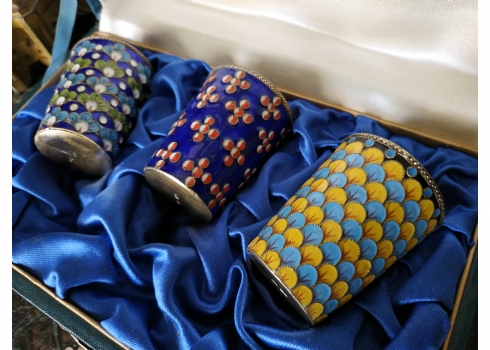 סט רוסי (סובייטי) ישן, הכולל שלוש כוסיות עשויות כסף ומעוטרות אמייל, חותמות כסף רוסיות (כסף: '916'), משקל הכוסות: 120 גרם סה"כ, באריזה מקורית, גובה כוסית: 5 ס"מ.