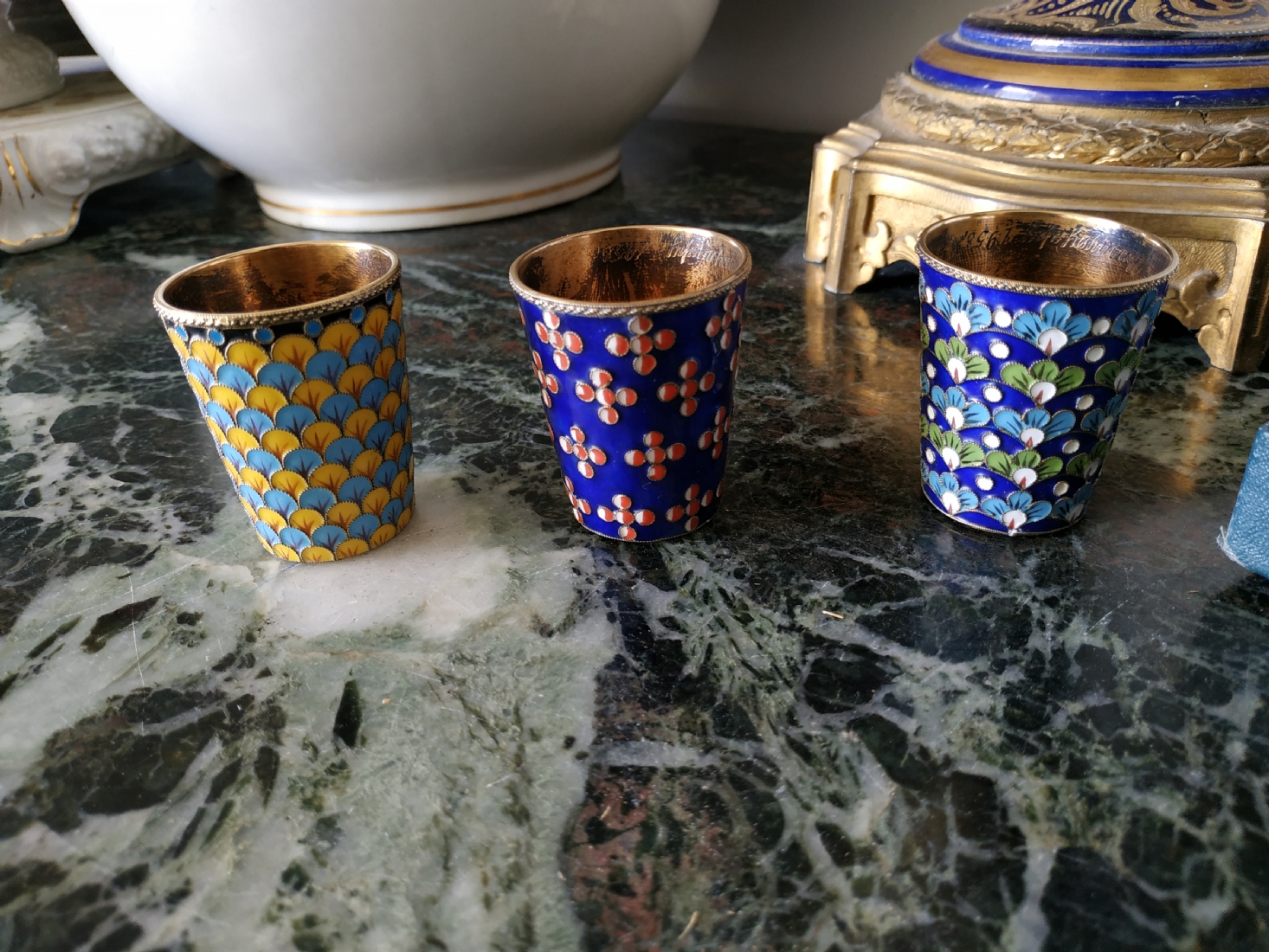 סט רוסי (סובייטי) ישן, הכולל שלוש כוסיות עשויות כסף ומעוטרות אמייל