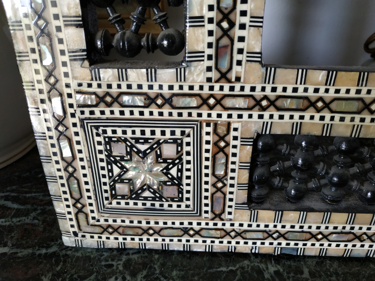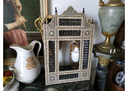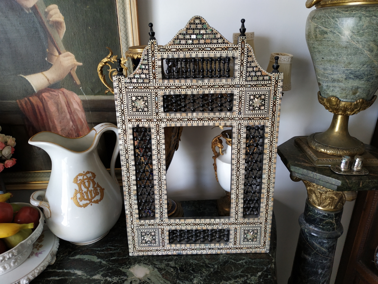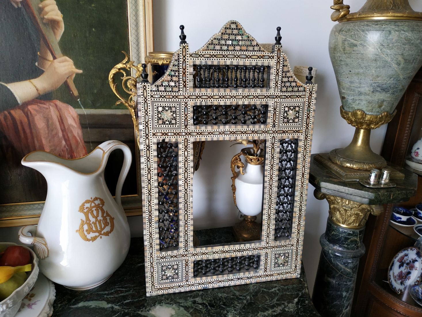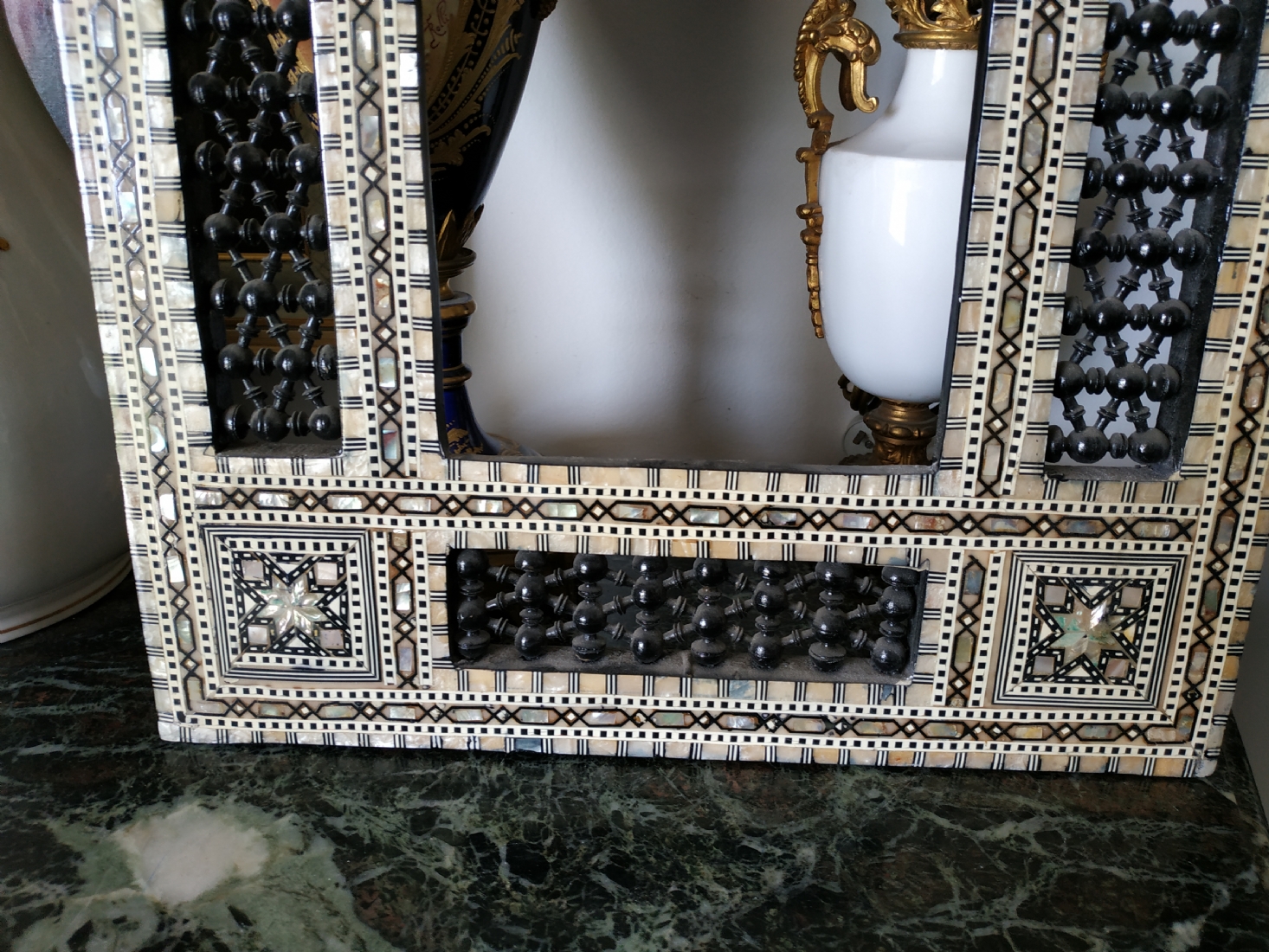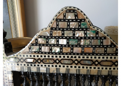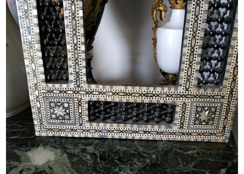 מסגרת סורית למראה, עשויה עץ משובצת פיסות צדף בעבודת דמשק, גובה: 70 ס"מ, רוחב: 45 ס"מ.