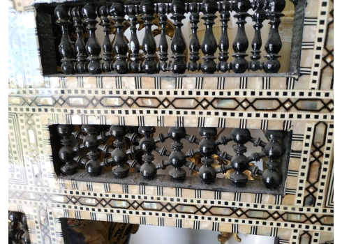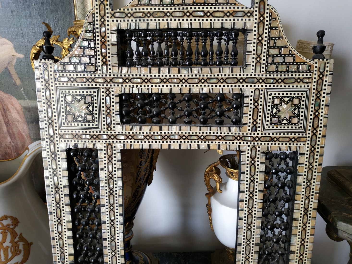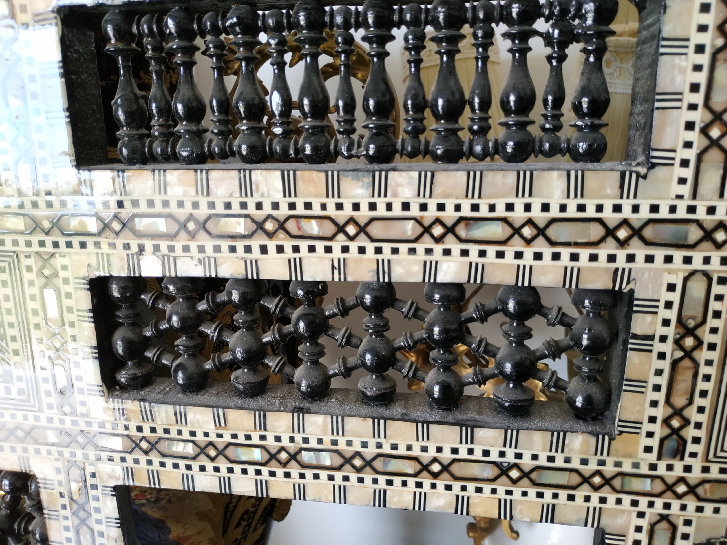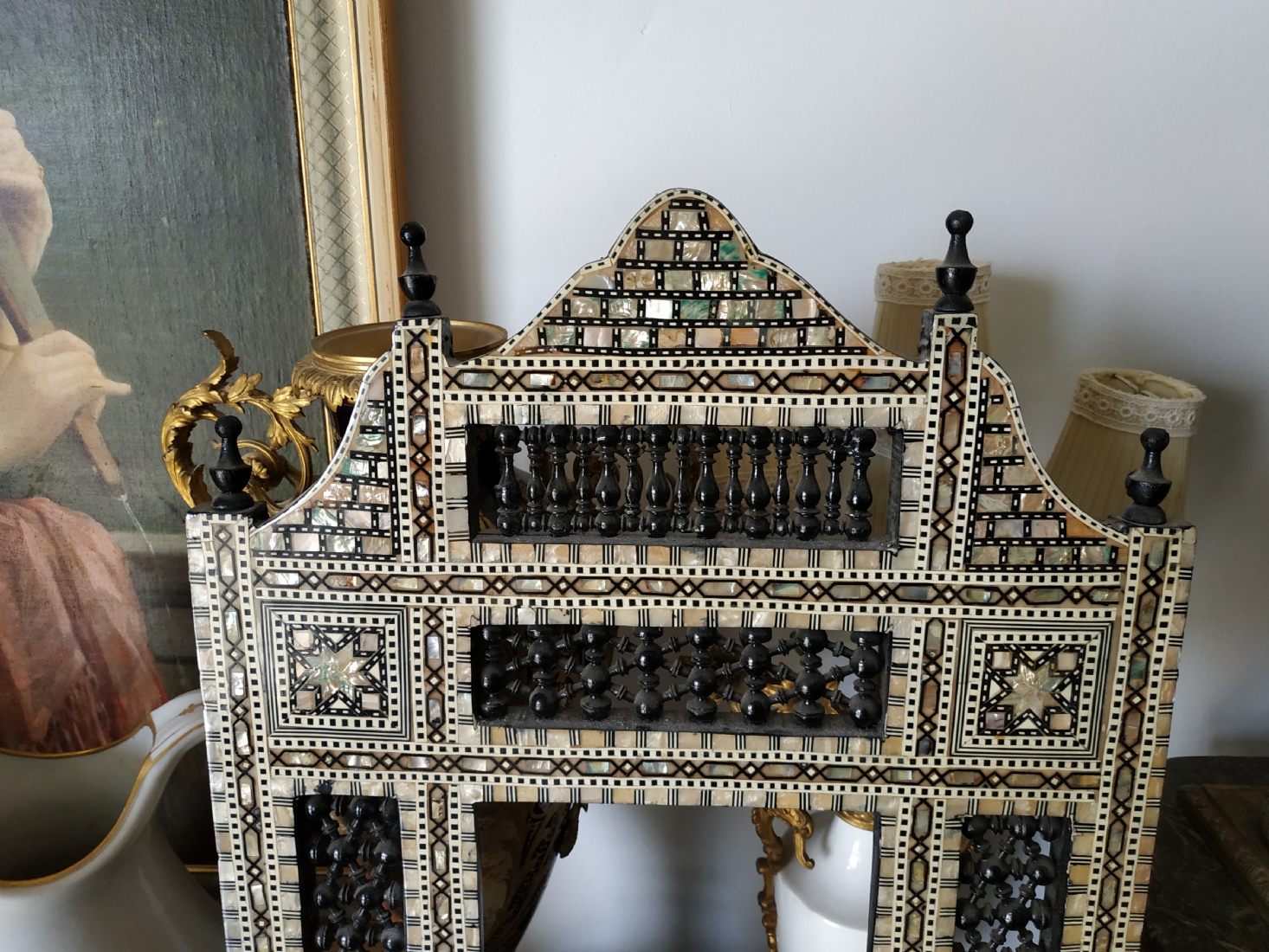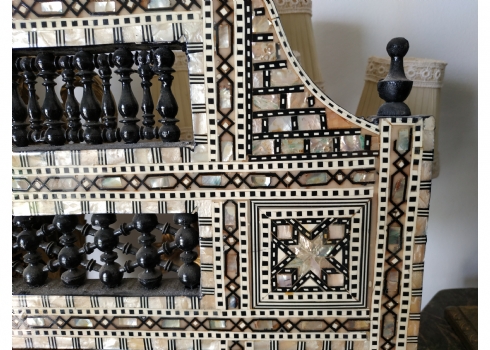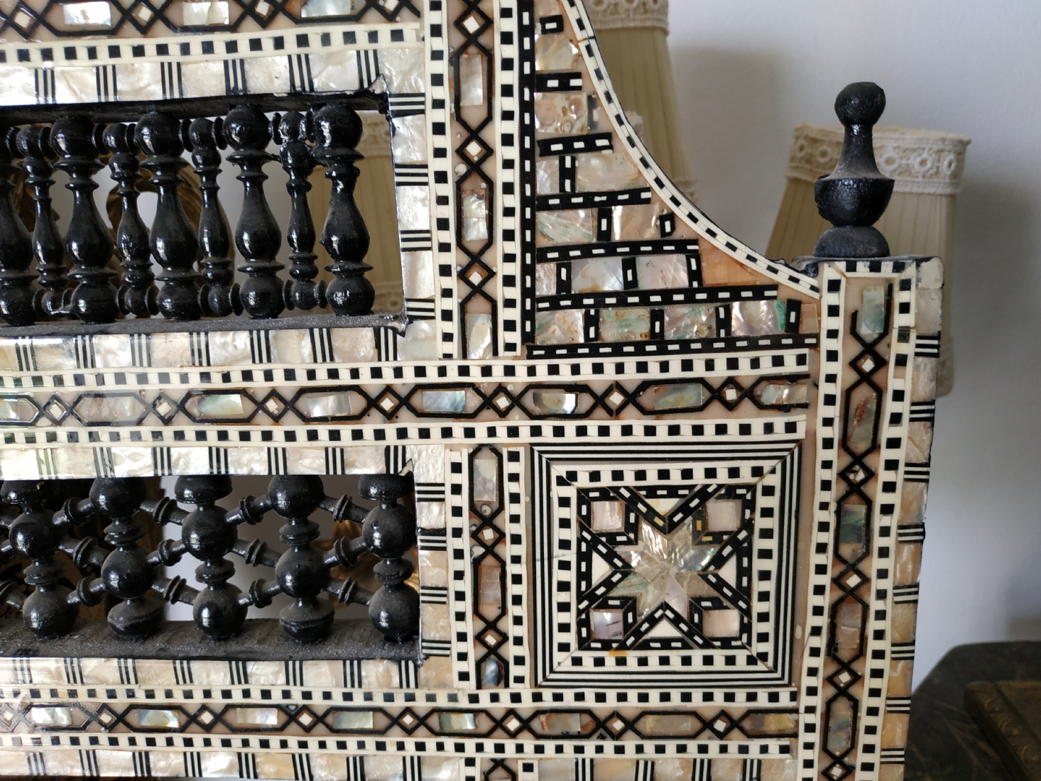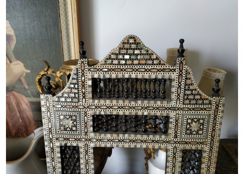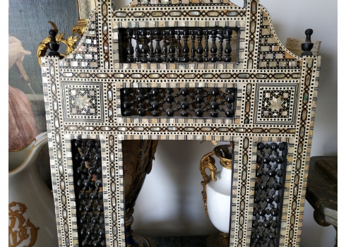 מסגרת סורית למראה, עשויה עץ משובצת פיסות צדף בעבודת דמשק, גובה: 70 ס"מ, רוחב: 45 ס"מ.