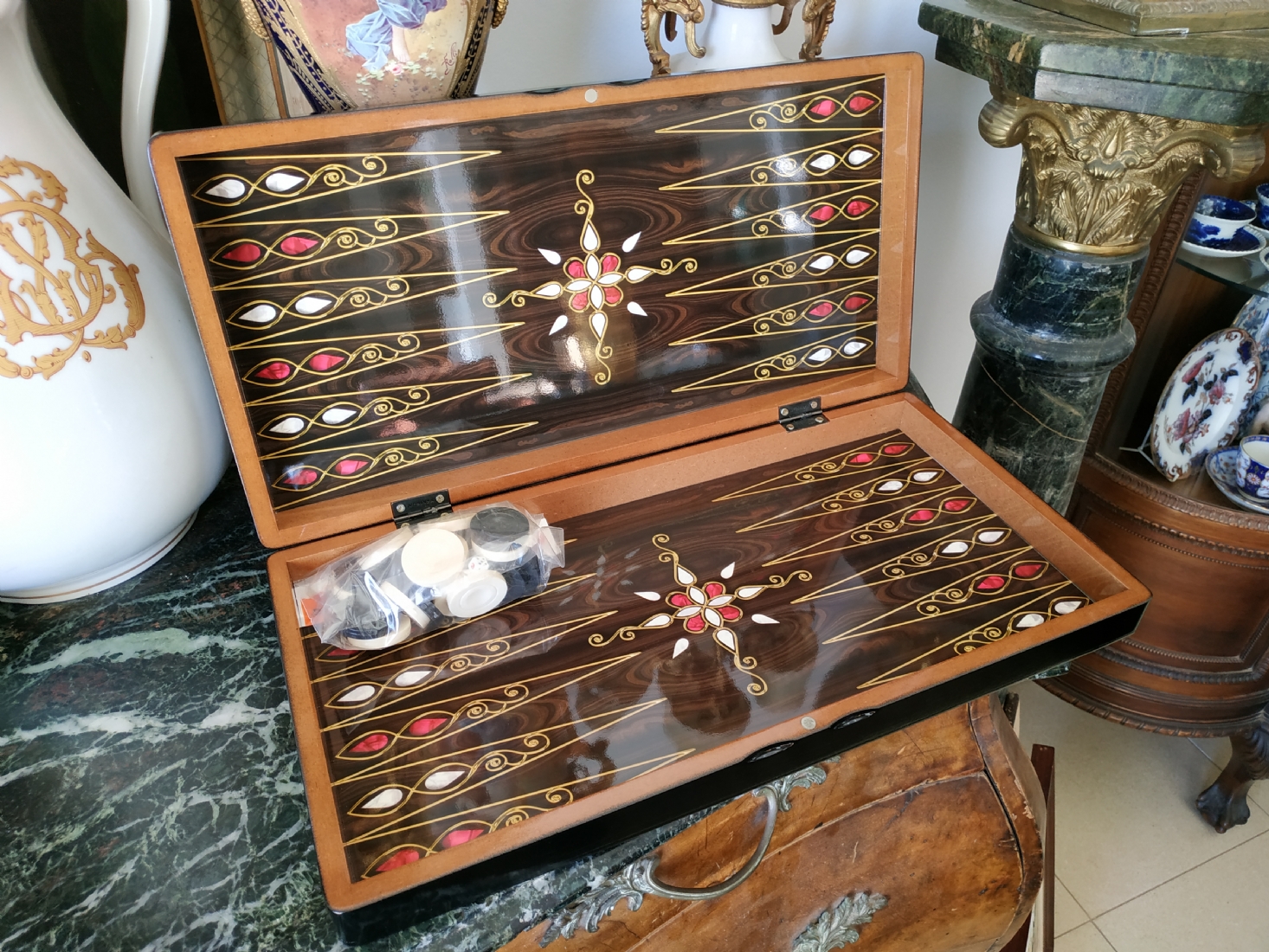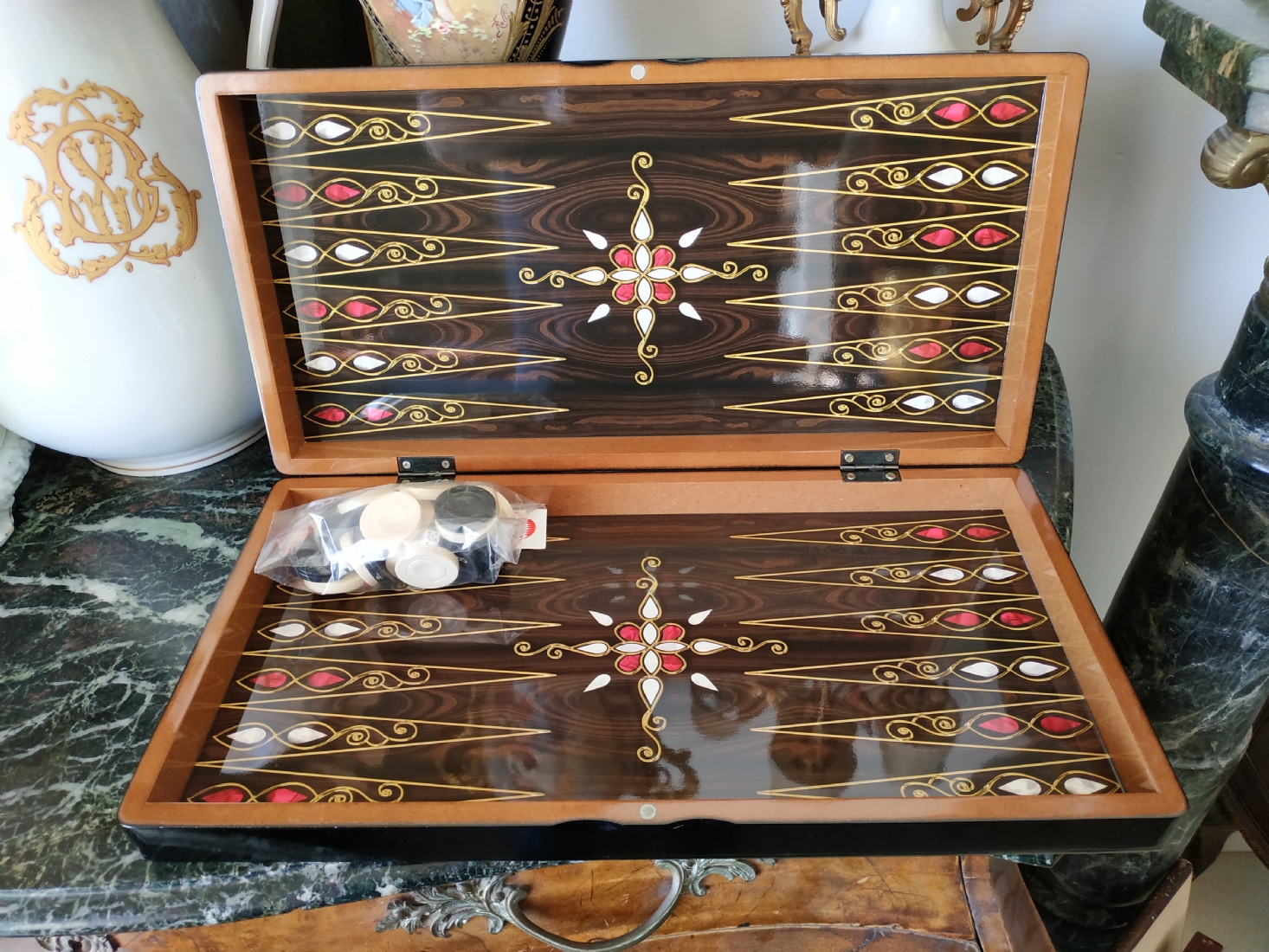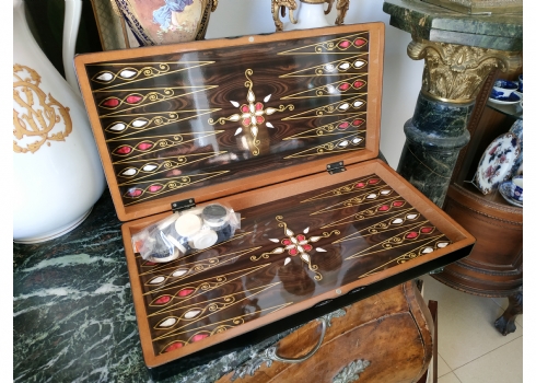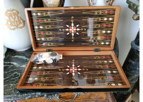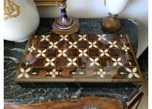 ערכת שש בש בסגנון סורי עשויה עץ מעוטר בסגנון 'עבודת דמשק', מידות הלוח במצב סגור: 24X48 ס"מ.