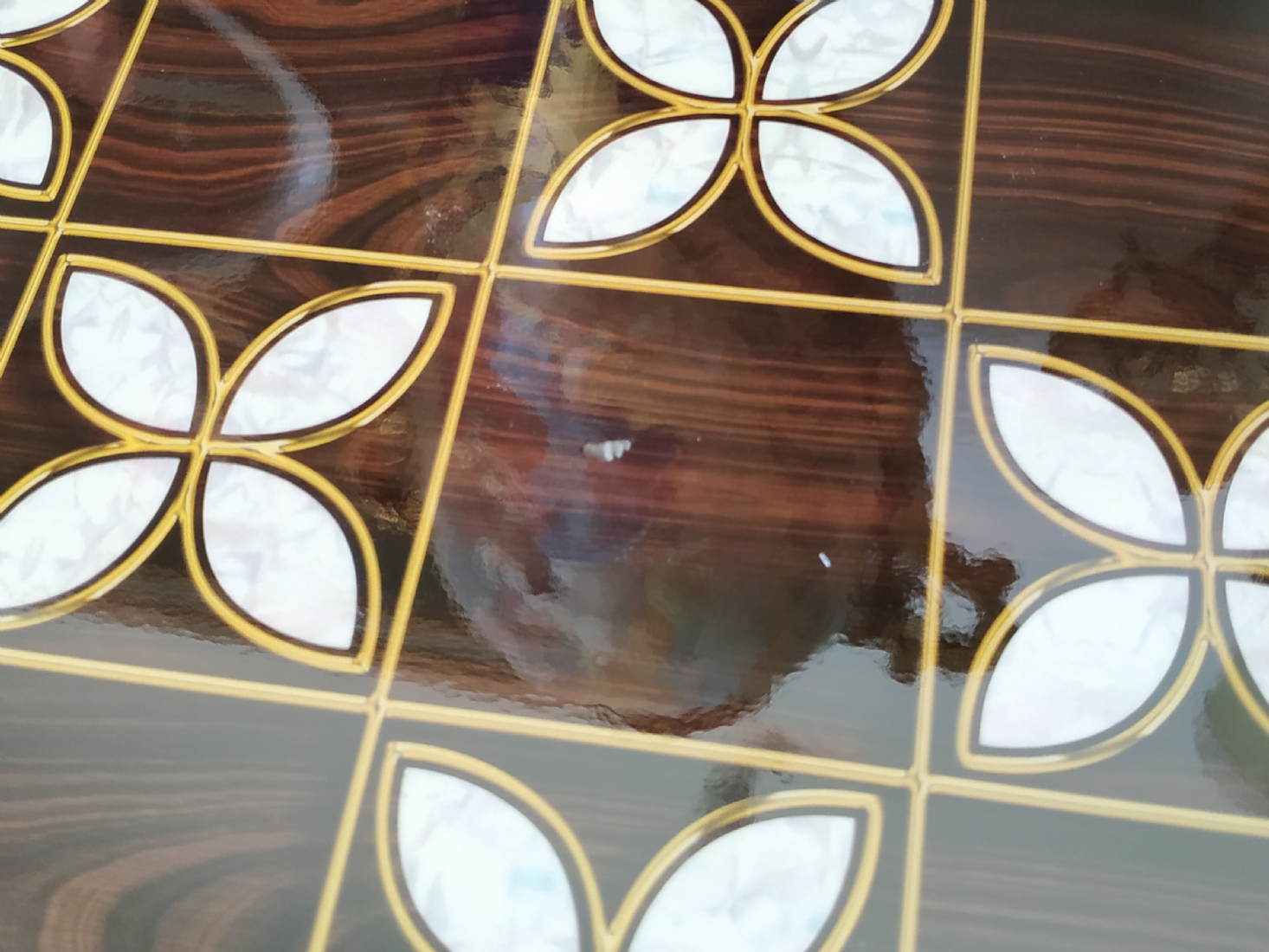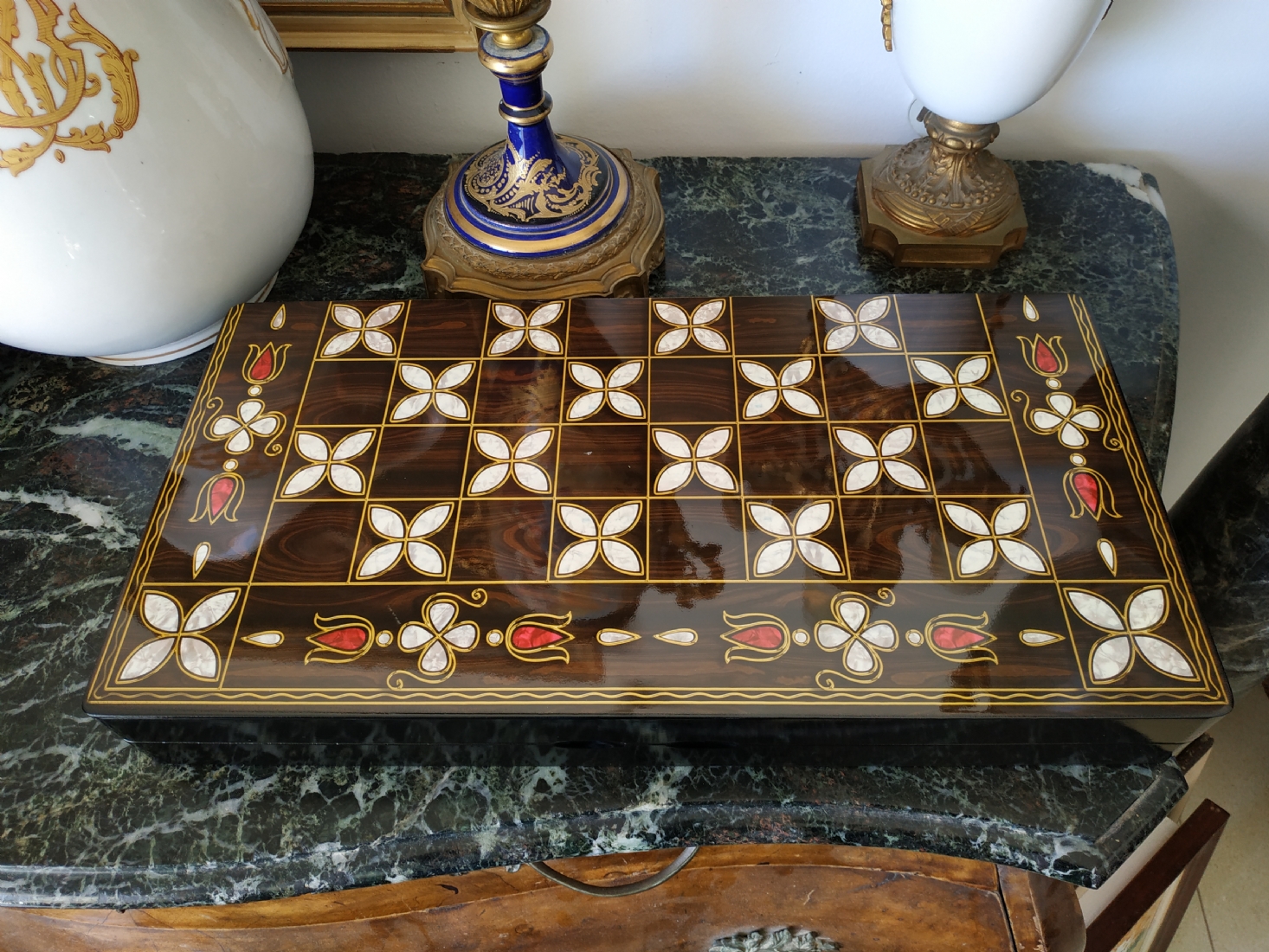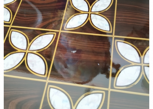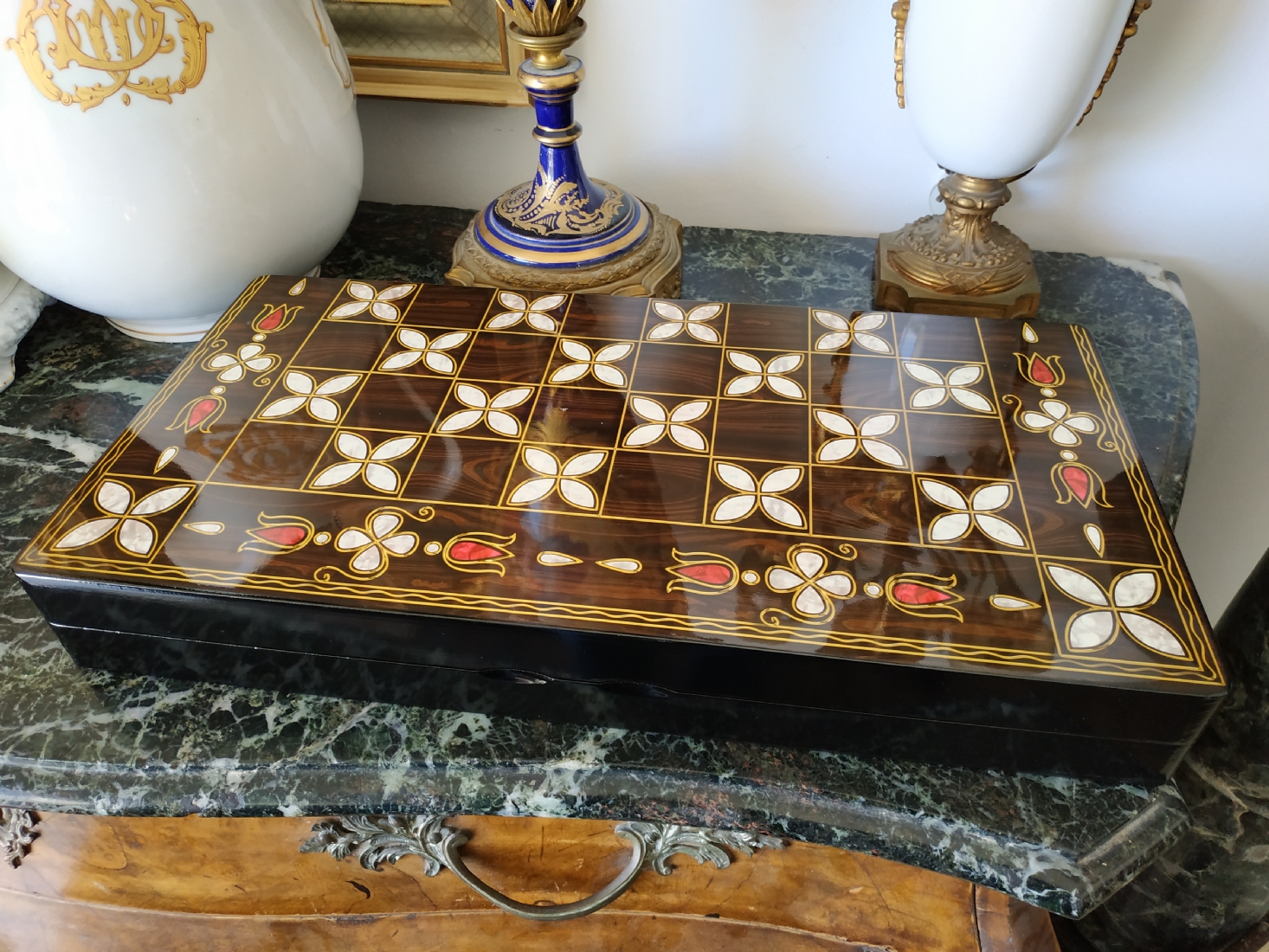 ערכת שש בש בסגנון סורי עשויה עץ מעוטר בסגנון 'עבודת דמשק', מידות הלוח במצב סגור: 24X48 ס"מ.