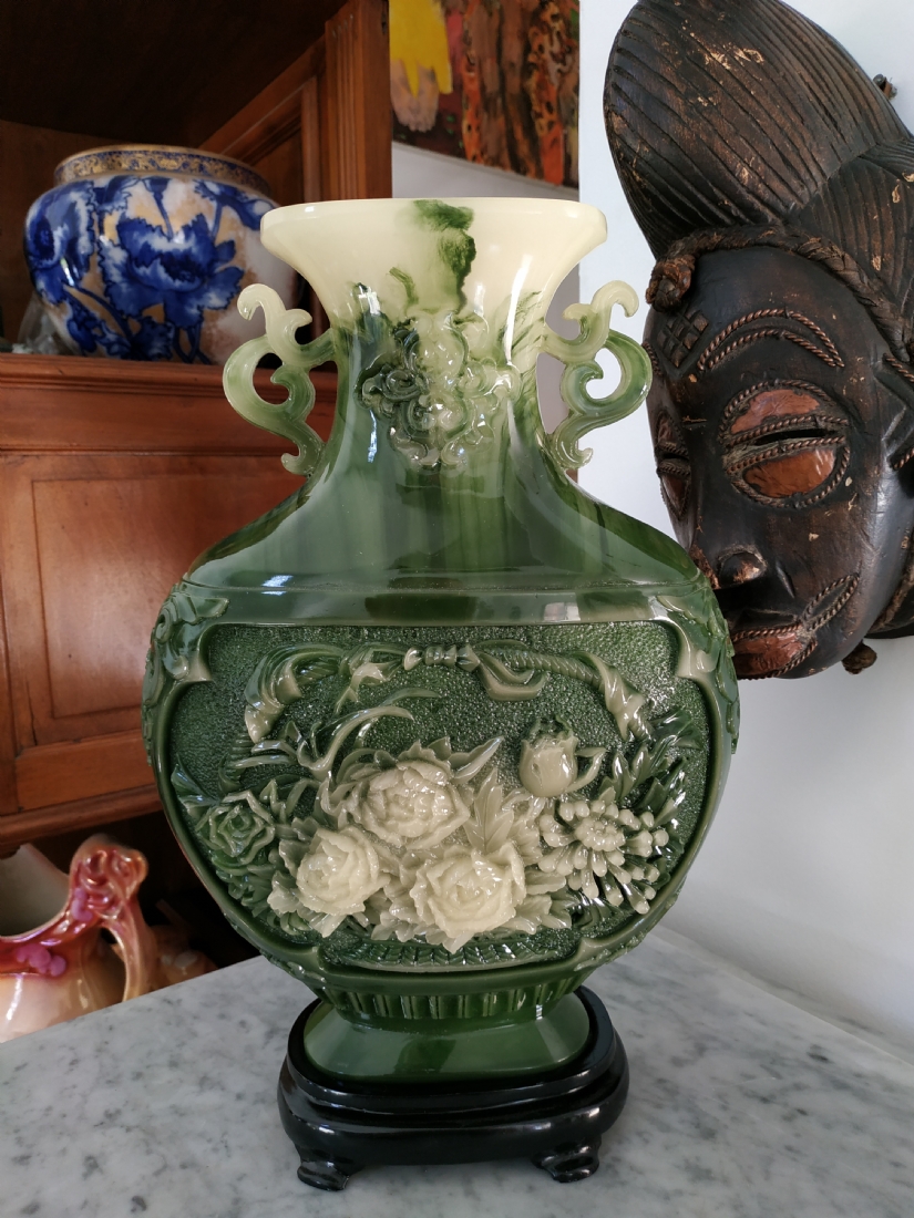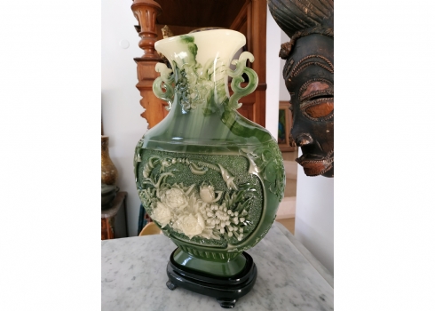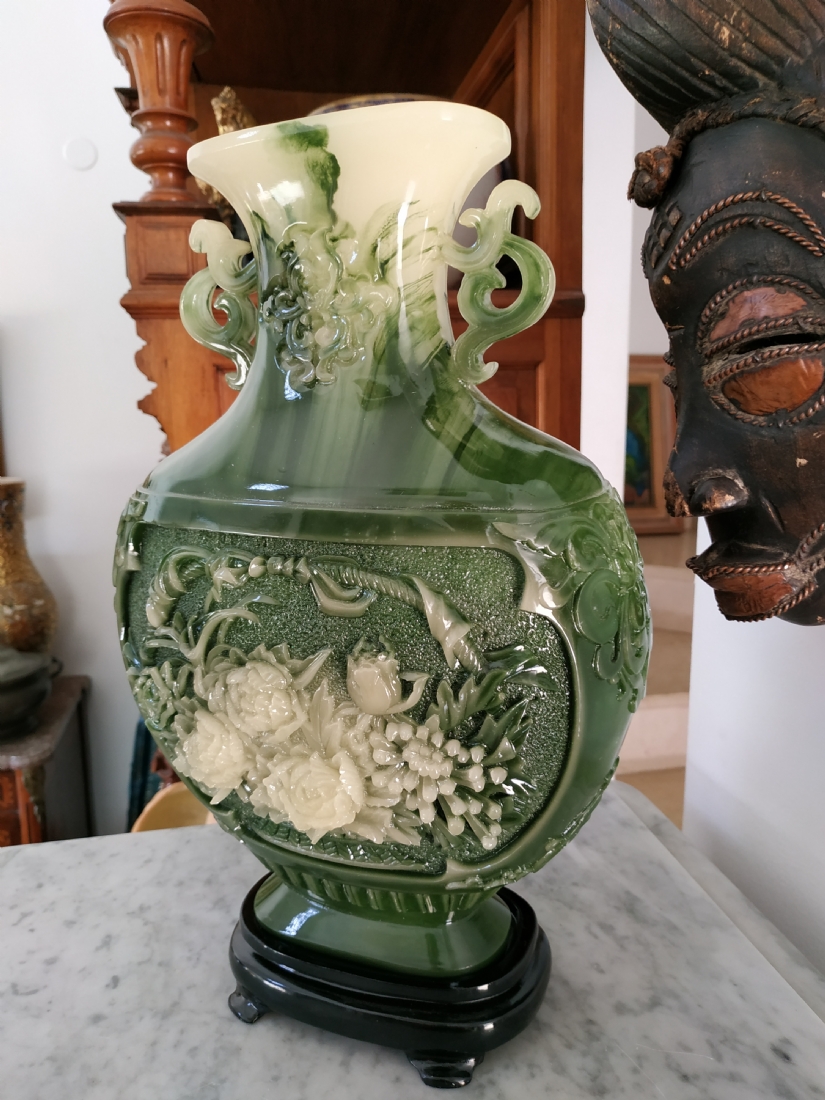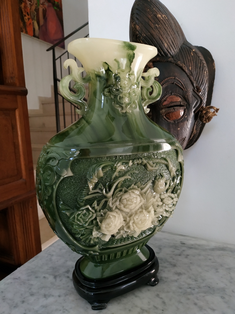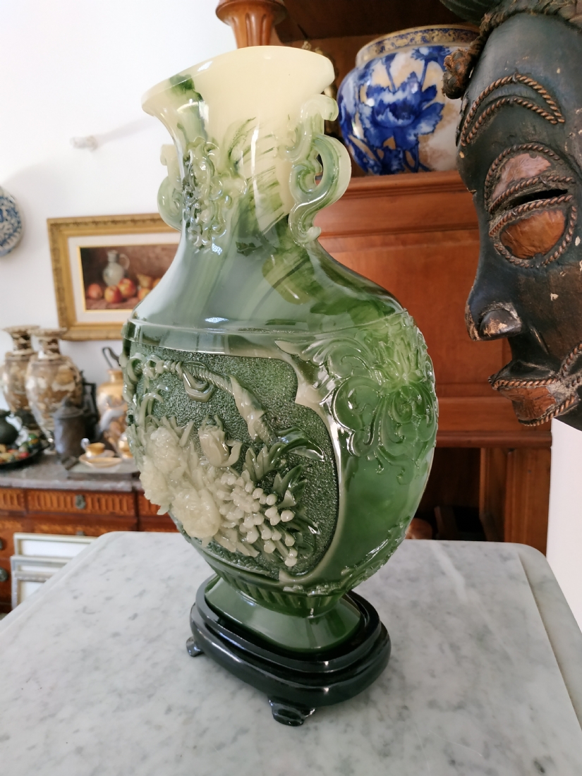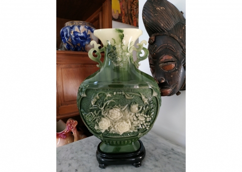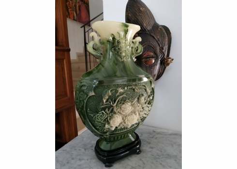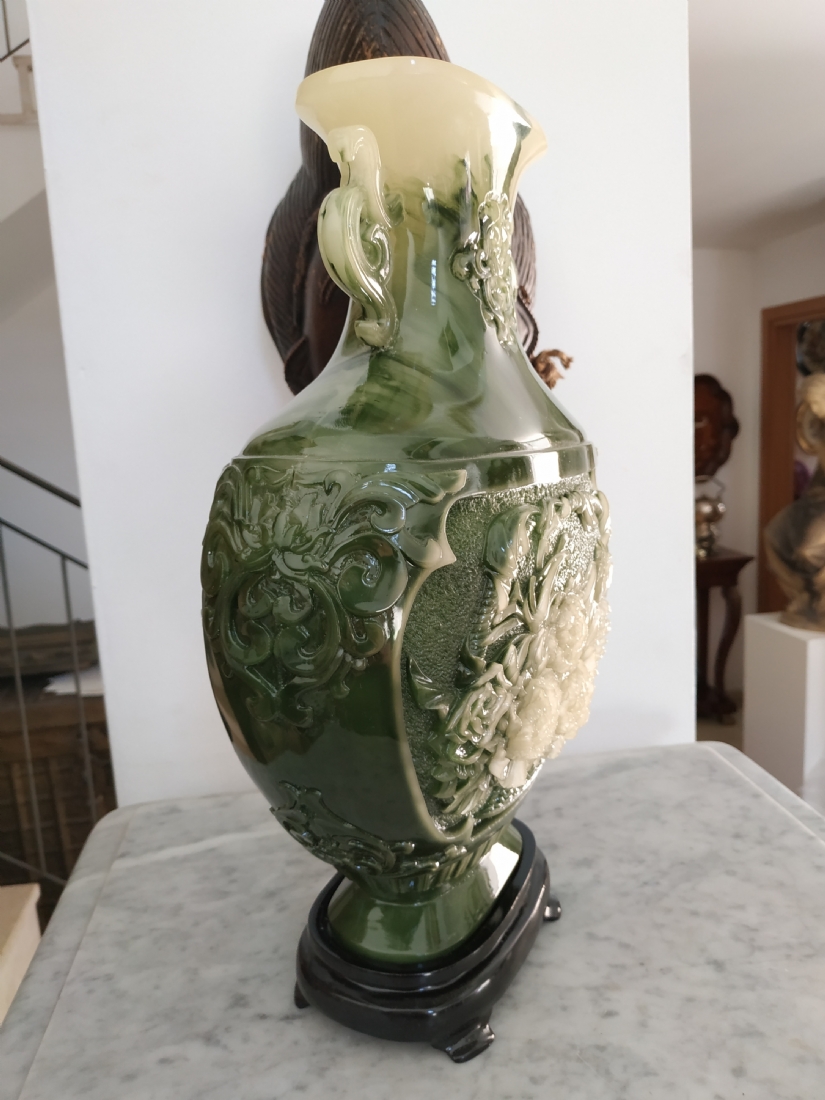 אגרטל סיני מרשים ויפה מאד, עשוי חומר יצוק דמוי ג'ייד, רוחב: 22 ס"מ, גובה: 34.5 ס"מ.