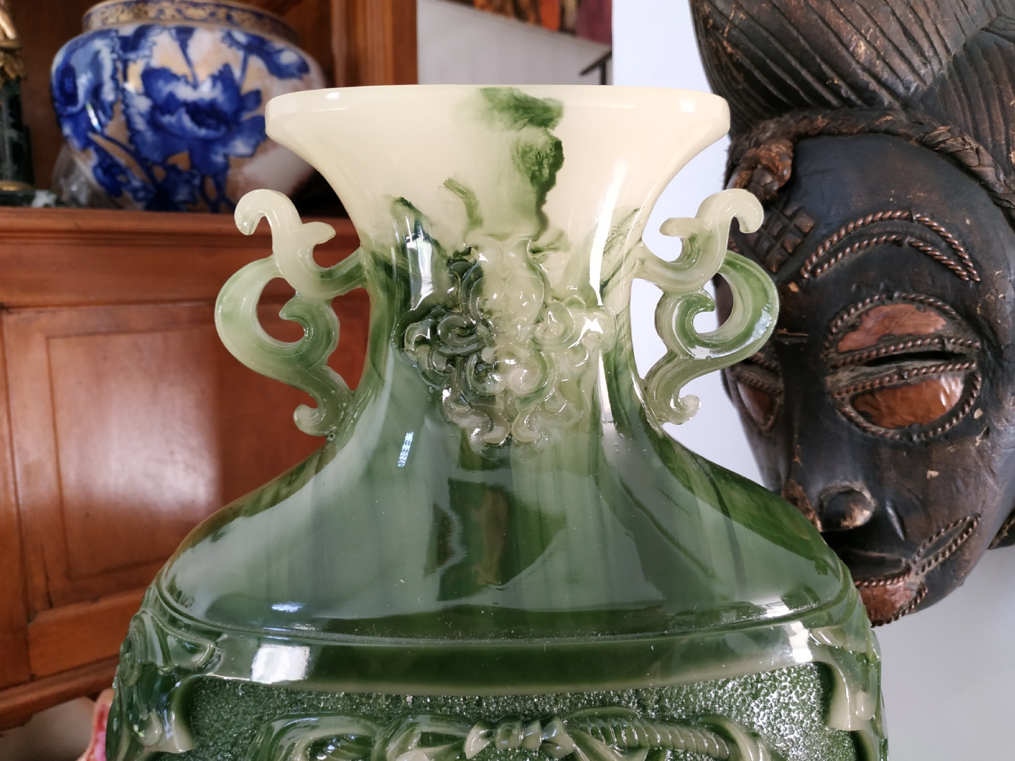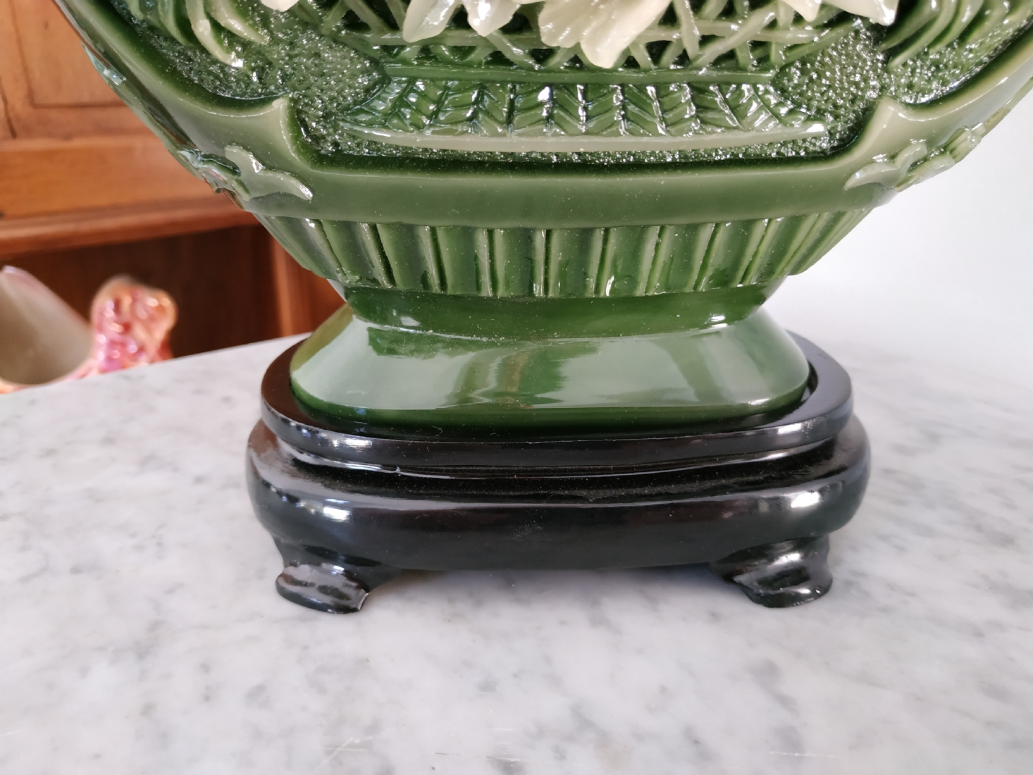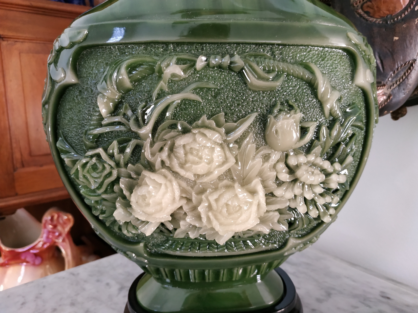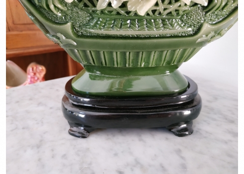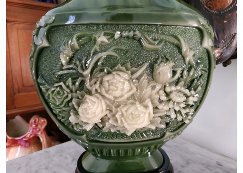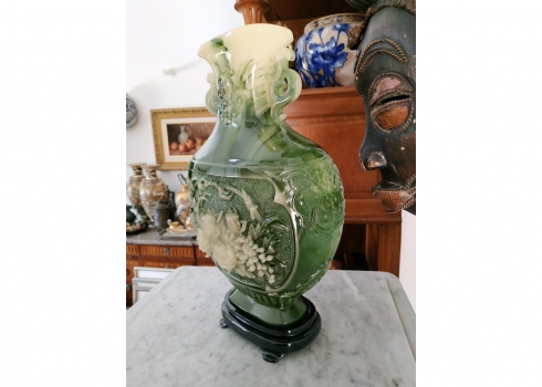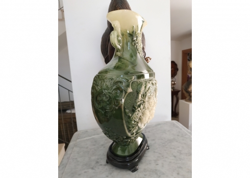 אגרטל סיני מרשים ויפה מאד, עשוי חומר יצוק דמוי ג'ייד, רוחב: 22 ס"מ, גובה: 34.5 ס"מ.