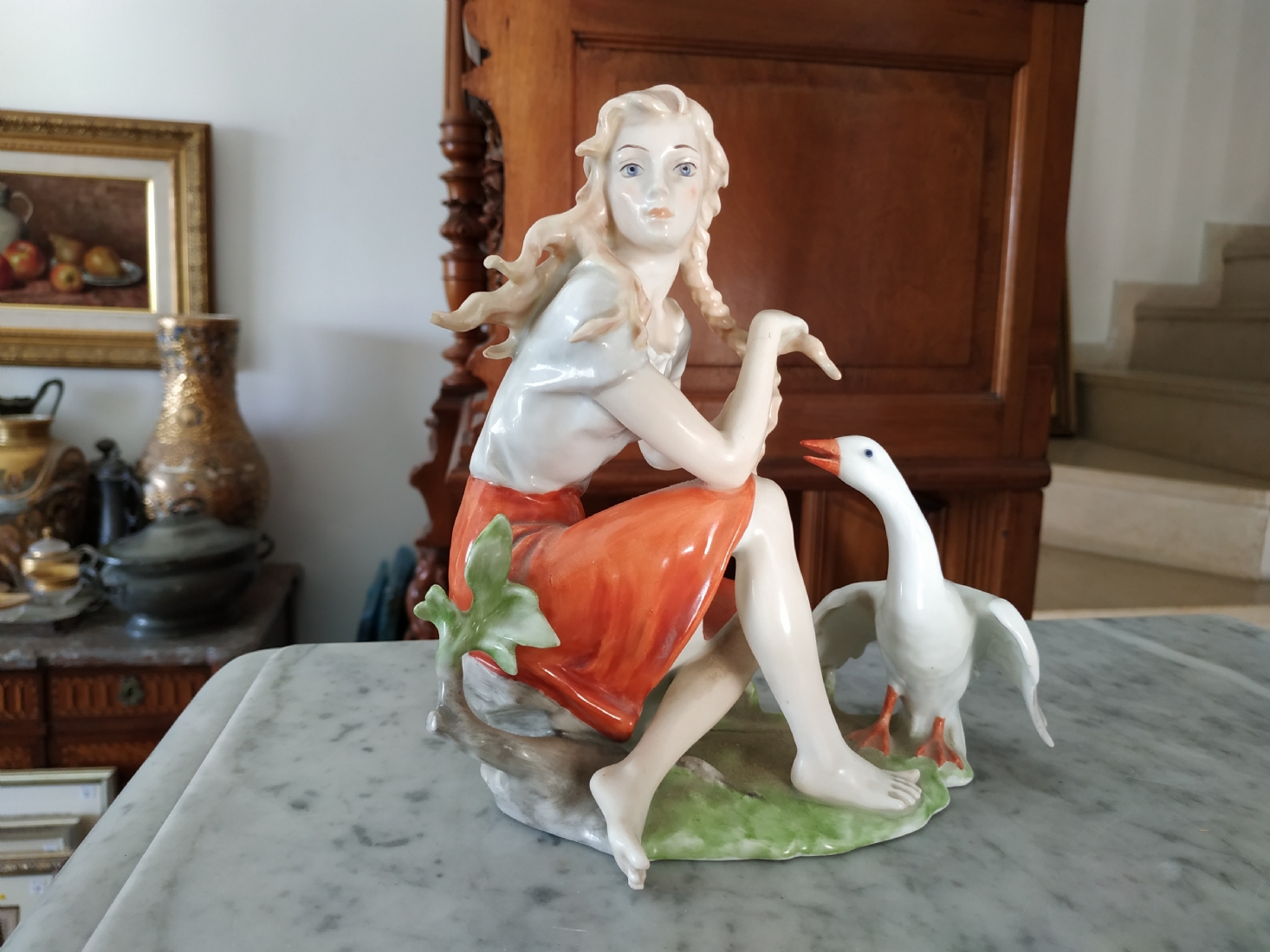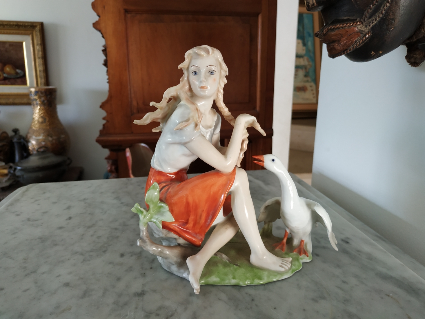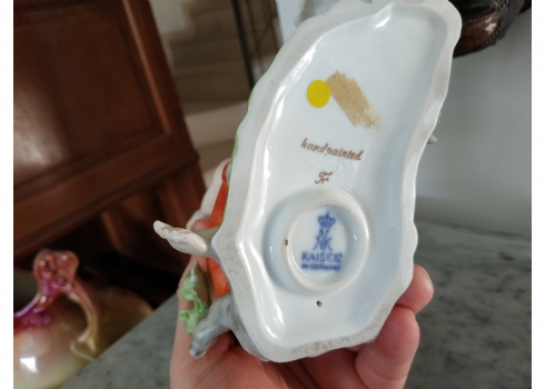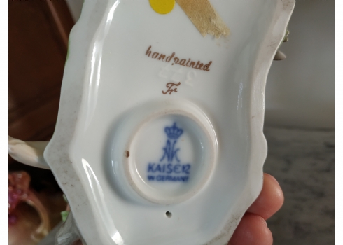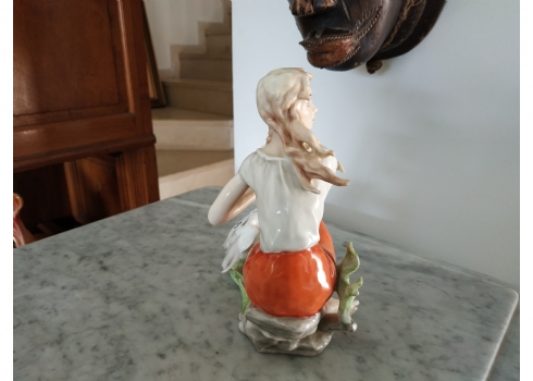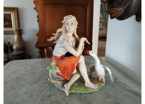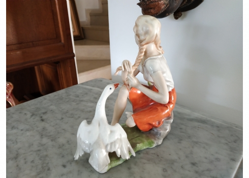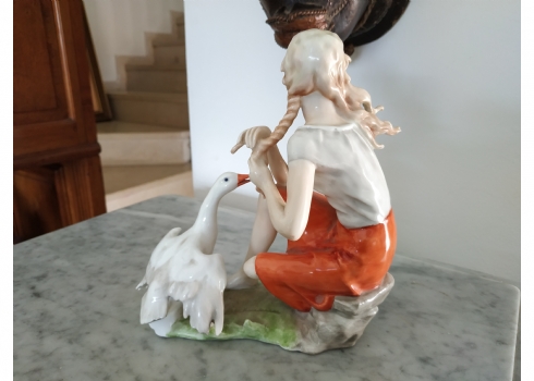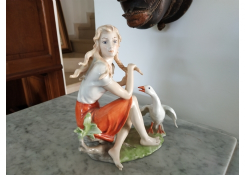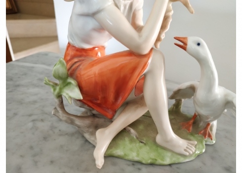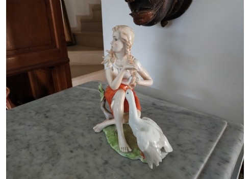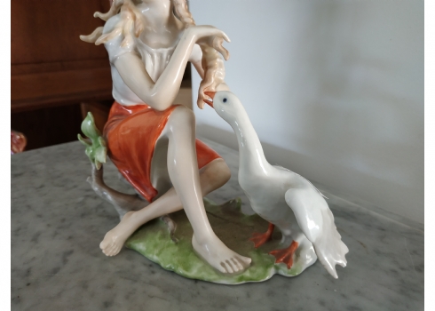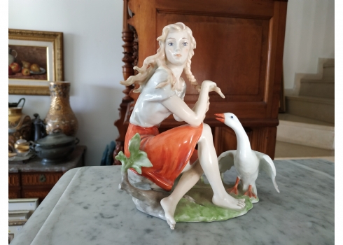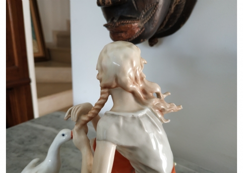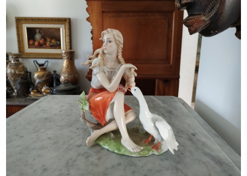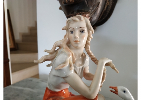פסלון פורצלן גרמני ישן מתוצרת: 'Kaiser', בדמות נערה שחולמת לפרוץ כדוגמנית התתרנית הראשונה ולכבוש את מסלולי האופנה ואווז מעריץ - מעוטר בצביעת יד וחתום, רוחב: 16 ס"מ, גובה: 18 ס"מ.