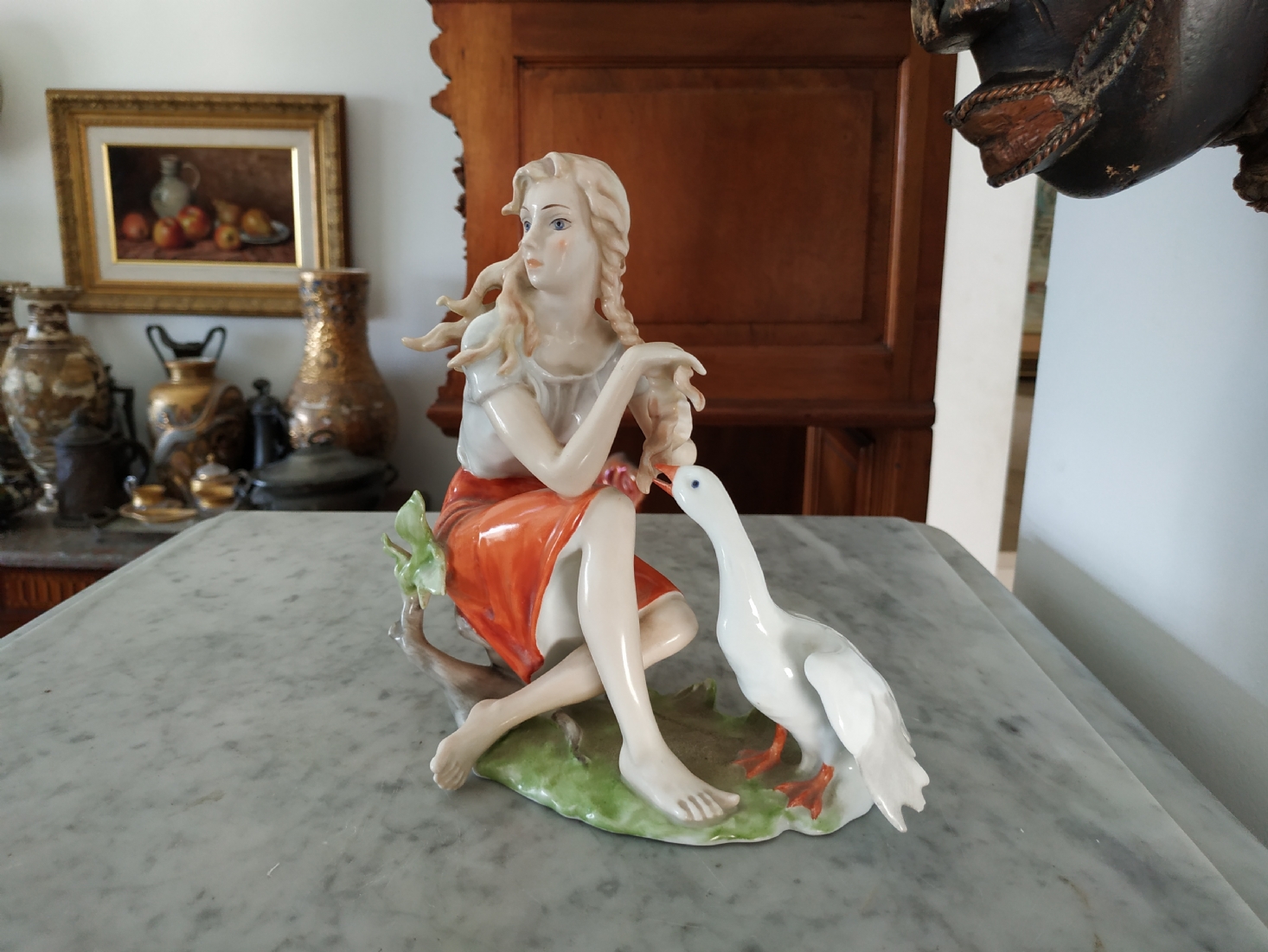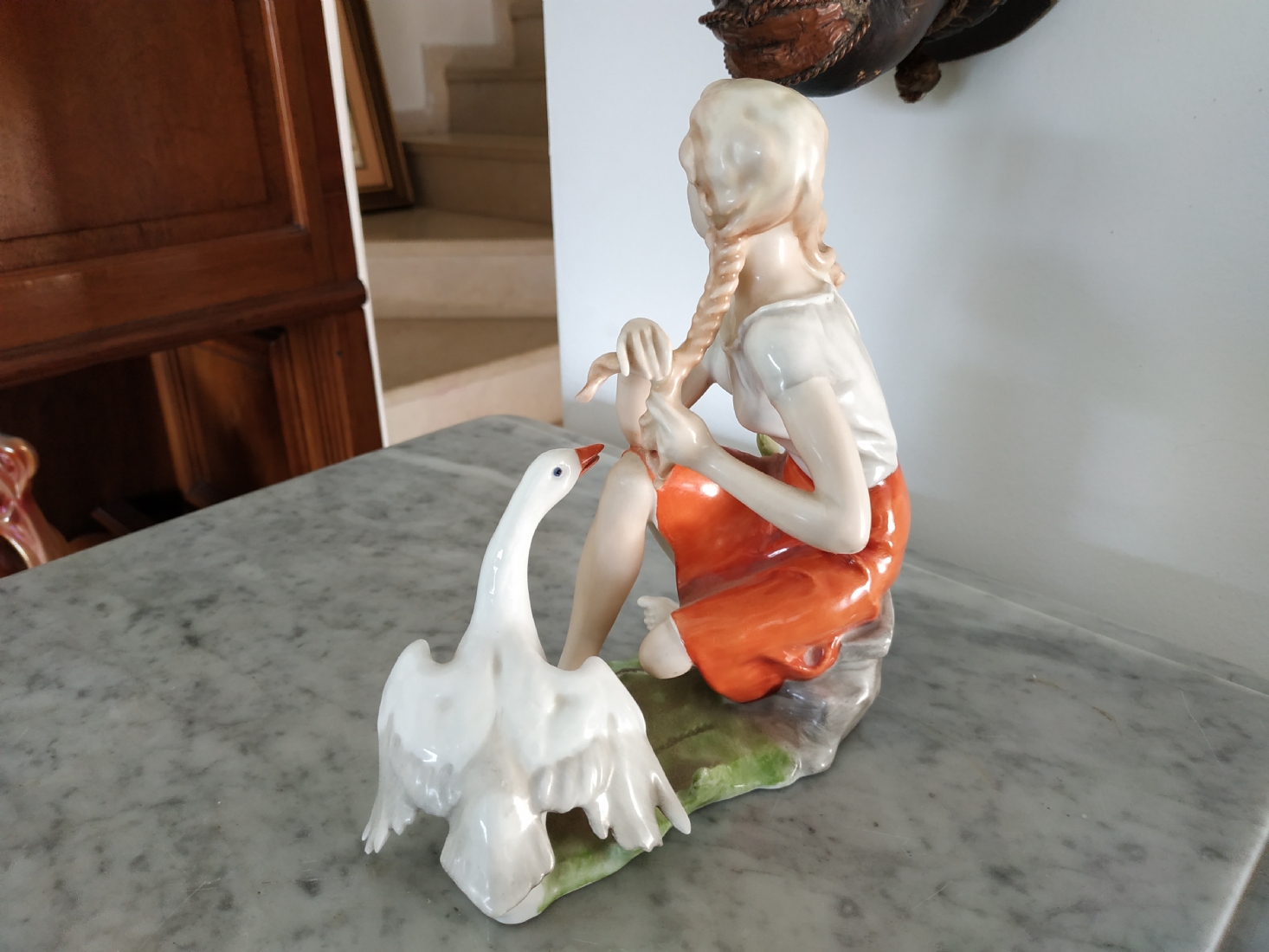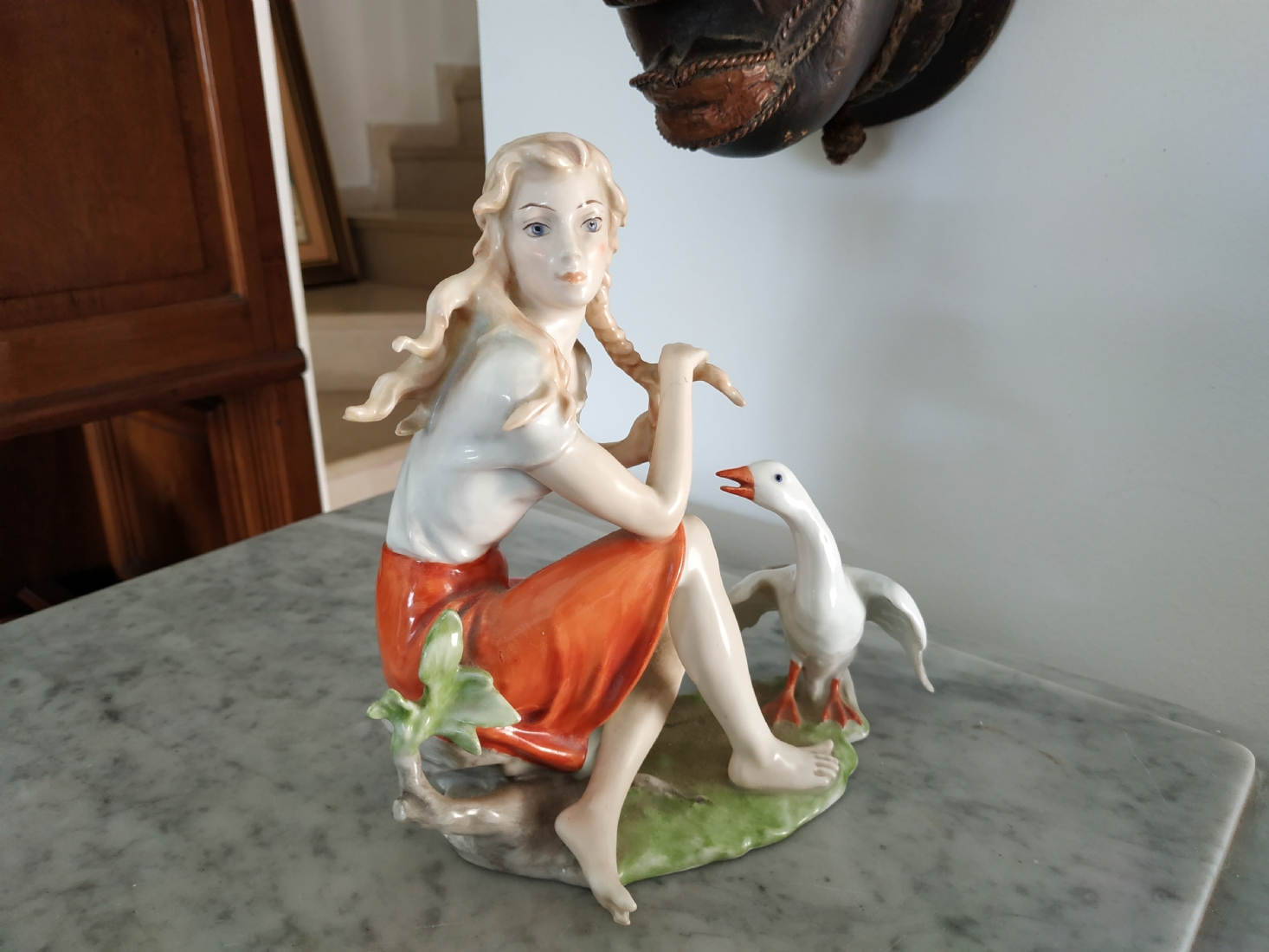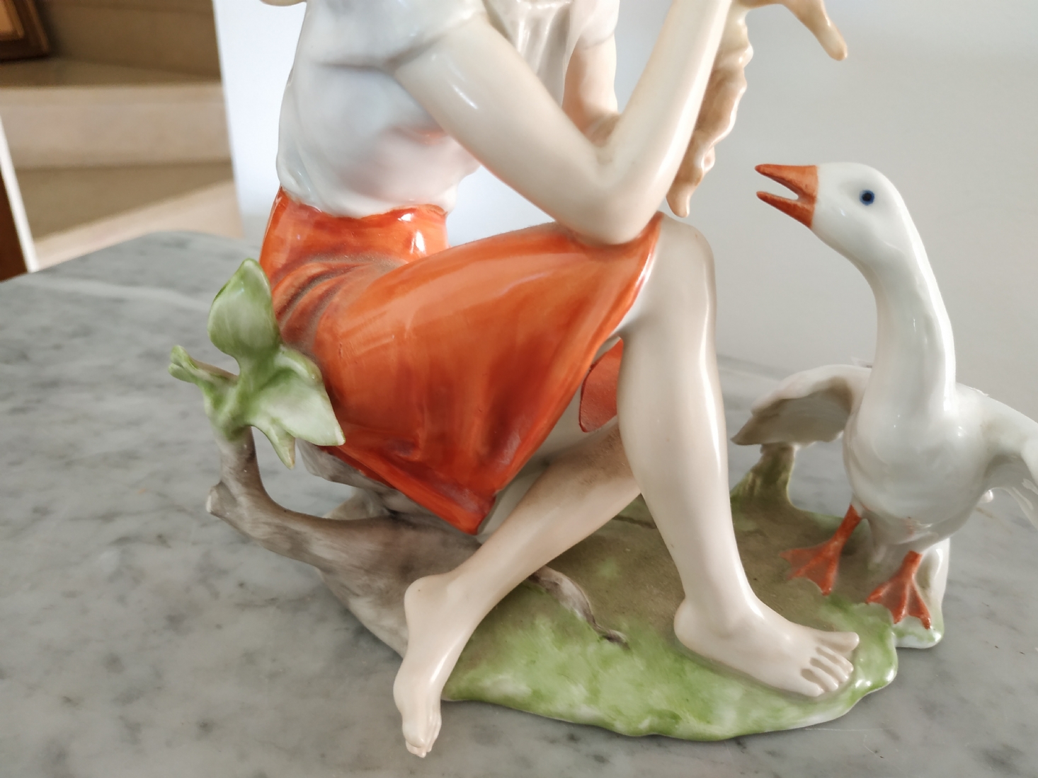 פסלון פורצלן גרמני ישן מתוצרת: 'Kaiser', בדמות נערה שחולמת לפרוץ כדוגמנית התתרנית הראשונה ולכבוש את מסלולי האופנה ואווז מעריץ - מעוטר בצביעת יד וחתום, רוחב: 16 ס"מ, גובה: 18 ס"מ.