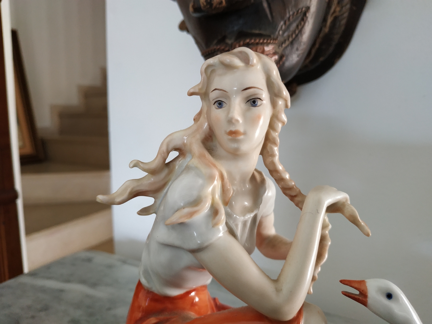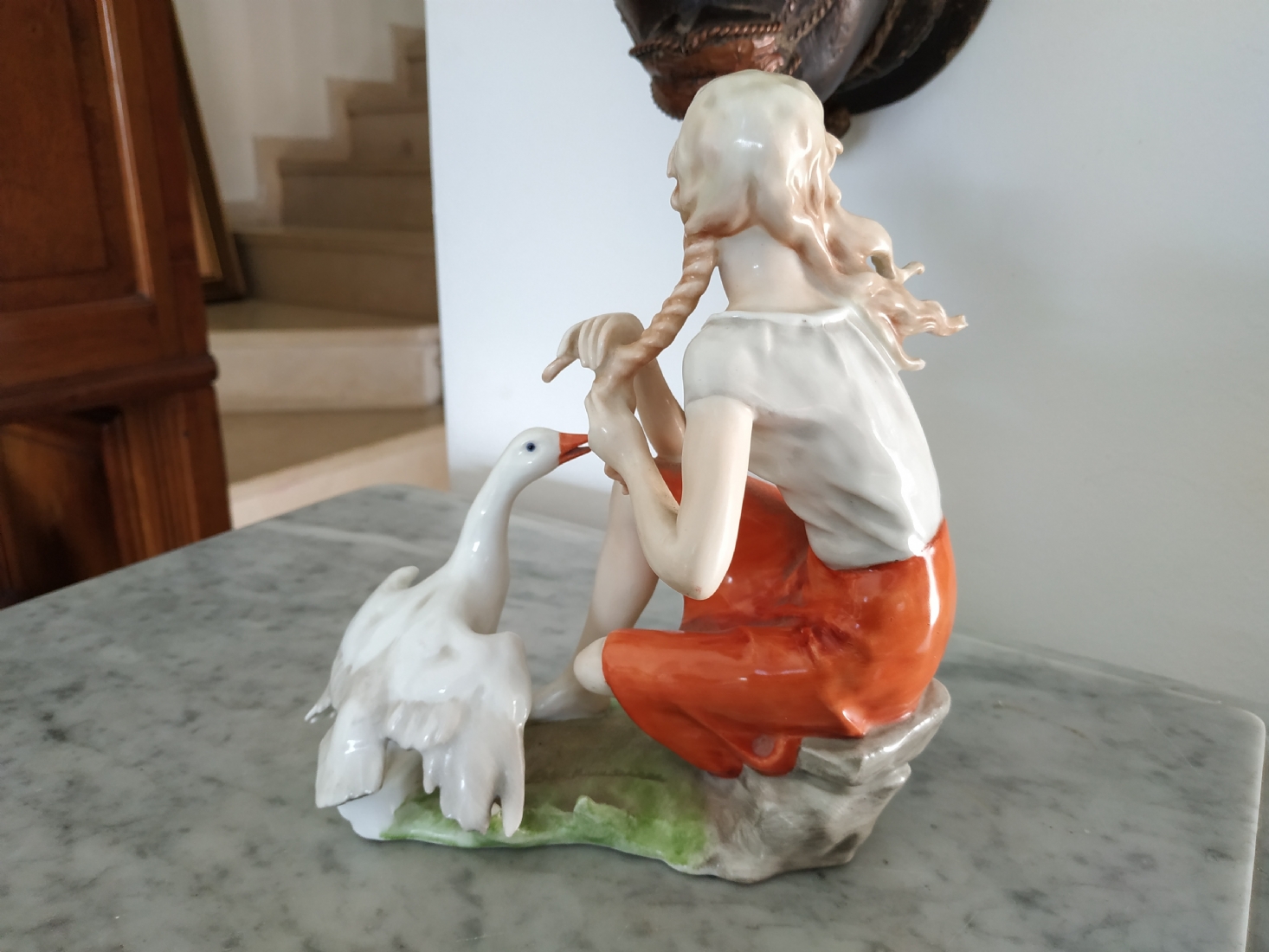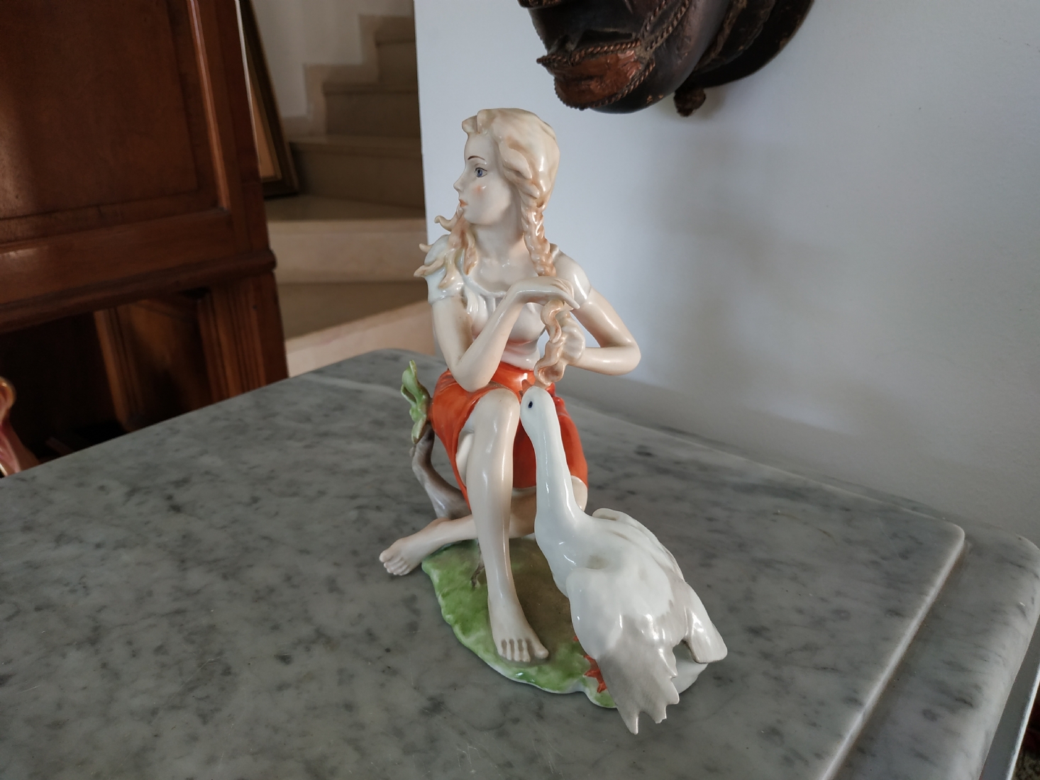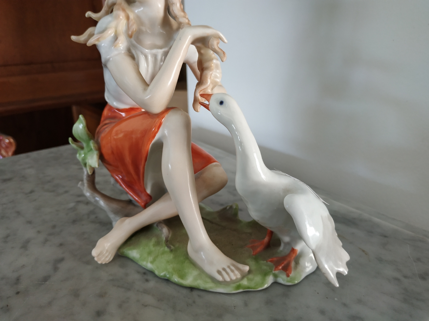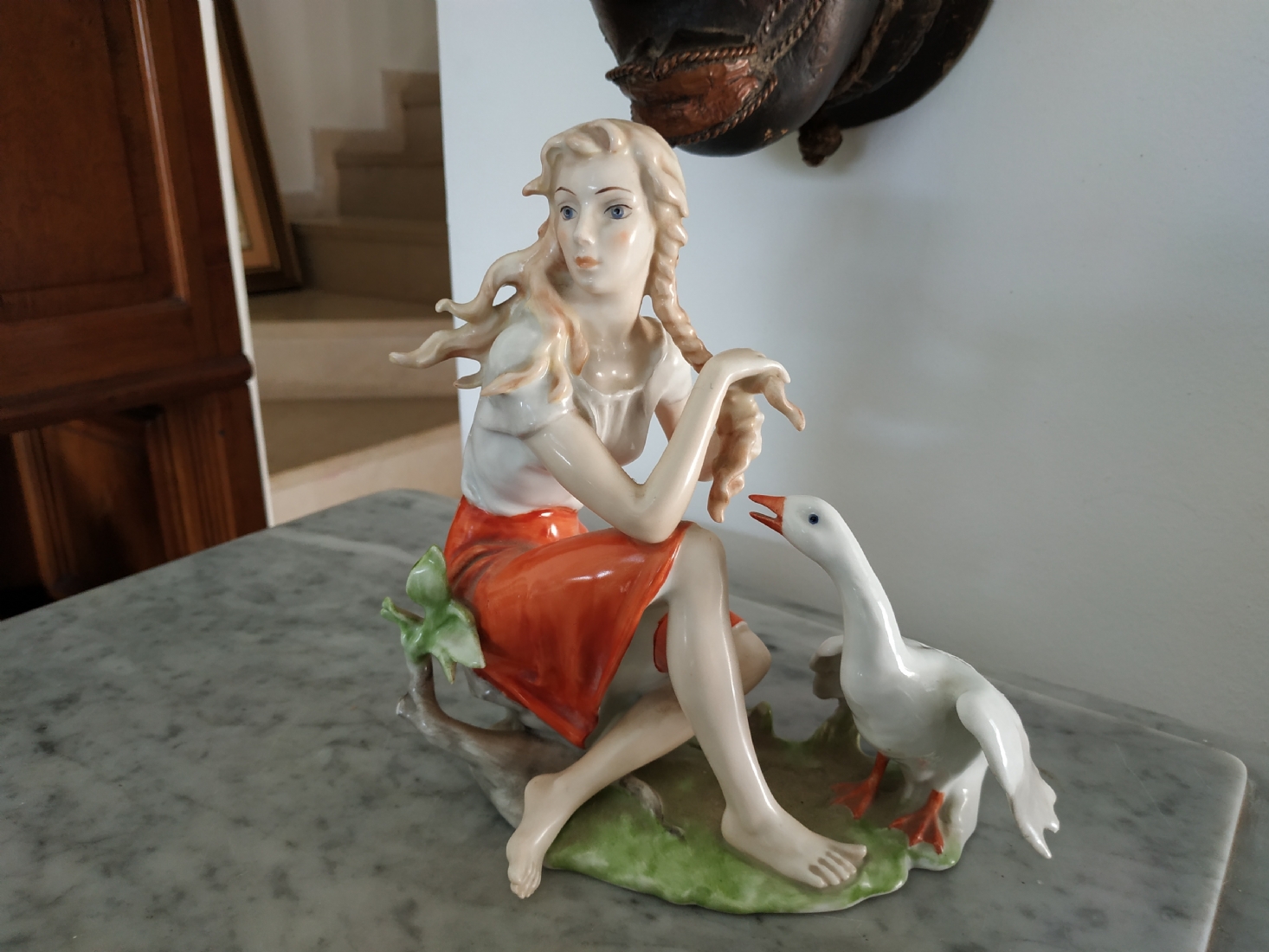 פסלון פורצלן גרמני ישן מתוצרת: 'Kaiser', בדמות נערה שחולמת לפרוץ כדוגמנית התתרנית הראשונה ולכבוש את מסלולי האופנה ואווז מעריץ - מעוטר בצביעת יד וחתום, רוחב: 16 ס"מ, גובה: 18 ס"מ.