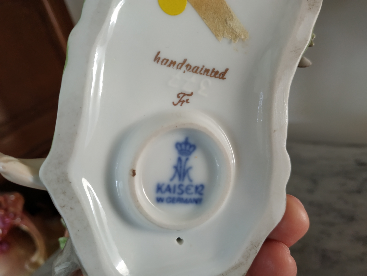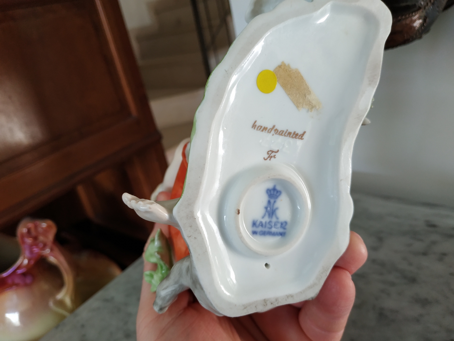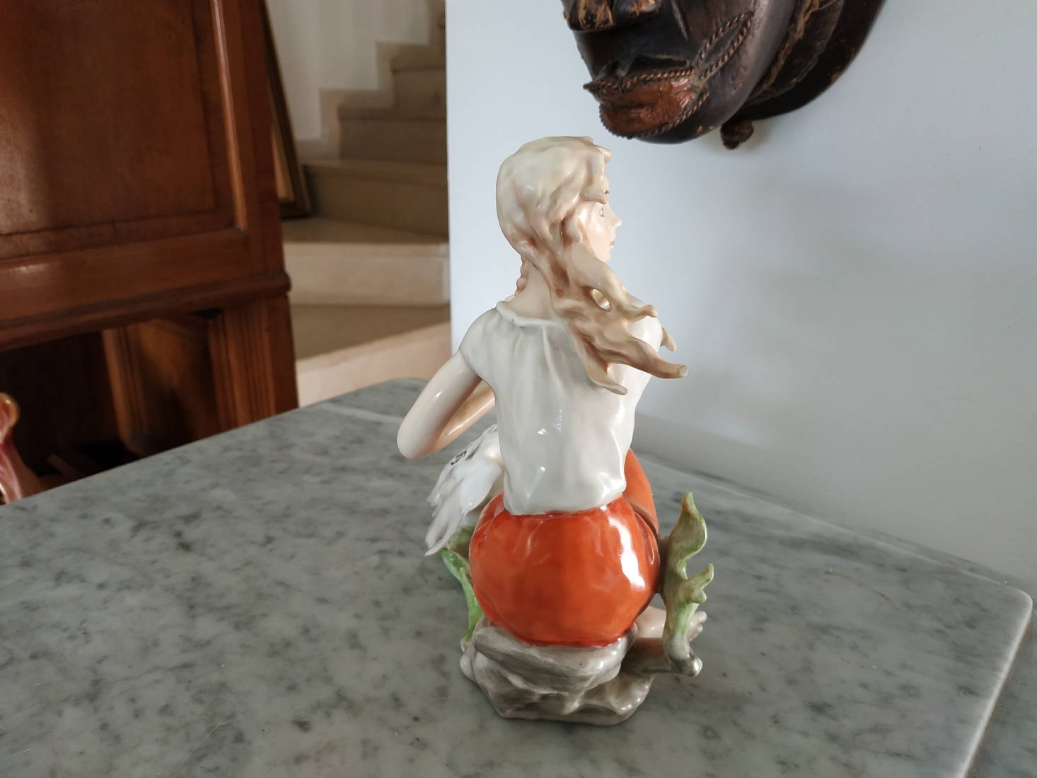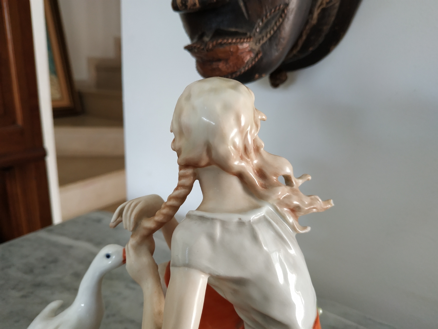 פסלון פורצלן גרמני ישן מתוצרת: 'Kaiser', בדמות נערה שחולמת לפרוץ כדוגמנית התתרנית הראשונה ולכבוש את מסלולי האופנה ואווז מעריץ - מעוטר בצביעת יד וחתום, רוחב: 16 ס"מ, גובה: 18 ס"מ.