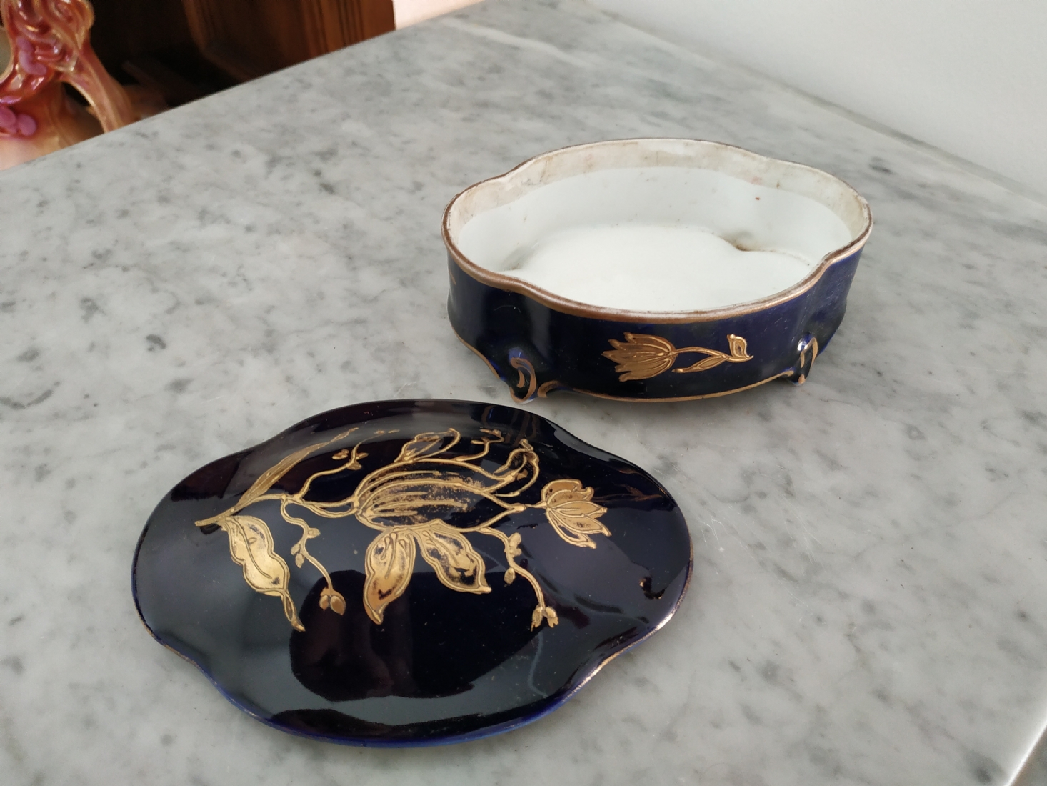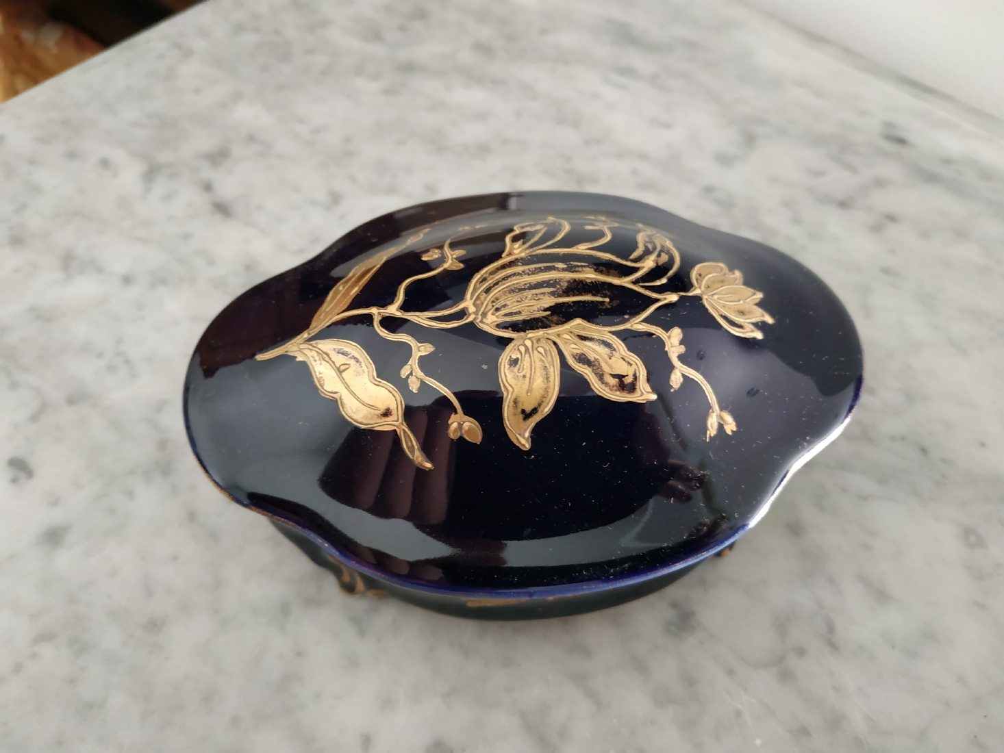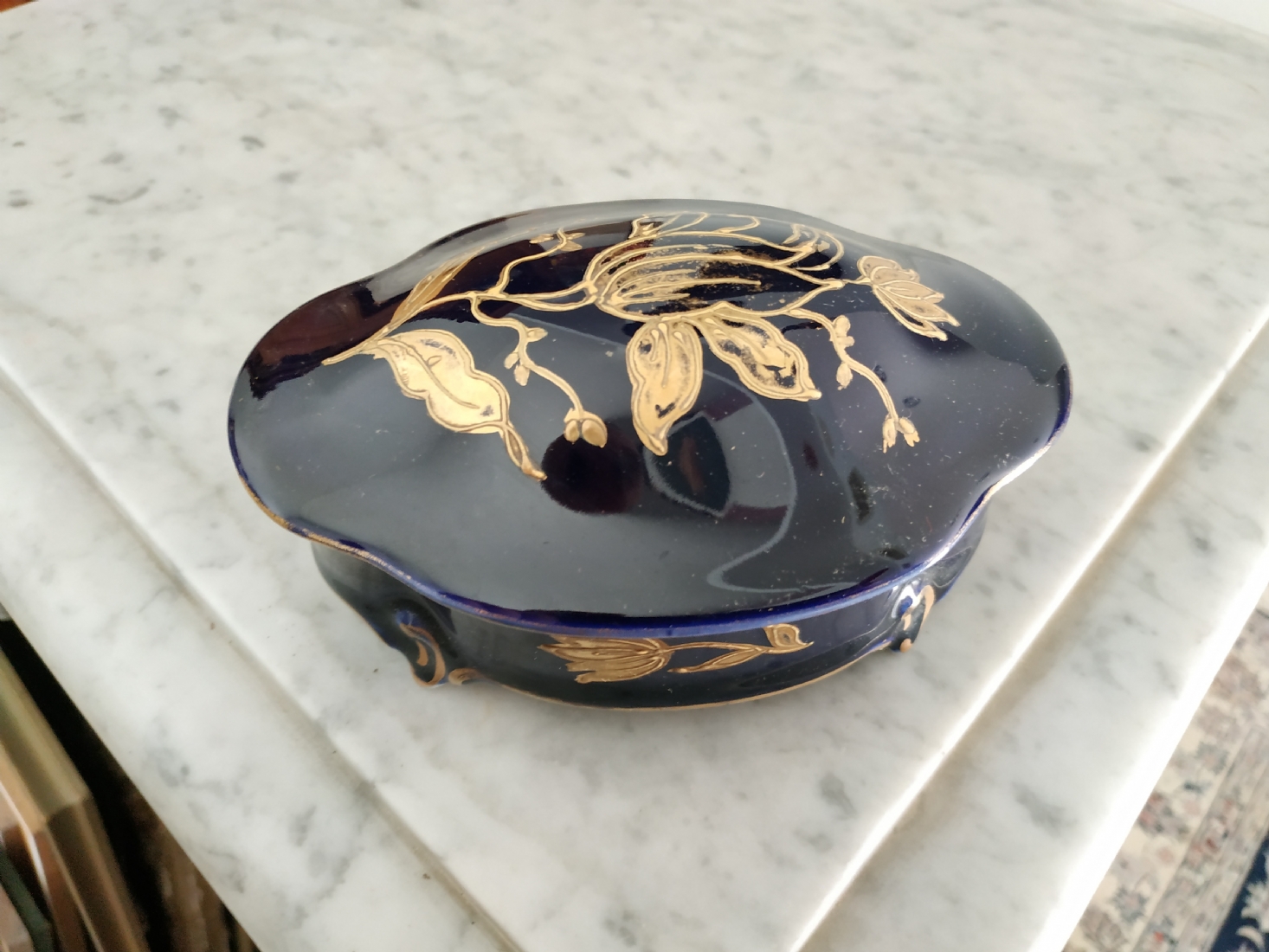 קופסת פורצלן גרמנית ישנה ומכסה תואם, מעוטרת בזהב על רקע קובלט כחול כהה, חתומה