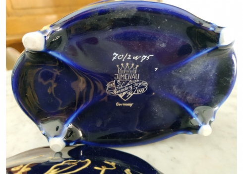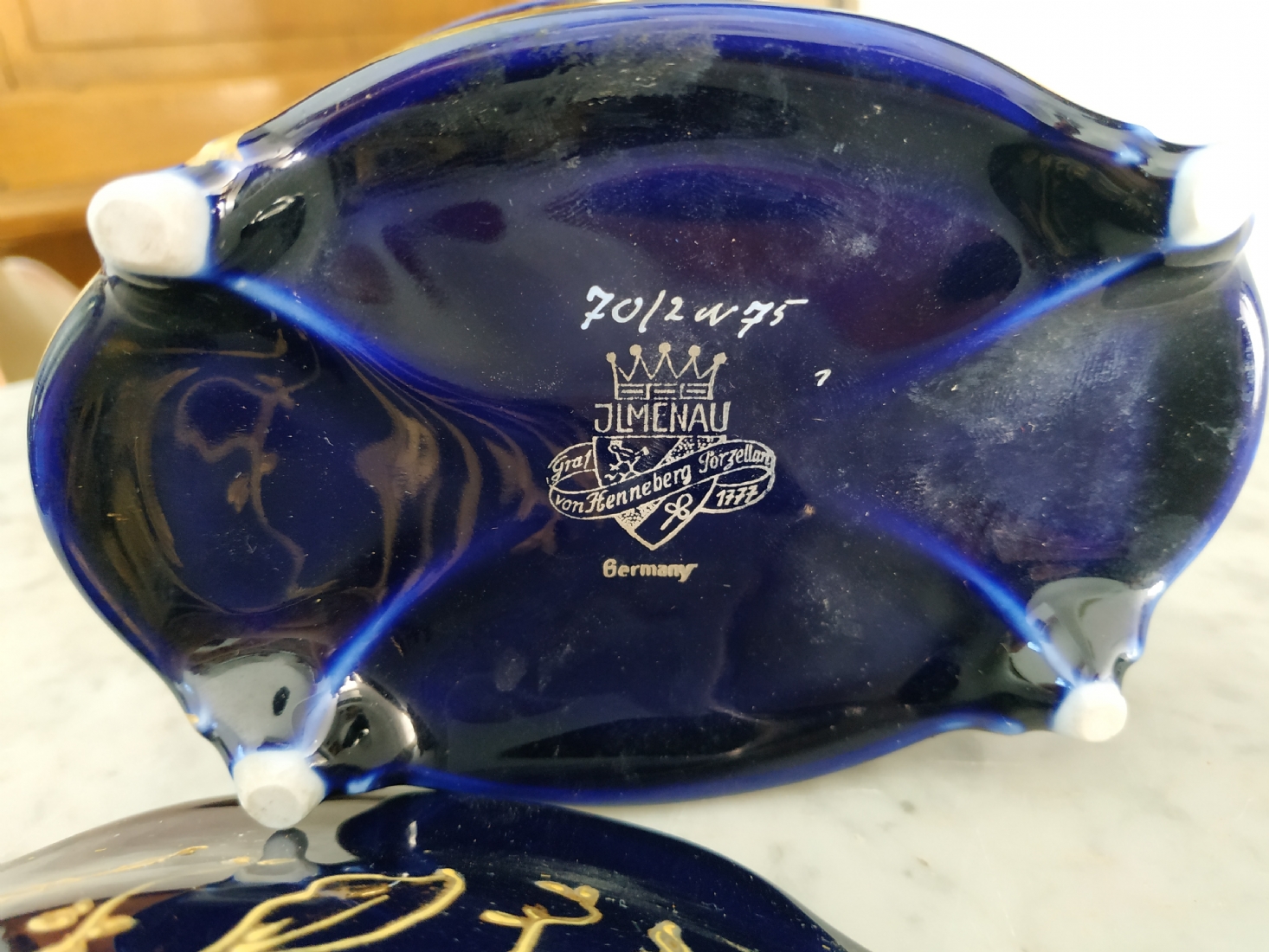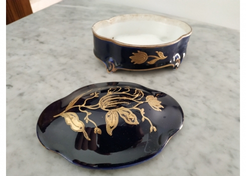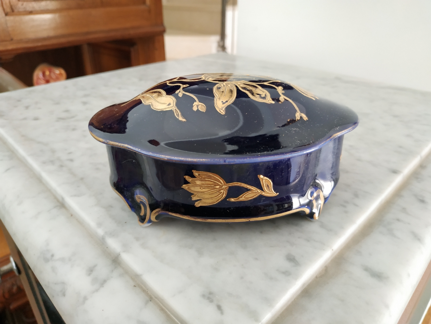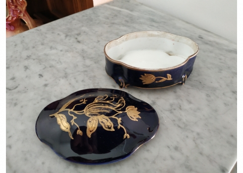 קופסת פורצלן גרמנית ישנה ומכסה תואם, מעוטרת בזהב על רקע קובלט כחול כהה, חתומה