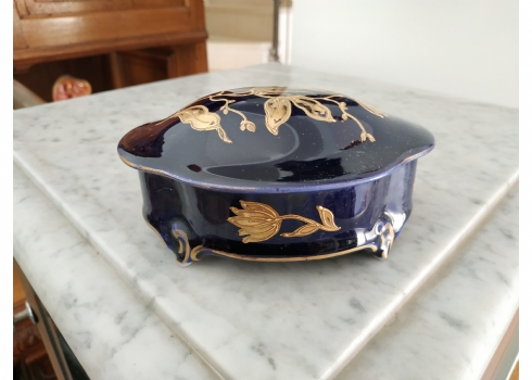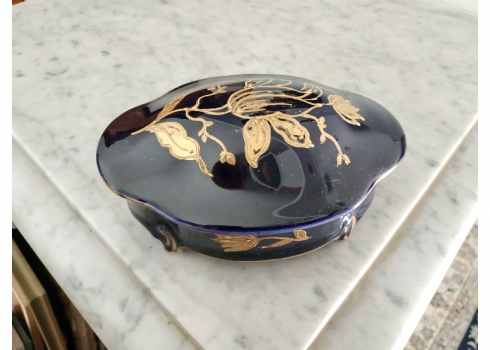קופסת פורצלן גרמנית ישנה ומכסה תואם, מעוטרת בזהב על רקע קובלט כחול כהה, חתומה, גובה כולל מכסה: 8 ס"מ, אורך: 14 ס"מ.