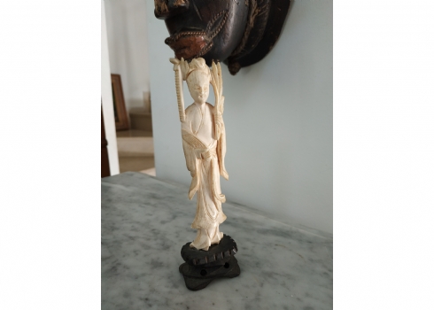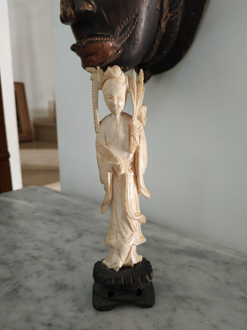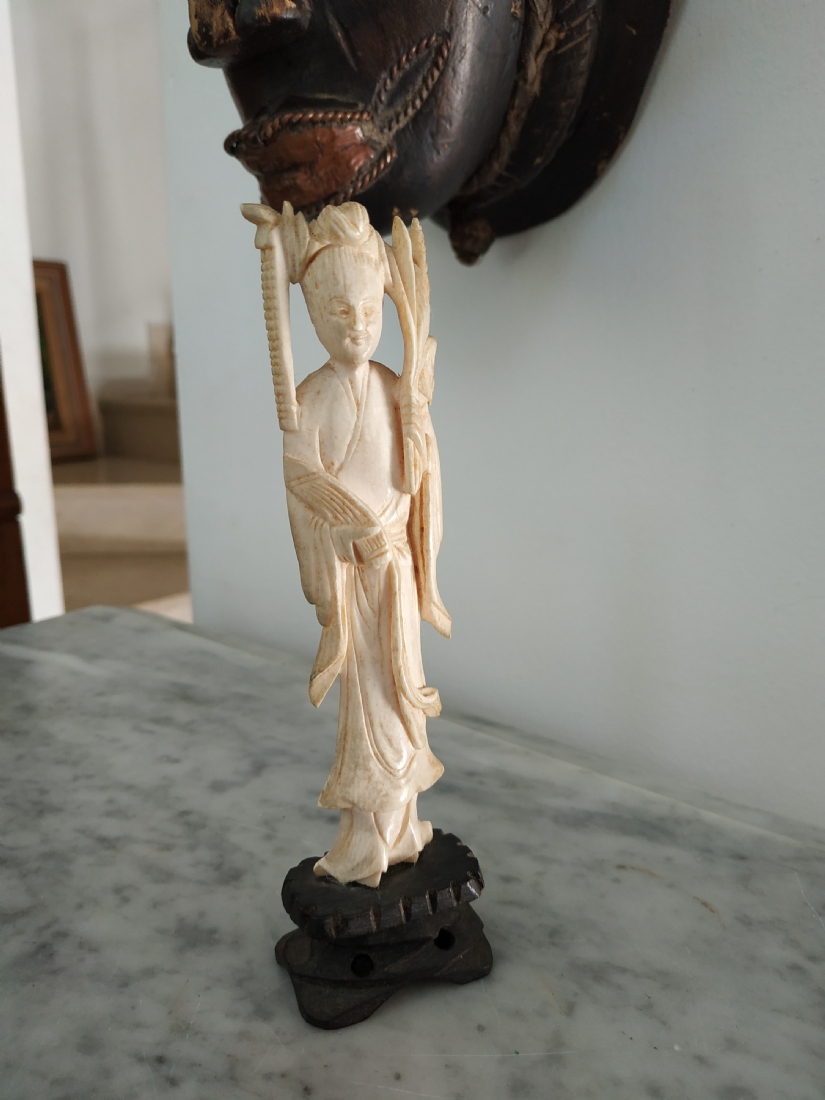 פסלון שנהב סיני ישן עשוי שן פיל ומגולף בעבודת יד, גובה כולל בסיס העץ: 15 ס"מ.