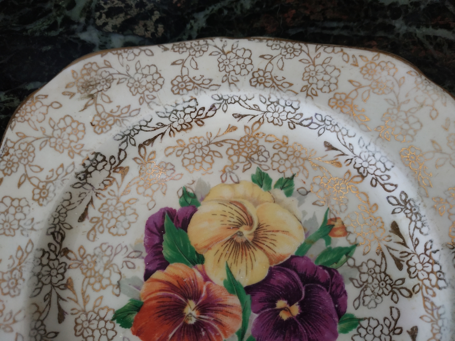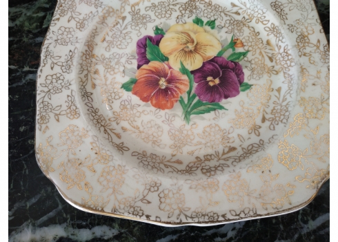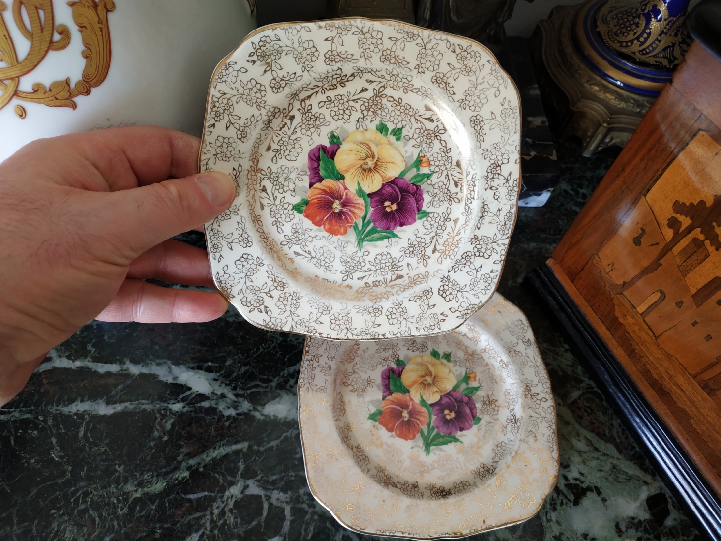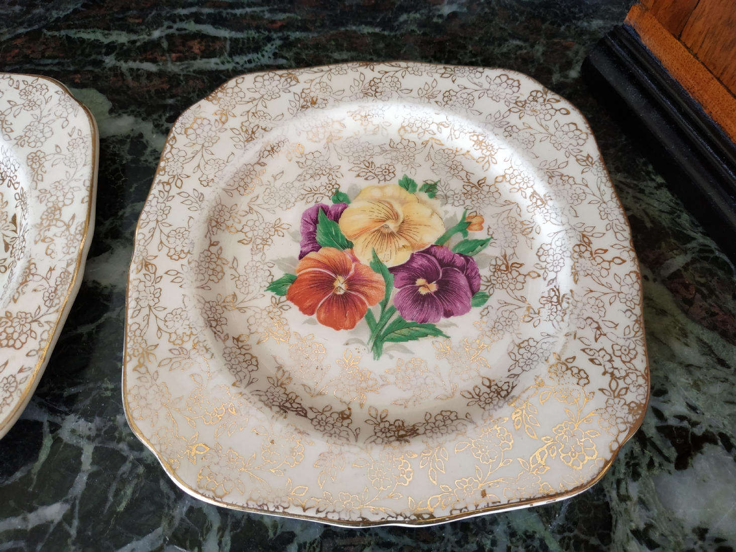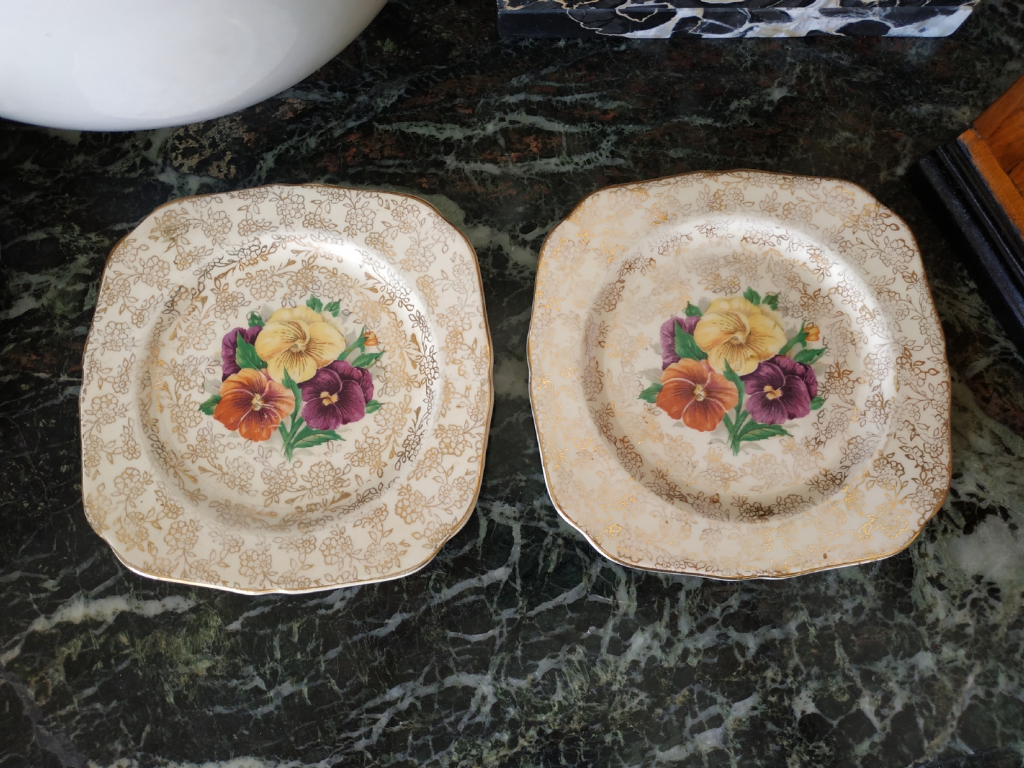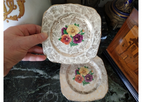 זוג צלחות עוגה אישיות, אנגליות, מוזהבות, מעוטרות בהדפס פרחוני של פרחי אמנון ותמר, חתומות, H&K Tunstall England, רוחב ואורך: 16 ס"מ.