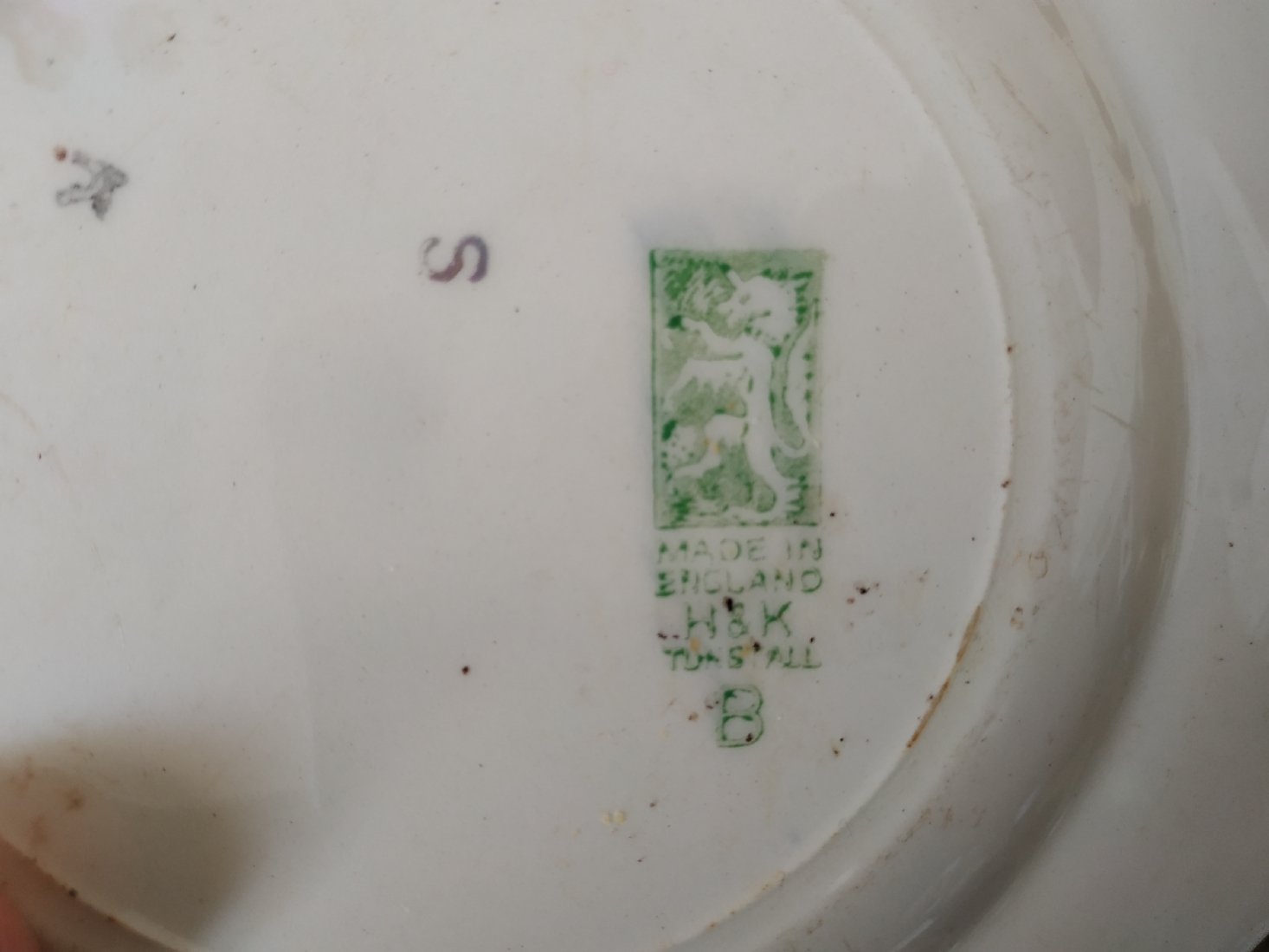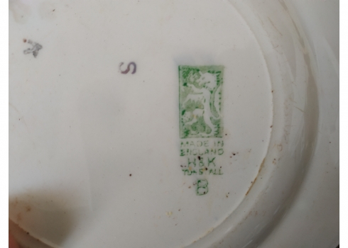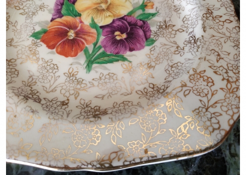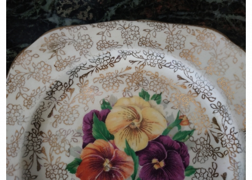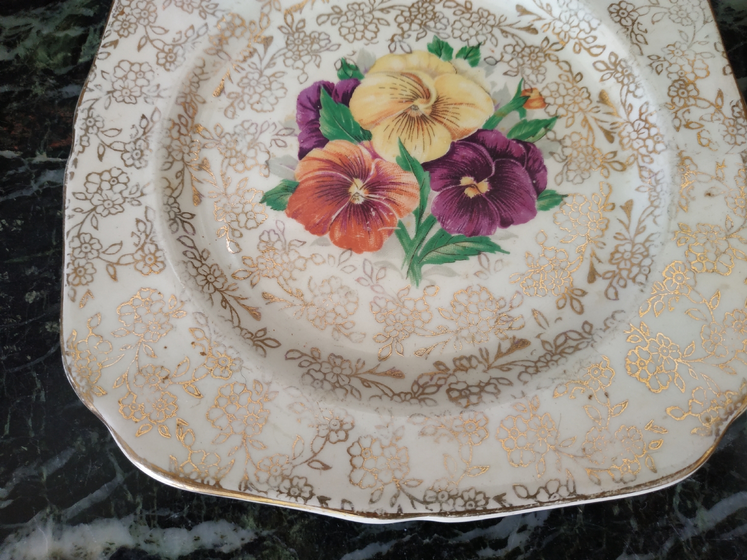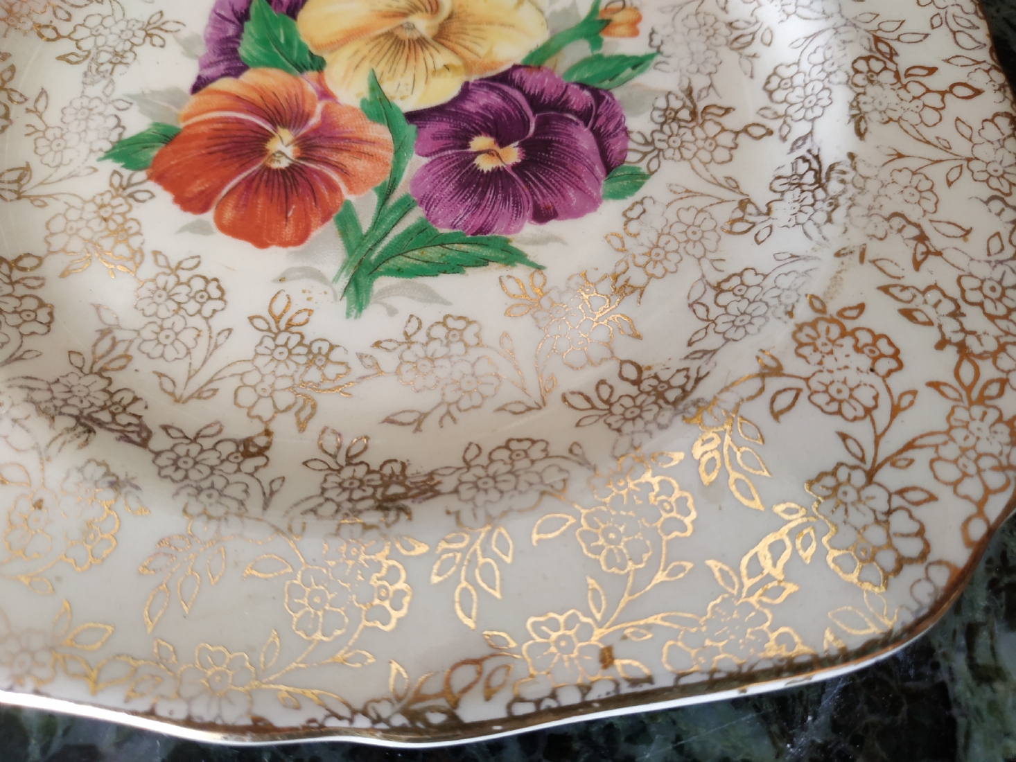 זוג צלחות עוגה אישיות, אנגליות, מוזהבות, מעוטרות בהדפס פרחוני של פרחי אמנון ותמר, חתומות, H&K Tunstall England, רוחב ואורך: 16 ס"מ.